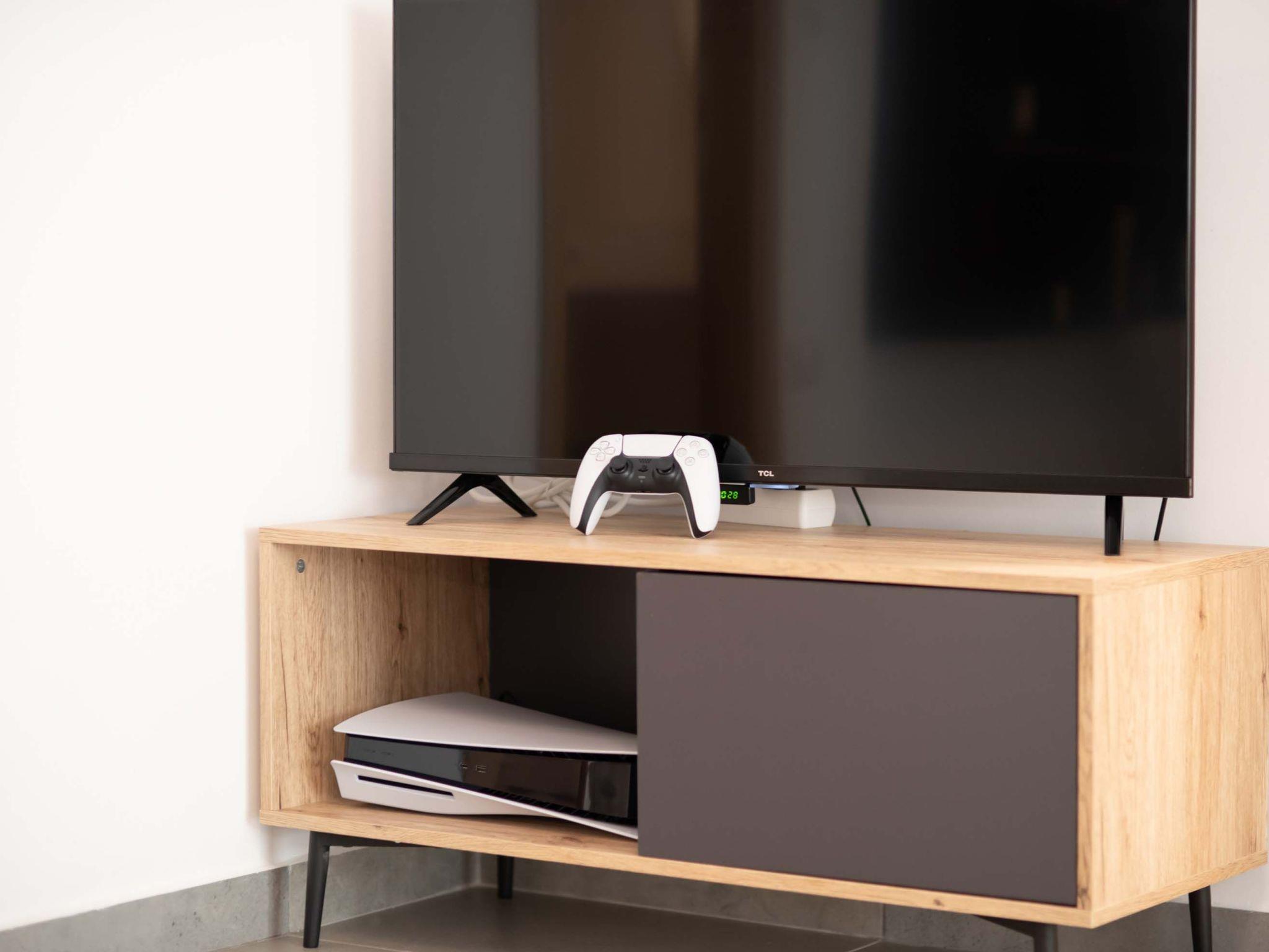 Living area with sofa, 40’’ Smart Satellite TV, Playstation 5 console