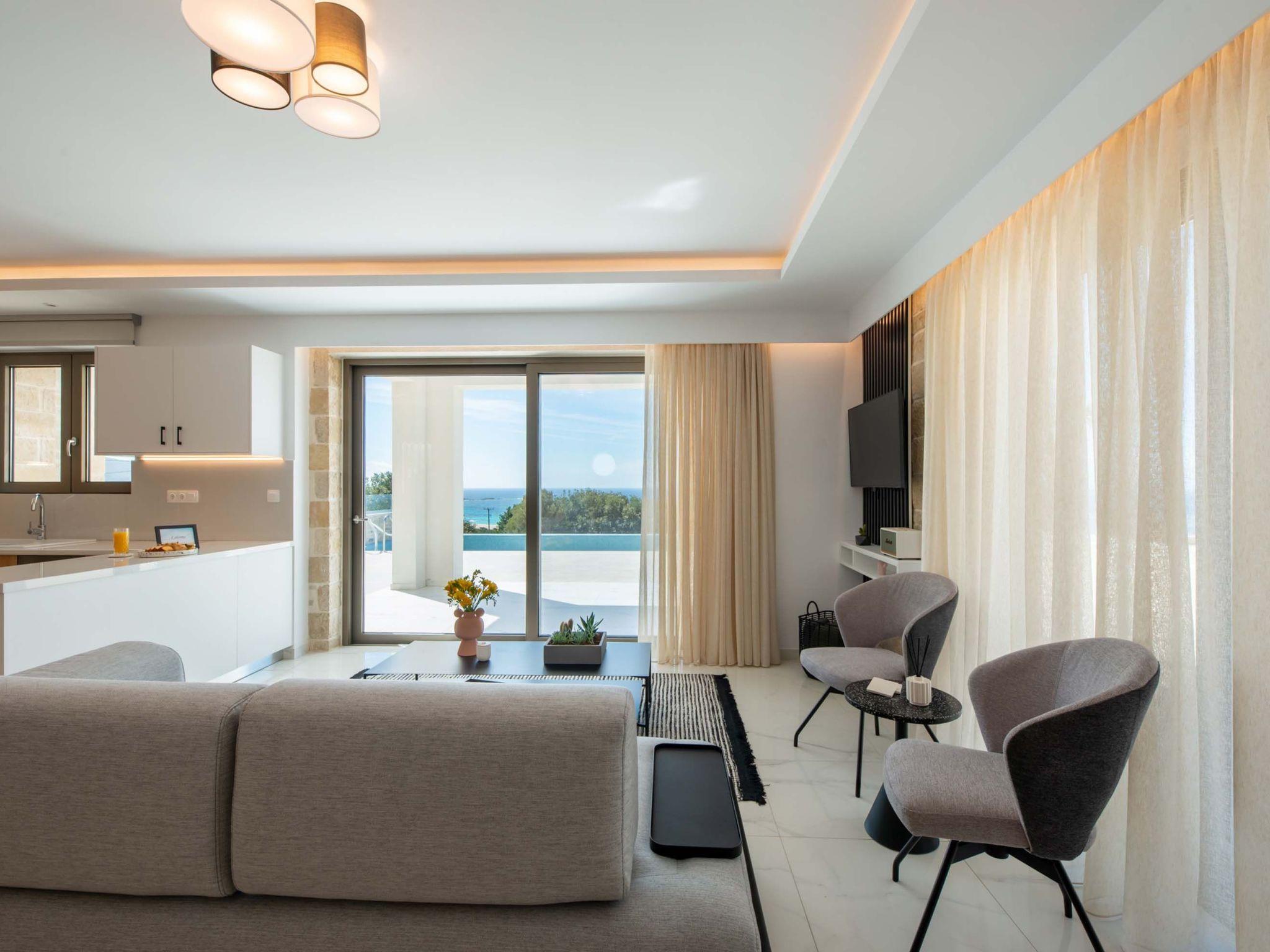 Living area with sofa, 43’’ satellite Smart TV, access to the pool terrace, sea view
