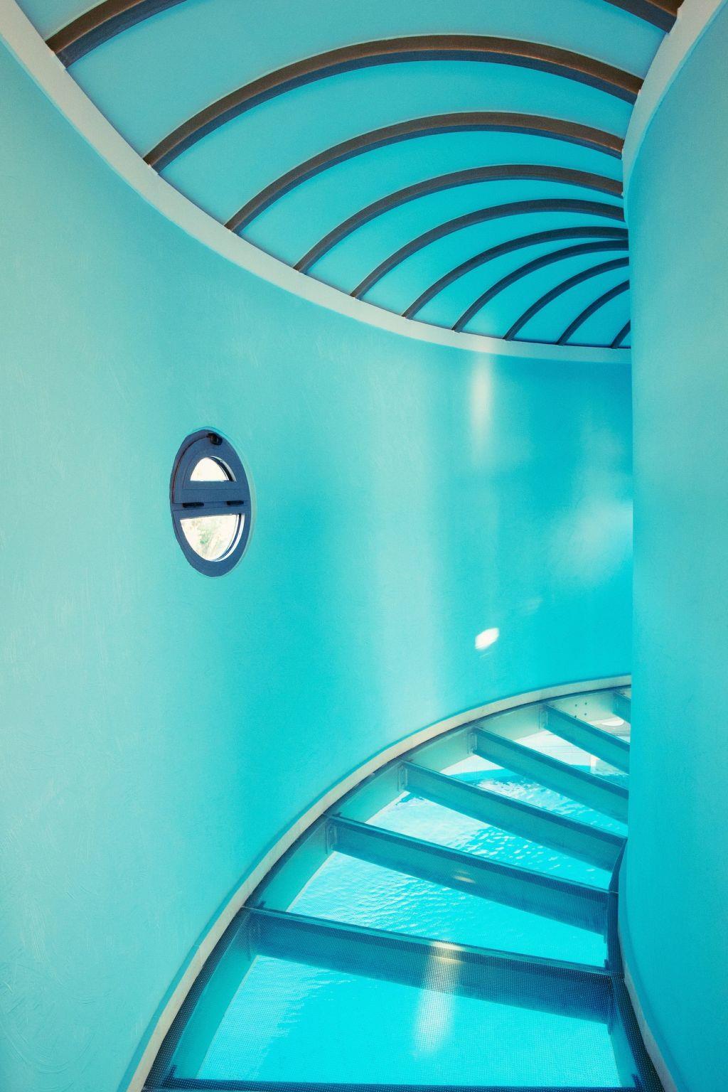 The pool splits the house in half and a glass corridor connects the living room area to the bedrooms and the rest of the house. The corridor, as a bridge, is placed over the pool and allows the Illumination from the water to light up the house in a truly unique way. Imagine it during the night, with the pool lights changing colors! Difficult to describe yet amazing to view!!! Light toned walls and modern design furniture provide an atmosphere of luxury and relaxation and the numerous large windows allow the light to enter offering beautiful views of the olive grove and the sea.
