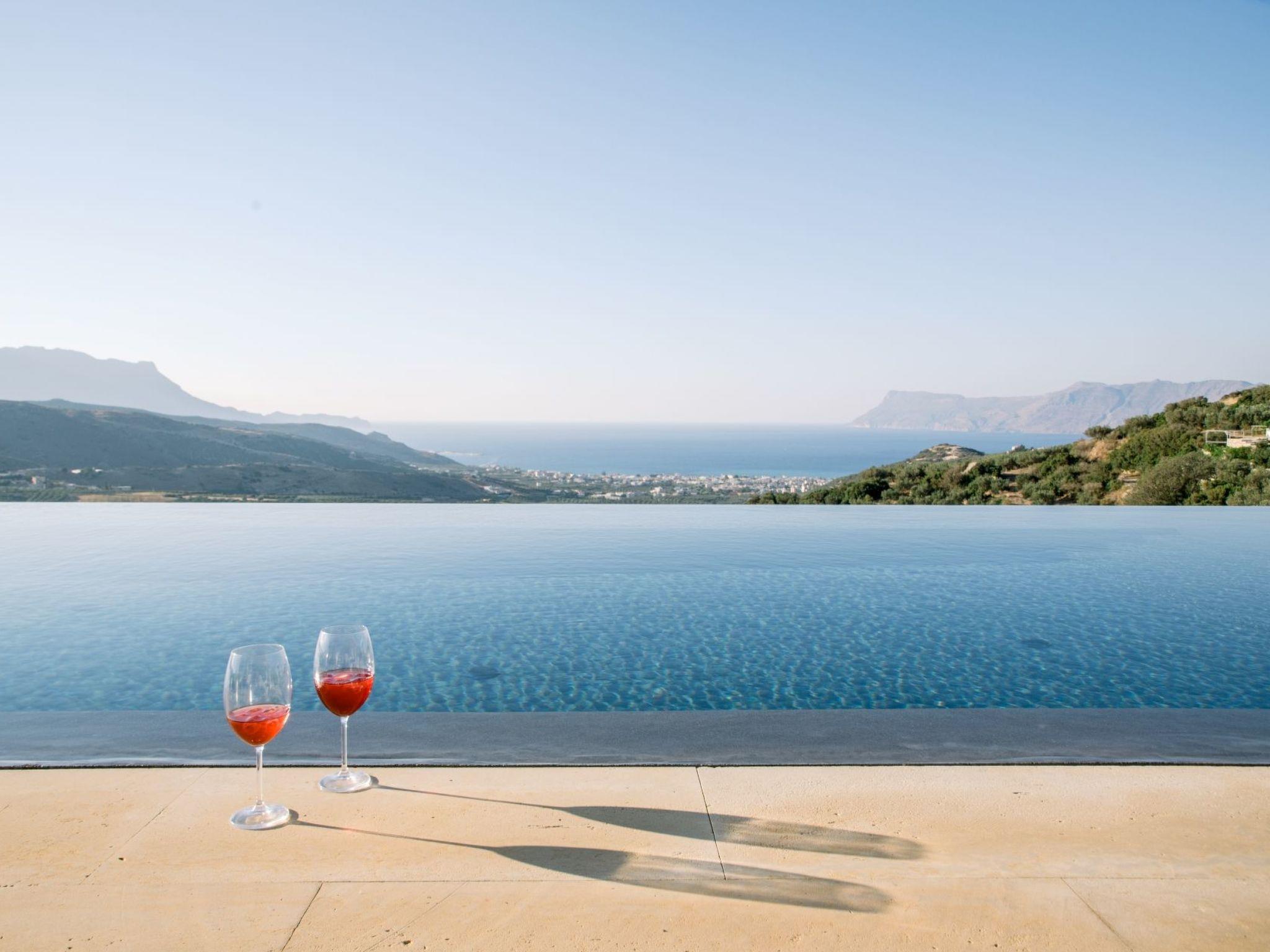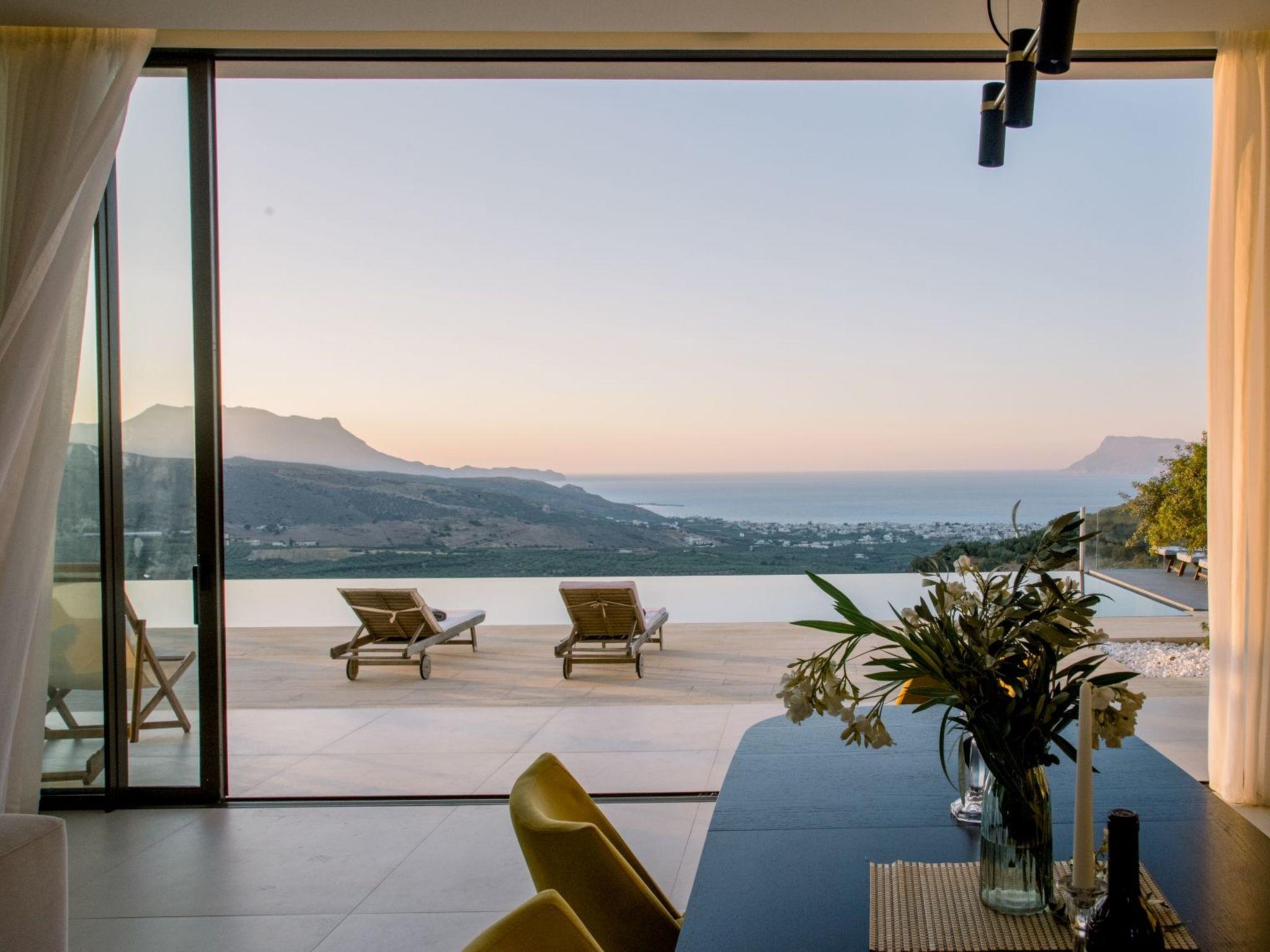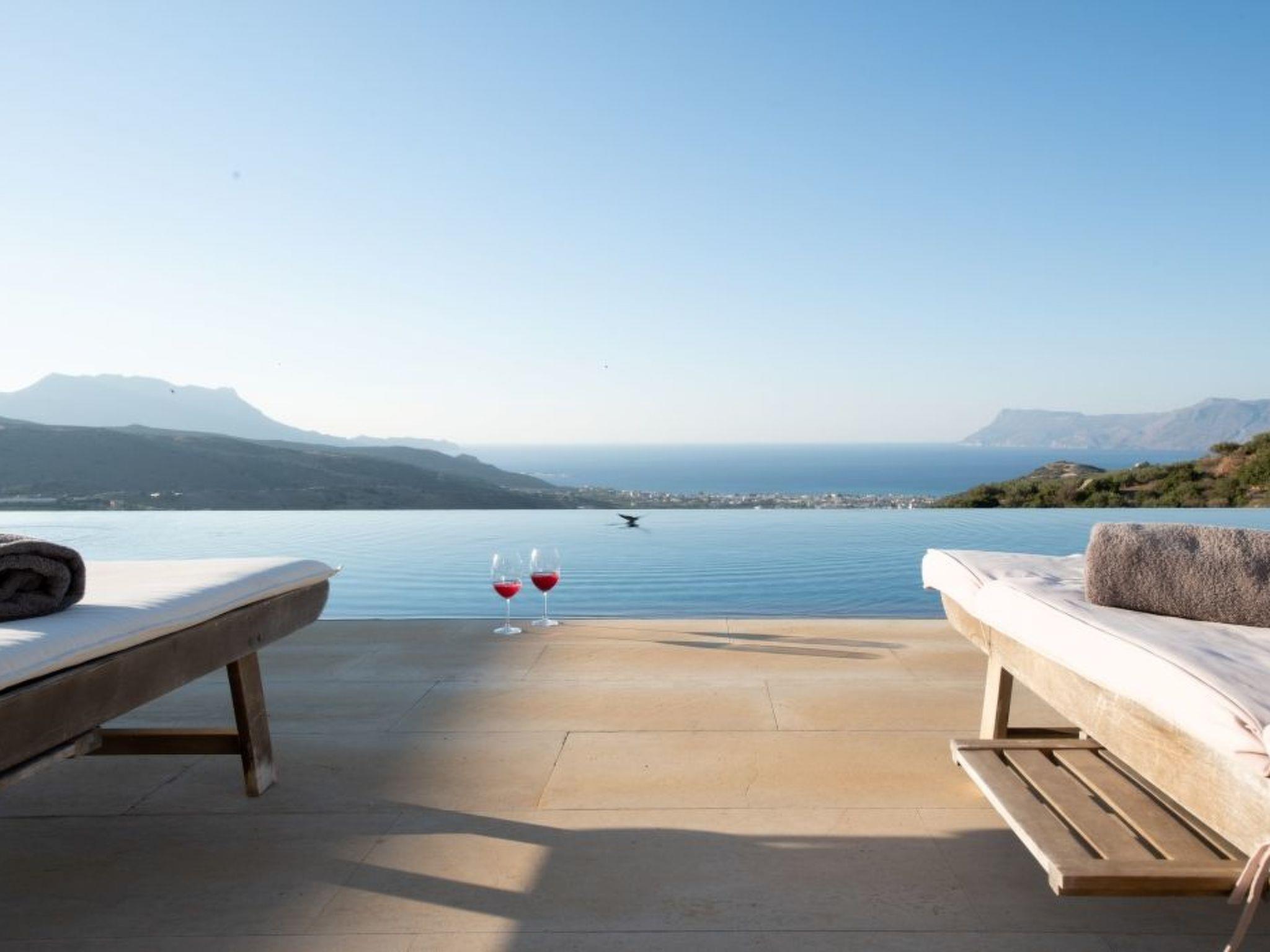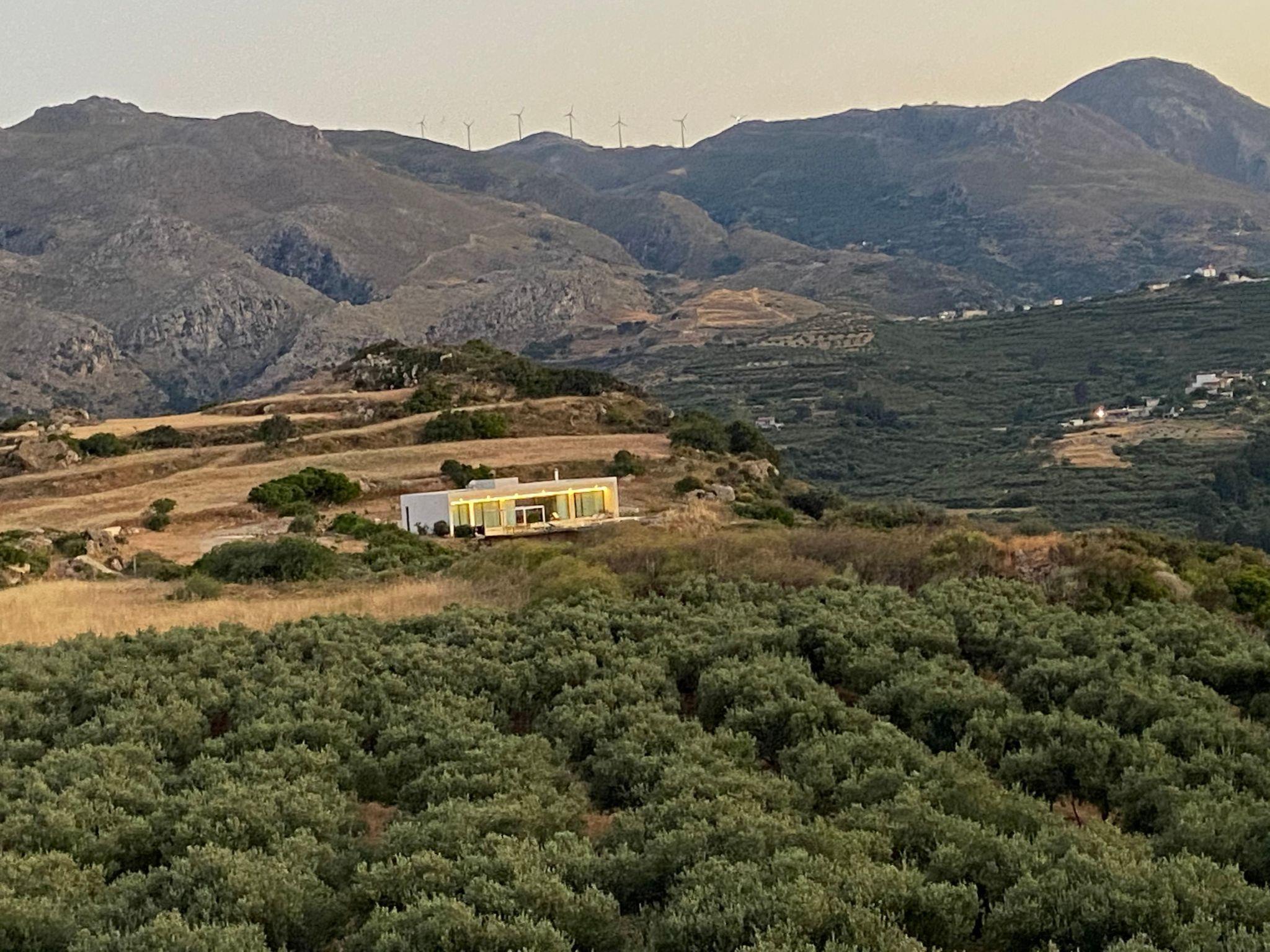 The property has 8000 m² and is situated on the hill in front of Kissamos on an extraordinary place in the North-West of Crete. It is on a archeological site which is going back to 500 bc. It has an bright view to the ocean and is surrounded by magnific mountains and important antique villages which you can see by birdeye view. With this unique view you get the feeling of having the possibility to fly directly to the beach. The property is in the heart of the landscape. You can enjoy undisturbing walks in the nature and between olive trees. The building has 3 bedrooms, 3 bathrooms and a large living room with open plan kitchen and a fireplace. All the windows are in front of the infinity pool and the amazing landscape. All materials and furnitures are of high quality.