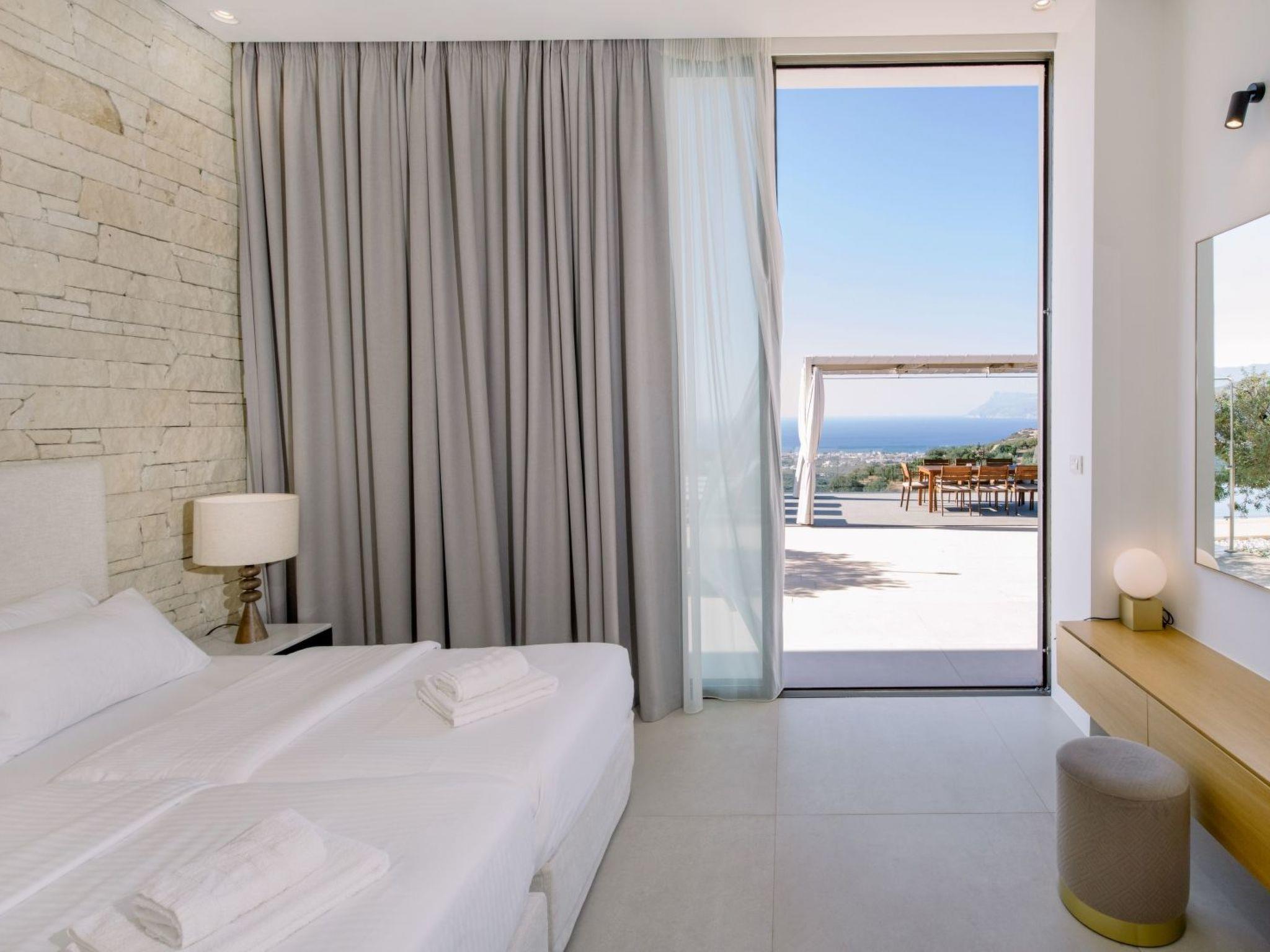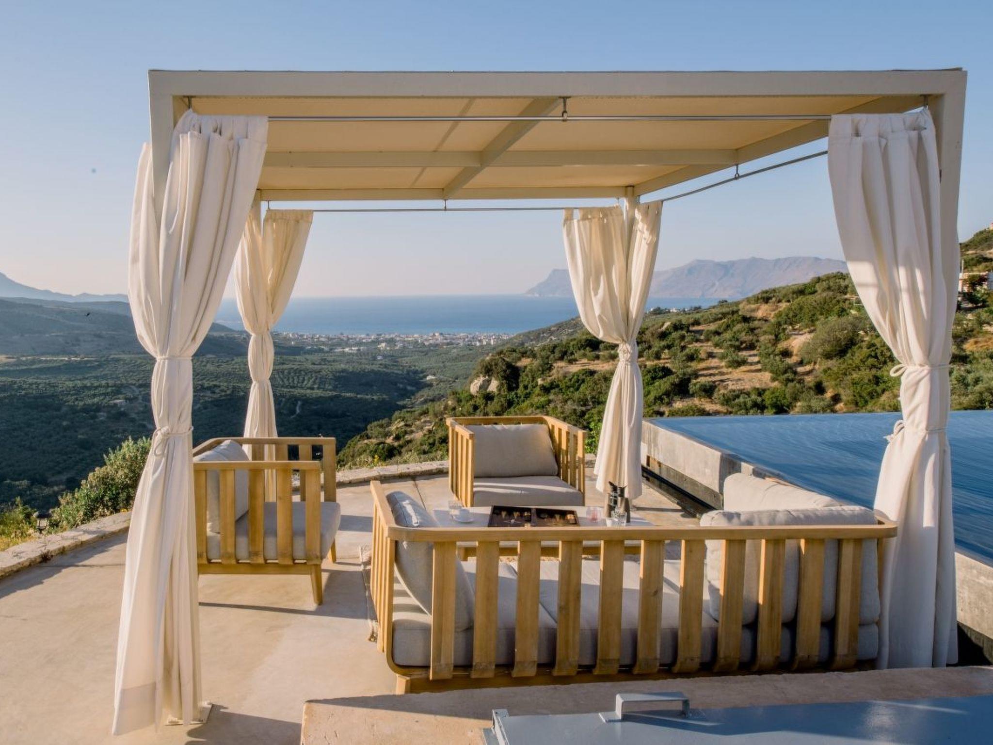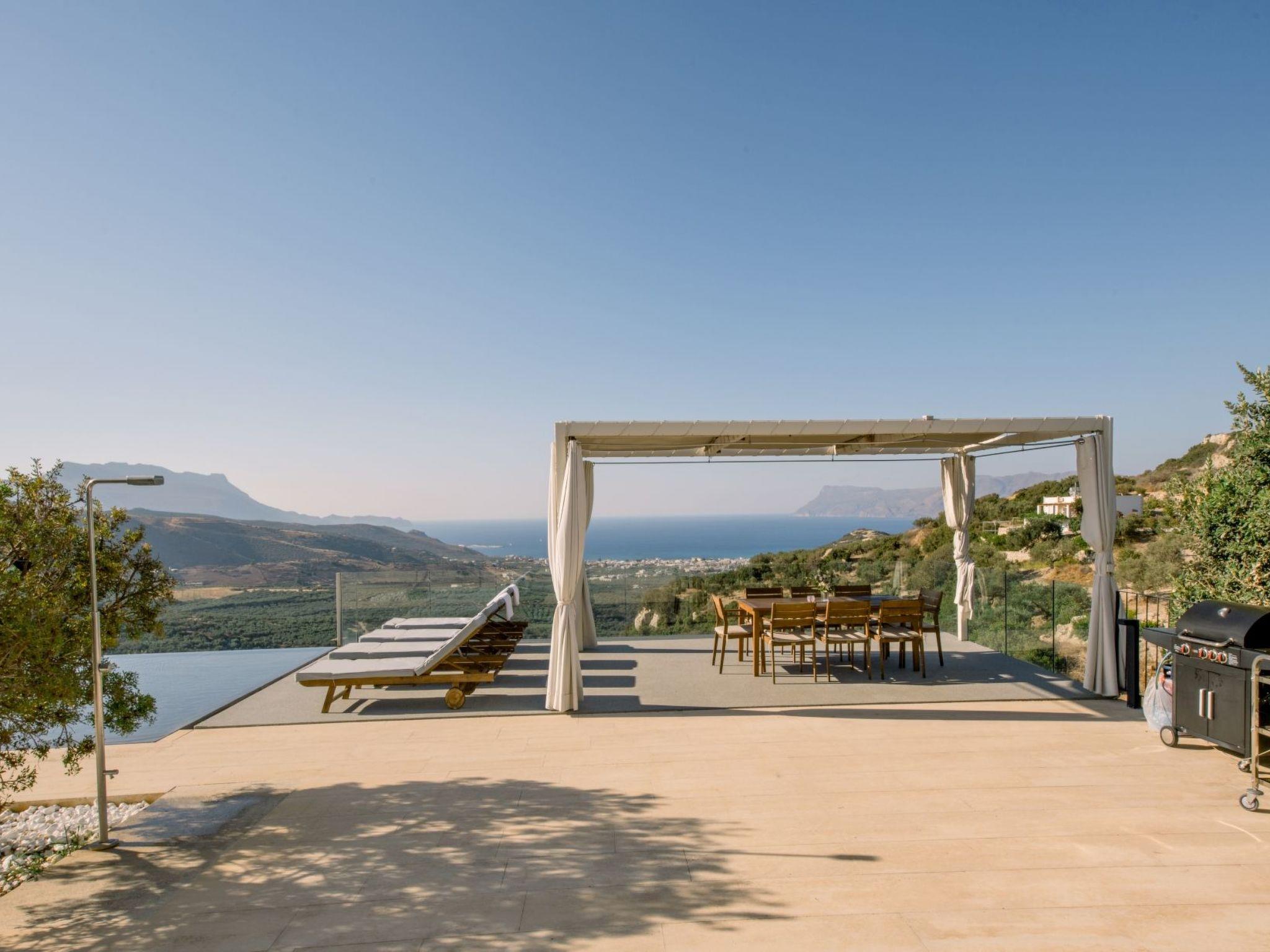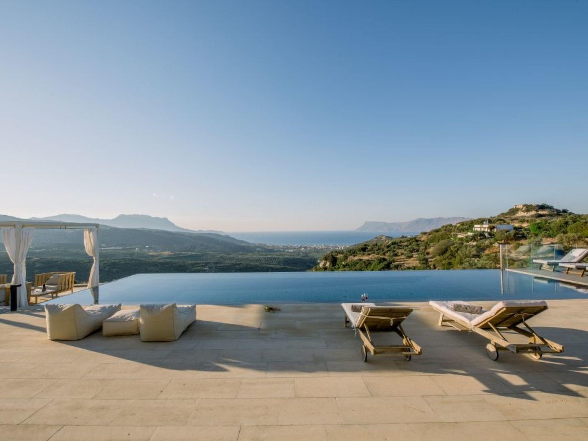 The property has 8000 m² and is situated on the hill in front of Kissamos on an extraordinary place in the North-West of Crete. It is on a archeological site which is going back to 500 bc. It has an bright view to the ocean and is surrounded by magnific mountains and important antique villages which you can see by birdeye view. With this unique view you get the feeling of having the possibility to fly directly to the beach. The property is in the heart of the landscape. You can enjoy undisturbing walks in the nature and between olive trees. The building has 3 bedrooms, 3 bathrooms and a large living room with open plan kitchen and a fireplace. All the windows are in front of the infinity pool and the amazing landscape. All materials and furnitures are of high quality.
