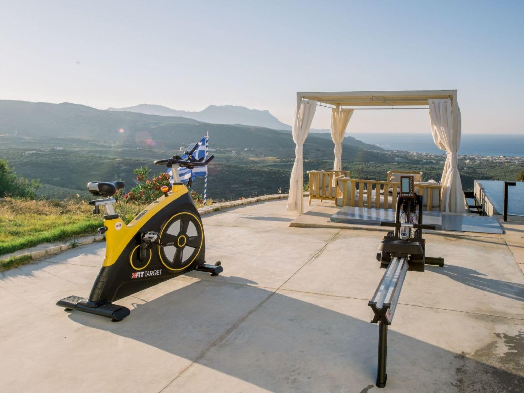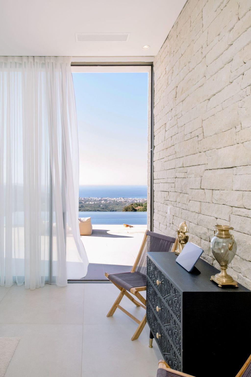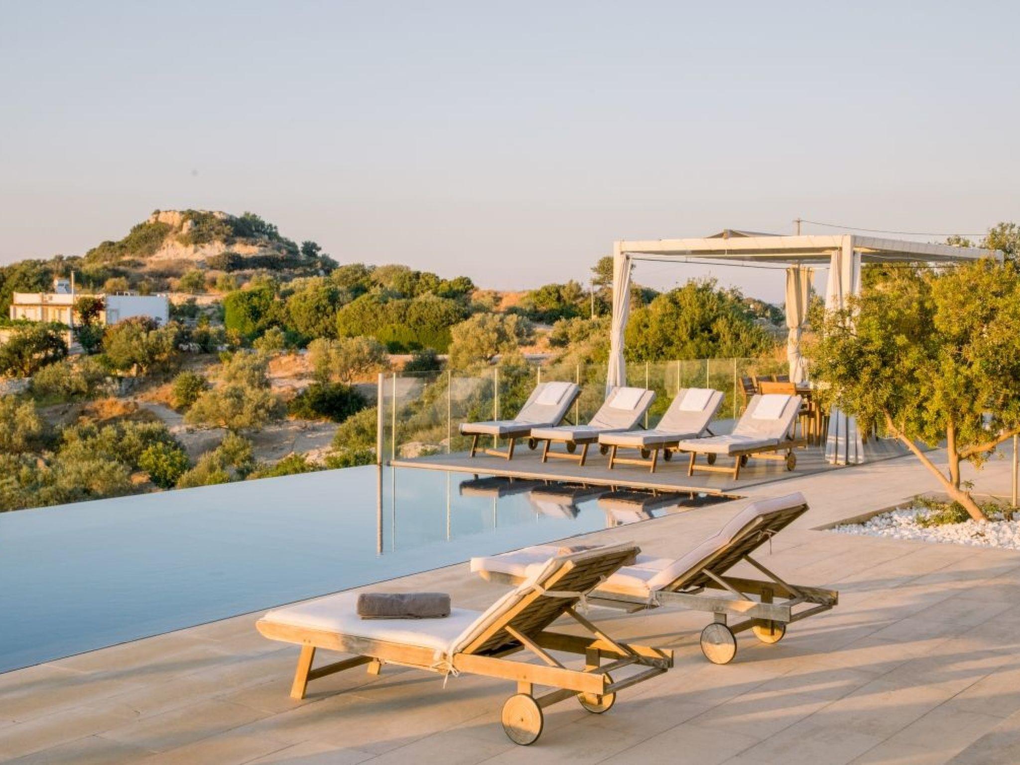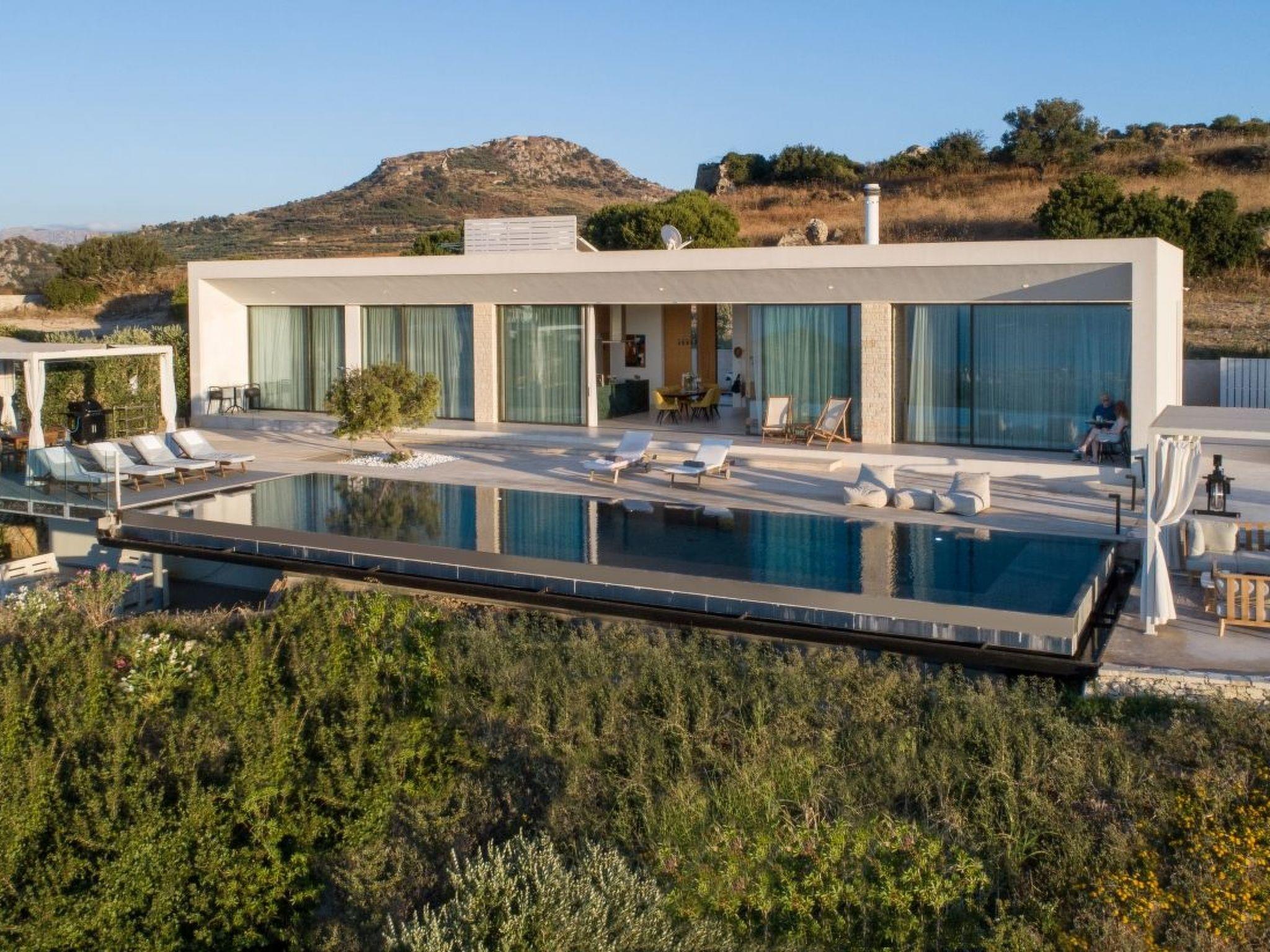 The property has 8000 m² and is situated on the hill in front of Kissamos on an extraordinary place in the North-West of Crete. It is on a archeological site which is going back to 500 bc. It has an bright view to the ocean and is surrounded by magnific mountains and important antique villages which you can see by birdeye view. With this unique view you get the feeling of having the possibility to fly directly to the beach. The property is in the heart of the landscape. You can enjoy undisturbing walks in the nature and between olive trees. The building has 3 bedrooms, 3 bathrooms and a large living room with open plan kitchen and a fireplace. All the windows are in front of the infinity pool and the amazing landscape. All materials and furnitures are of high quality.