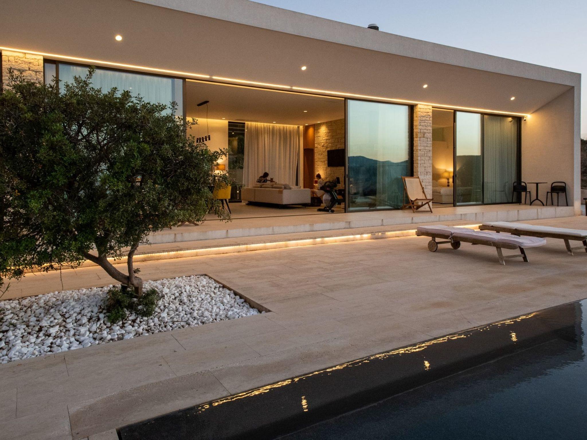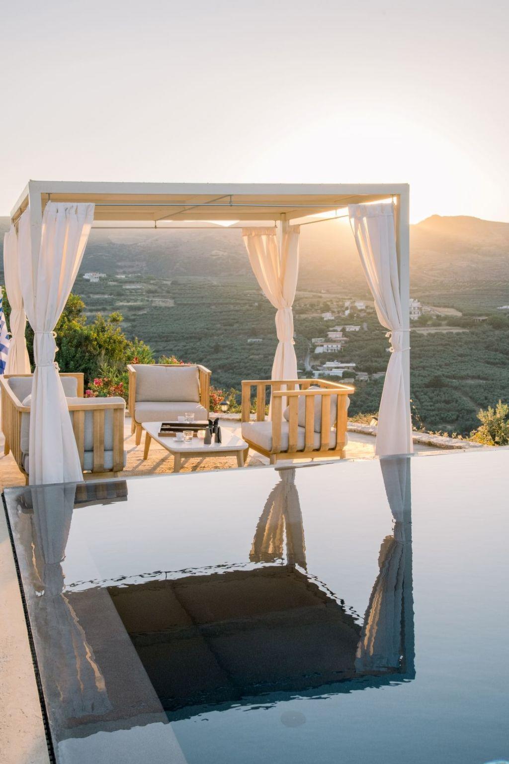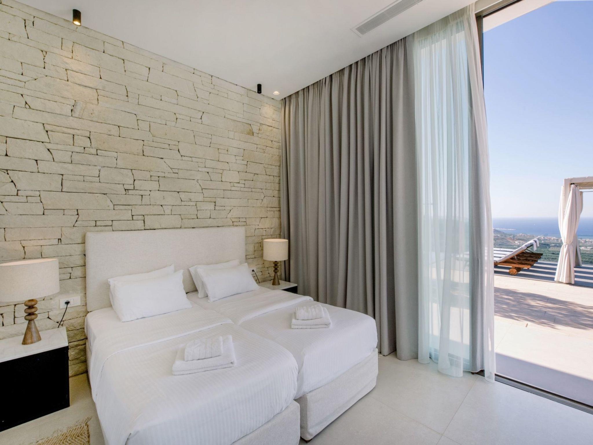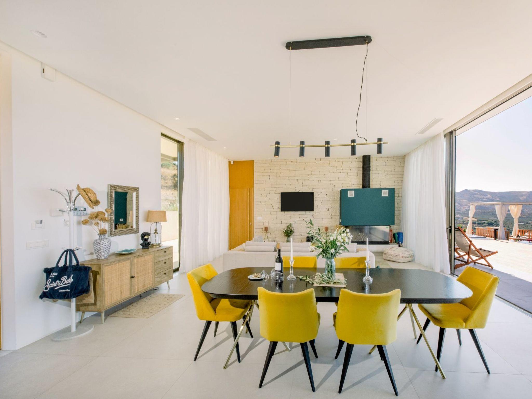 The property has 8000 m² and is situated on the hill in front of Kissamos on an extraordinary place in the North-West of Crete. It is on a archeological site which is going back to 500 bc. It has an bright view to the ocean and is surrounded by magnific mountains and important antique villages which you can see by birdeye view. With this unique view you get the feeling of having the possibility to fly directly to the beach. The property is in the heart of the landscape. You can enjoy undisturbing walks in the nature and between olive trees. The building has 3 bedrooms, 3 bathrooms and a large living room with open plan kitchen and a fireplace. All the windows are in front of the infinity pool and the amazing landscape. All materials and furnitures are of high quality.