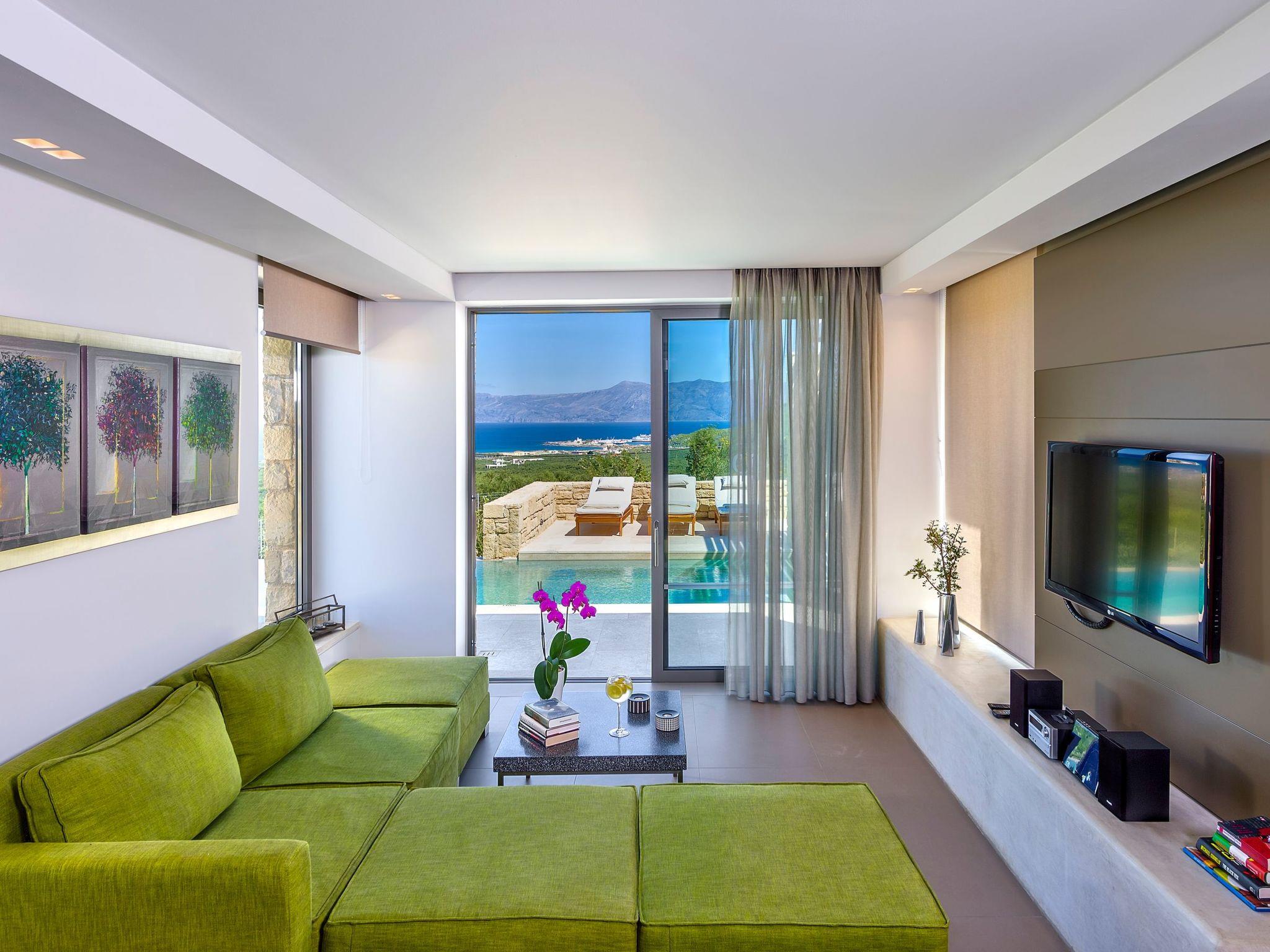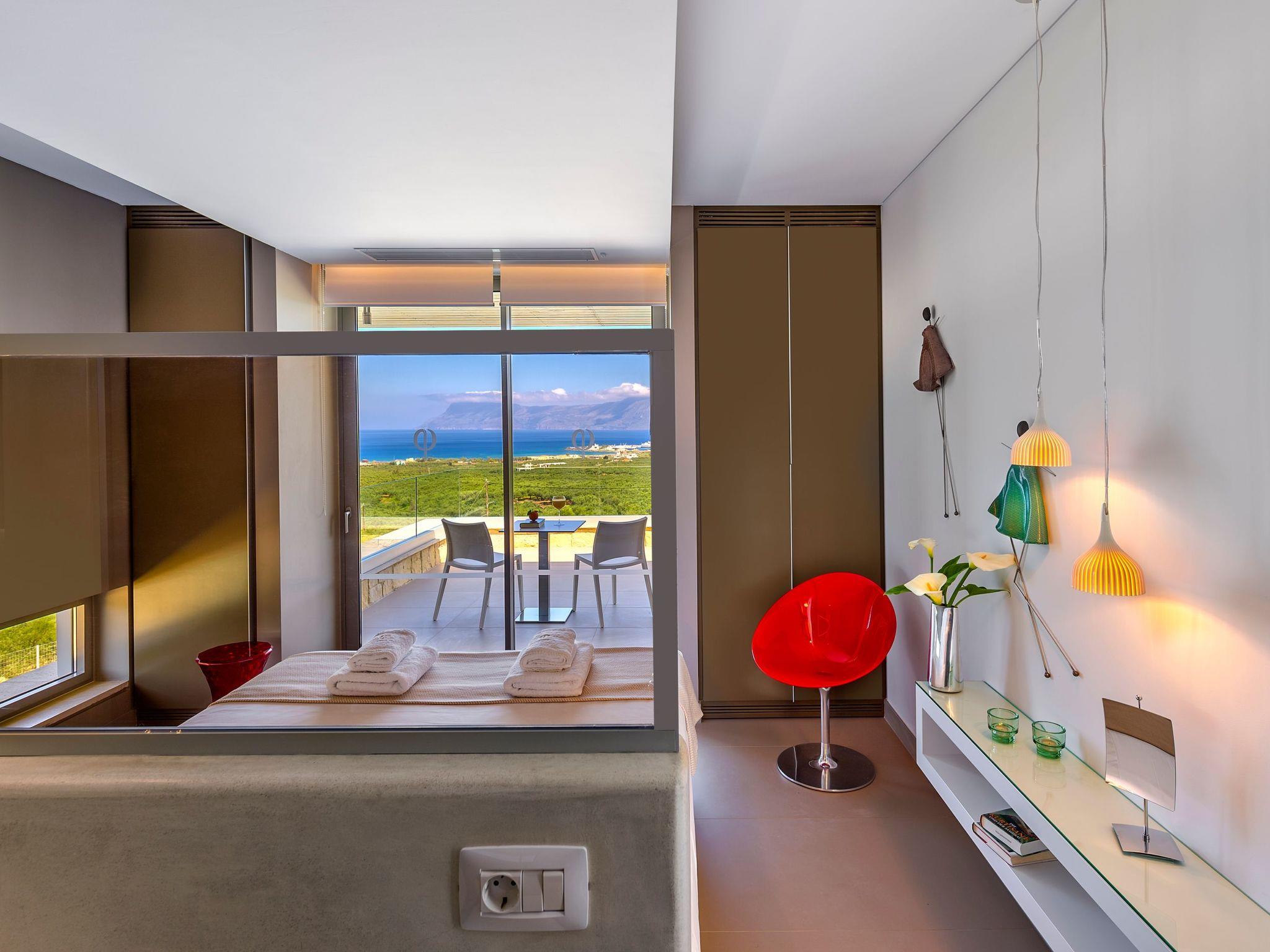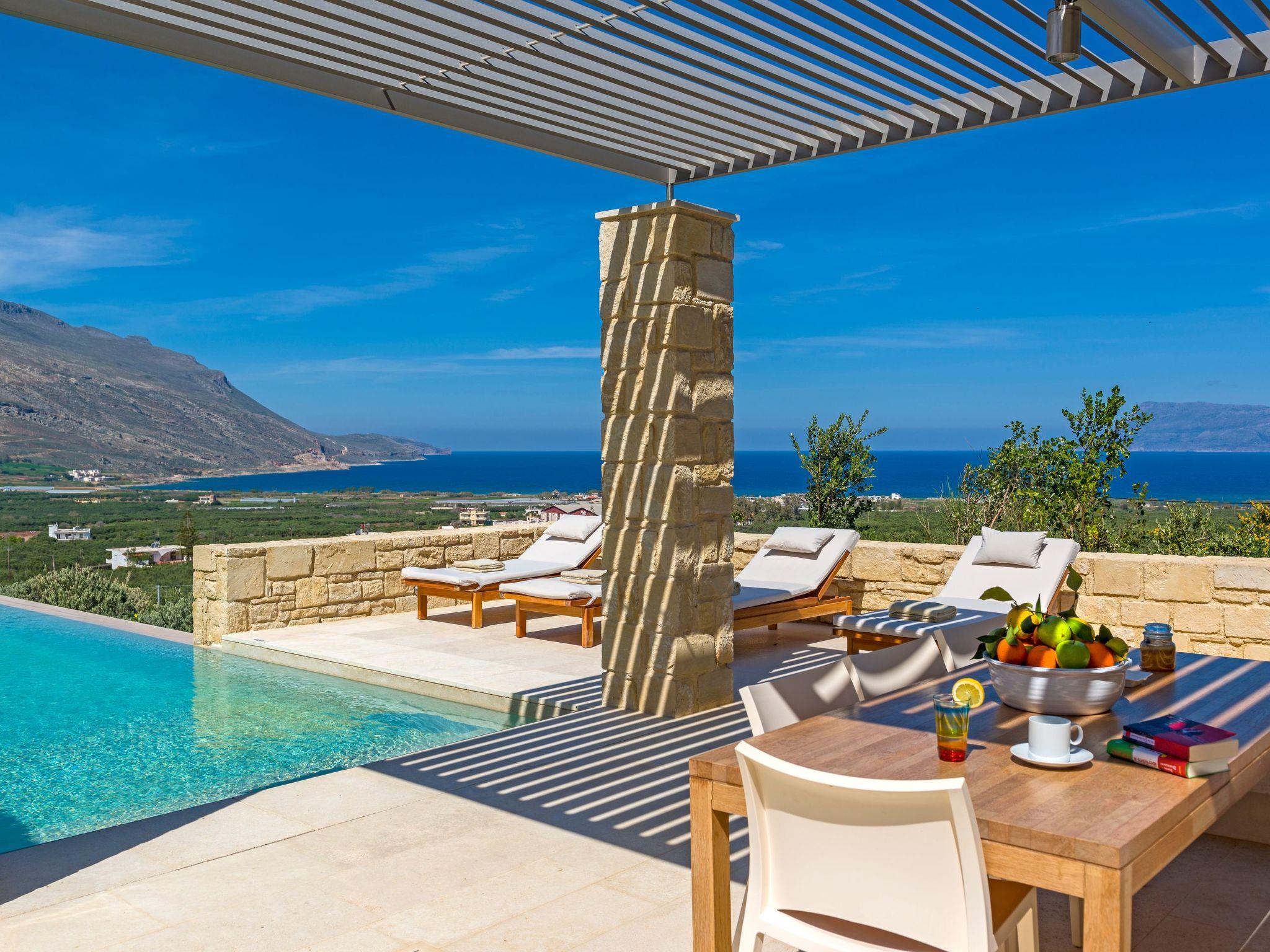The exterior of villa Oneiro is nothing short of breathtaking. The centerpiece is a private infinity pool where guests can immerse themselves in the tranquil waters under the sun with views stretching across to the Gramvousa Peninsular and Kissamos Bay. A stylish outdoor dining area under a specially-designed pergola allows for al fresco feasts amid a garden lush with endemic Mediterranean flora. Such a setting promises serene mornings and enchanting evenings under the Crete sky, designed to amplify the island's natural charm.