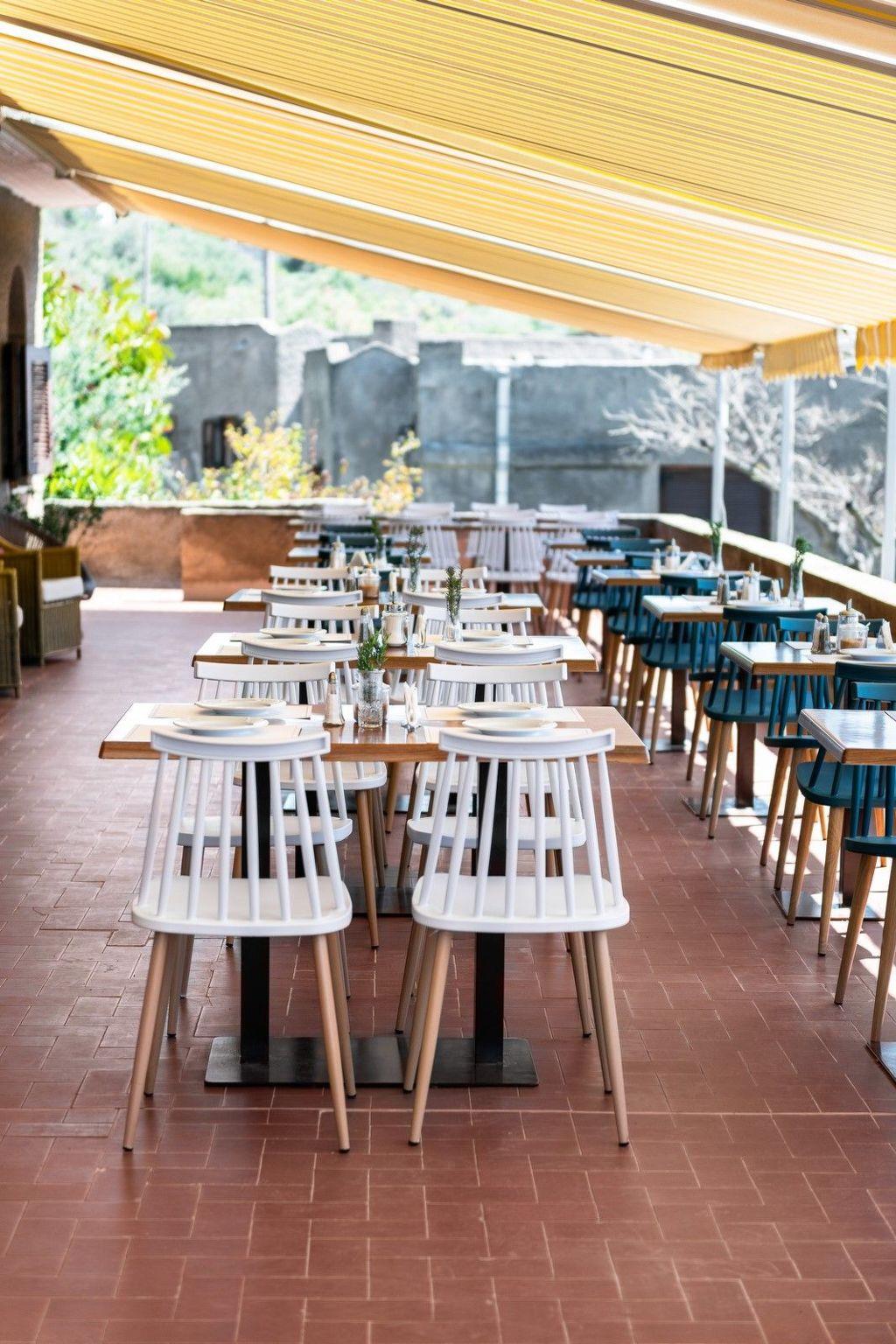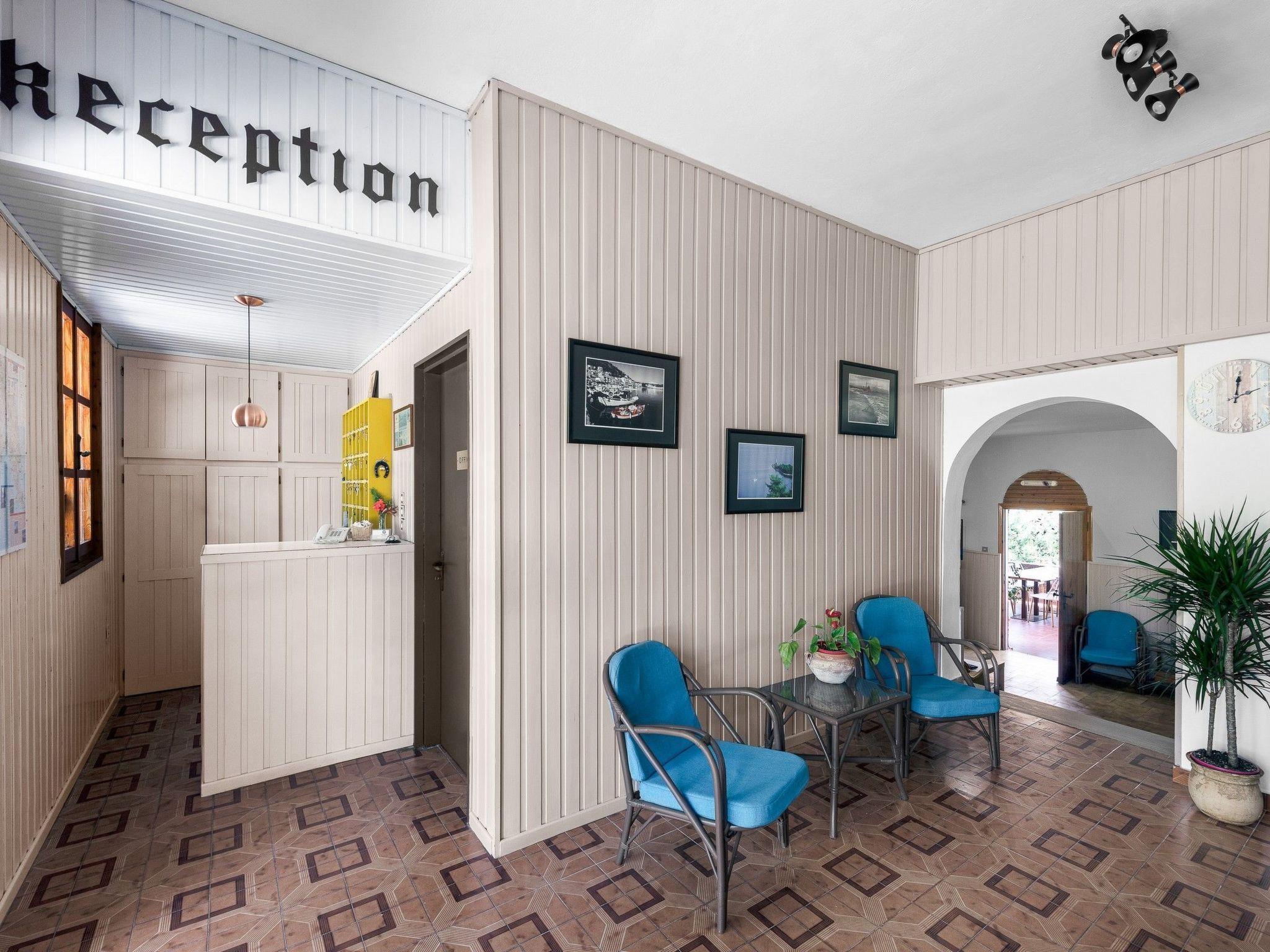 The main building has a reception, lounge with TV, bar and a large terrace where you can order breakfast and drinks. It offers a marvellous view of the entire bay and the beach. Access to the fenced complex is either from the beach side or the east side through a gate.