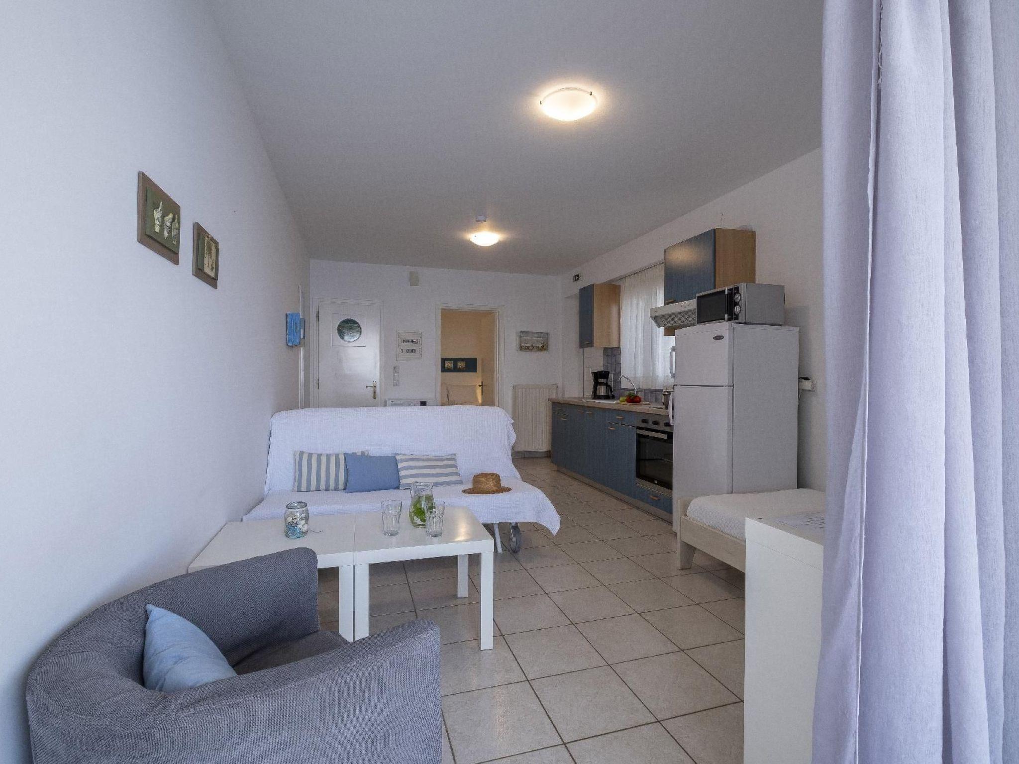 This 45m² apartment is suitable for four adults or two adults and three children. It provides a tiled and air-conditioned living room with an integrated kitchen. The sitting corner consists of a double sofa bed and a coffee table. There is a single bed by the wall next to it. In front of the bed there is an adjoining built-in kitchen equipped with a fridge, stove, microwave, coffee machine, mini oven, toaster and kettle, as well as crockery and cooking utensils. Opposite the kitchen unit there is a dining space. The bedroom behind the living room has a double bed. The bathroom next to it is fitted with a shower, WC and hairdryer.Relax on the balcony furnished with a table and four chairs. Already at breakfast time you can enjoy the breathtaking view of the sea, or you can end the evening here with a glass of wine under a starry sky.
