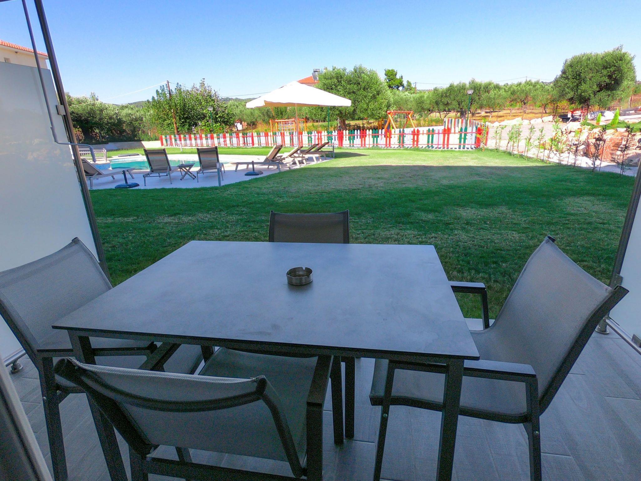 Finikas Garden Suites with garden, communal pool and children's playground The beach resort, built in 2018, is located in a green oasis with olive trees and palm trees. The luxuriously furnished flats with double bed and 2 single beds, kitchen, bathroom, large terrace or balcony can accommodate up to 4 people. The beach is only 150 metres away. Tavernas, cafeterias and shopping facilities are within walking distance. The marina and the centre of Nikiti Beach are 600 metres away. The large beach promenade of Nikiti invites you to take long walks in the evening. The resort is ideal for families with children, due to its quiet location, the swimming pool with children's area and the large children's playground. All infrastructural facilities are within walking distance.