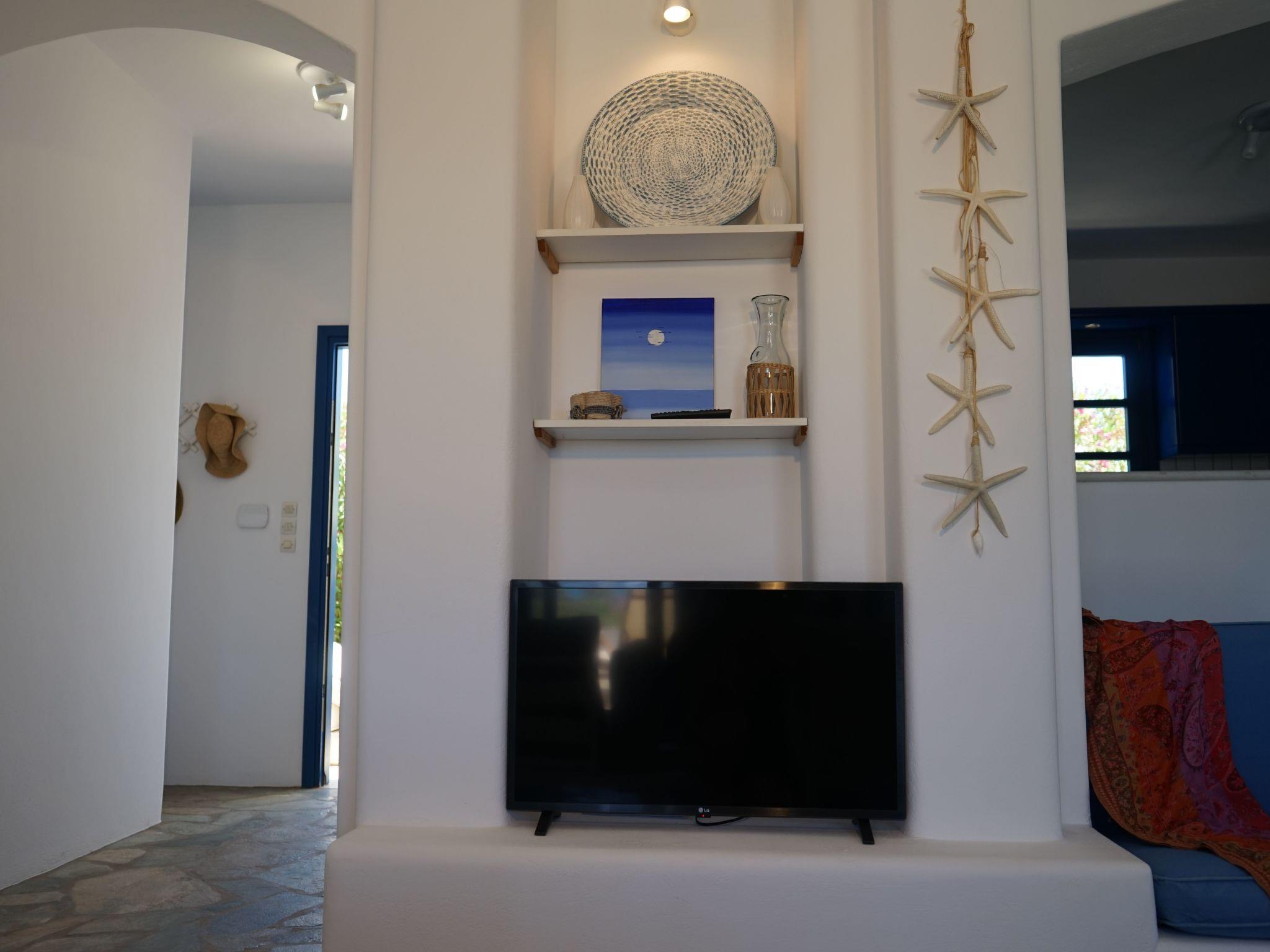 Kampos is a small village on the southwest of Paros, the house is located on the seaside part of the village, which is a residential area characterised by large Cycladic houses with gardens and olive trees around. A small local beach is only 180 m from the villa with some tamarisk trees for shade and crystal-clear water. It is never too choppyhere as this is the channel between Paros and Antiparos where the water is shallow and calm. The small chapel of Agios Nikolaos on the seafront is another 7-8 minutes walk away and a small bay harbouring fishing boats is 800 m from the house and can be used to moore a boat if you would like to rent one. The village of Kambos is characterised by small traditional houses connected by winding streets, gardens and wheat fields around. There is a village shop, a kind of “sells it all “(“pantopolio” in Greek) only 1300 m from the house, this is the centre of the village. Alyki is a popular village with excellent taverns, great beaches, supermarkets, an excellent bakery and some other shops only 5 minute’s drive or a short bike ride away. Parikia, the capital of Paros with its ancient agora, the archaeological museum and much more will take about 15 minutes to reach by car or you can use the bus service which should be about half an hour. Naoussa the party capital of the island and its chick boutiques are also within easy reach, the drive will be a mere half an hour.