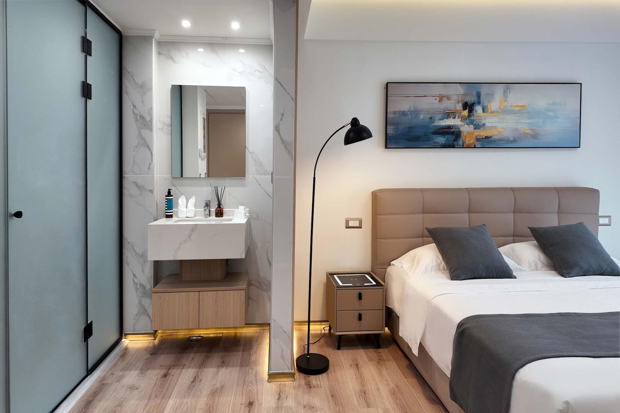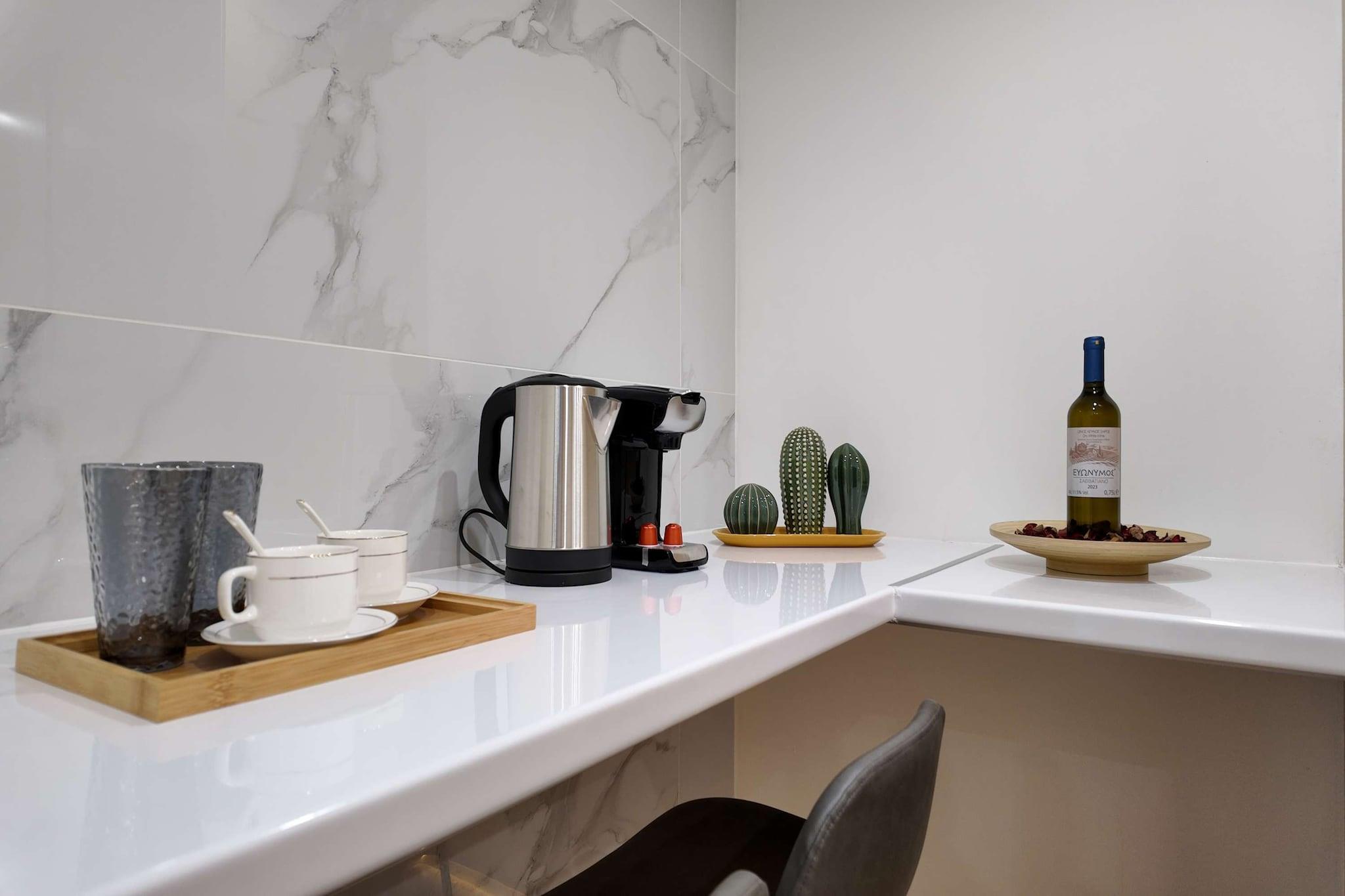 Inbäddat i det pulserande hjärtat av Pireus centrum, erbjuder denna nyrenoverade lägenhet en sofistikerad urban tillflyktsort där modern stil möter maritim charm. Gästerna välkomnas till en ljus, luftkonditionerad fristad som öppnar upp mot en privat balkong med fridfull utsikt över trädgården. Oavsett om du njuter av en morgonbryggd kaffe från kaffemaskinen på solterrassen eller varvar ner bland den frodiga grönskan i den gemensamma trädgården, erbjuder fastigheten en lugn bostadskänsla samtidigt som du håller dig uppkopplad med höghastighetsinternet. Interiören är omsorgsfullt utformad för två personer, med ett mysigt sovrum utrustat med en dubbelsäng och en platt-TV med kabelkanaler för avkopplande kvällar. Det funktionella pentryt är fullt förberett för din vistelse med mikrovågsugn, vattenkokare och ett matbord perfekt för intima måltider. För de som prioriterar välbefinnande har byggnaden ett eget gym för att upprätthålla din träningsrutin, medan ett modernt badrum utrustat med rena handdukar och hårtork garanterar en smidig upplevelse. Ytterligare bekvämligheter som en hiss, en bar på plats och inkluderade sängkläder och lakan gör detta till en verkligt enkel tillflyktsort. Äventyret ligger precis utanför dörren, eftersom lägenheten är perfekt placerad för att utforska den atenska kusten. En kort promenad tar dig till den livliga hamnen i Pireus eller de soldränkta stränderna vid Freatida-stranden. Omgivningarna är en port till Egeiska havet, med lokala båtmöjligheter och ikoniska landmärken som Stavros Niarchos Foundation Cultural Center och Flisvos Marina bara en kort bilresa bort. Det är en plats där stadsliv och kustnära skönhet möts för en verkligt minnesvärd vistelse.
