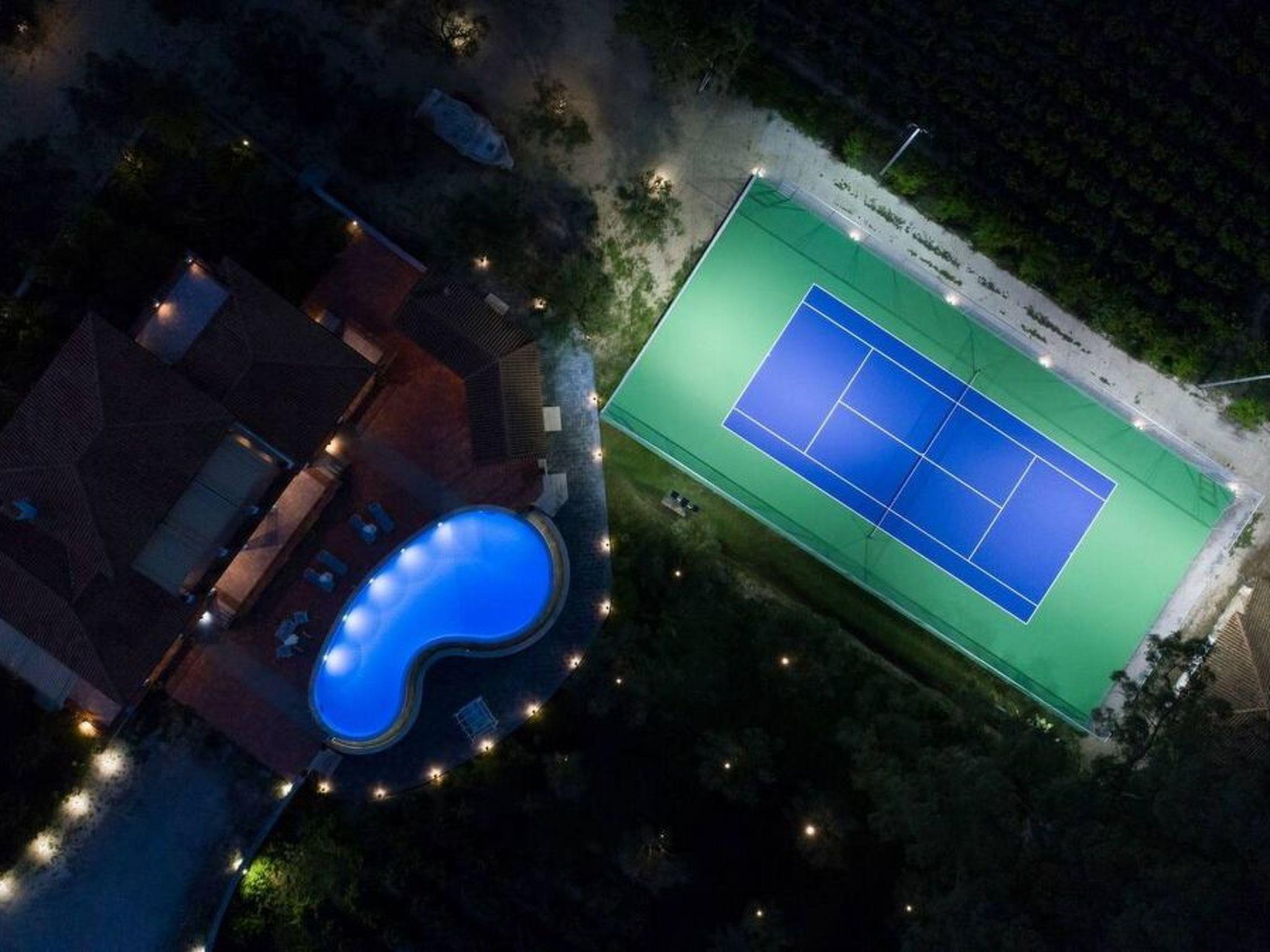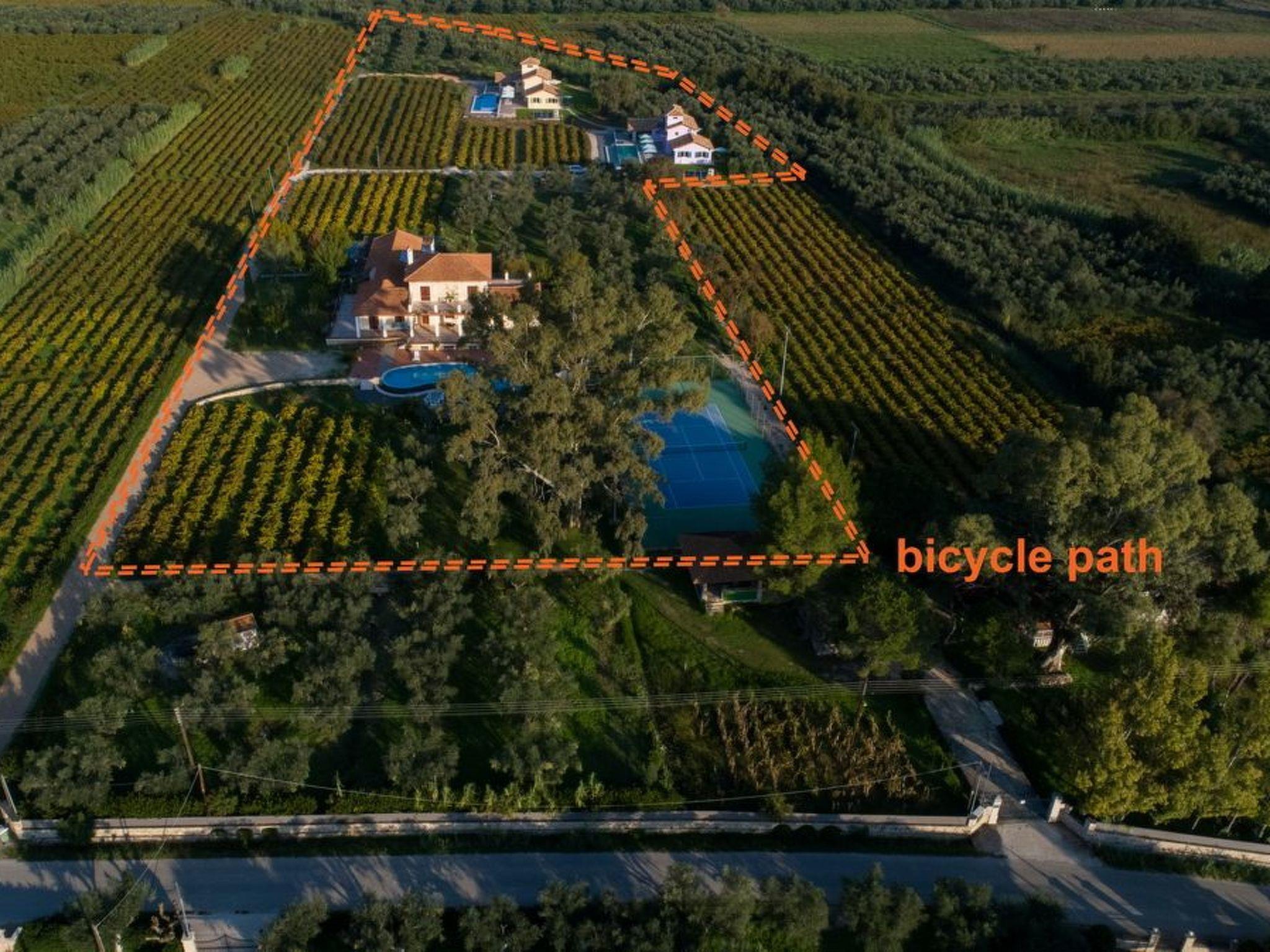 Outdoor area:The villa has its own independent, gorgeous infinity 100sqm heated pool with open-air hydro-massage and children's pool of a depth of 30cm. Next to the pool a large roofed dining area of 60sqm with BBQ is built, with monastery-like dining table. The terrace around the pool, ideal for events, is 250sqm.The tennis court with lighting, thus permitting playing at night, awaits you to enjoy endless hours of carefree play. Tennis equipment is provided (extra charge).Children can play on the lawn among the olives, try fruit from our hedges and explore our vegetable garden with our organic vegetables.A bicycle and jogging path 800m long leads you through the whole vineyard. Free bicycles are provided.Binoculars and telescope are provided on request.