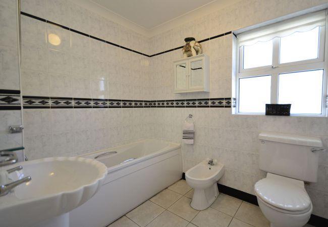 - Family bathroom with bath with overhead shower, WC and basin