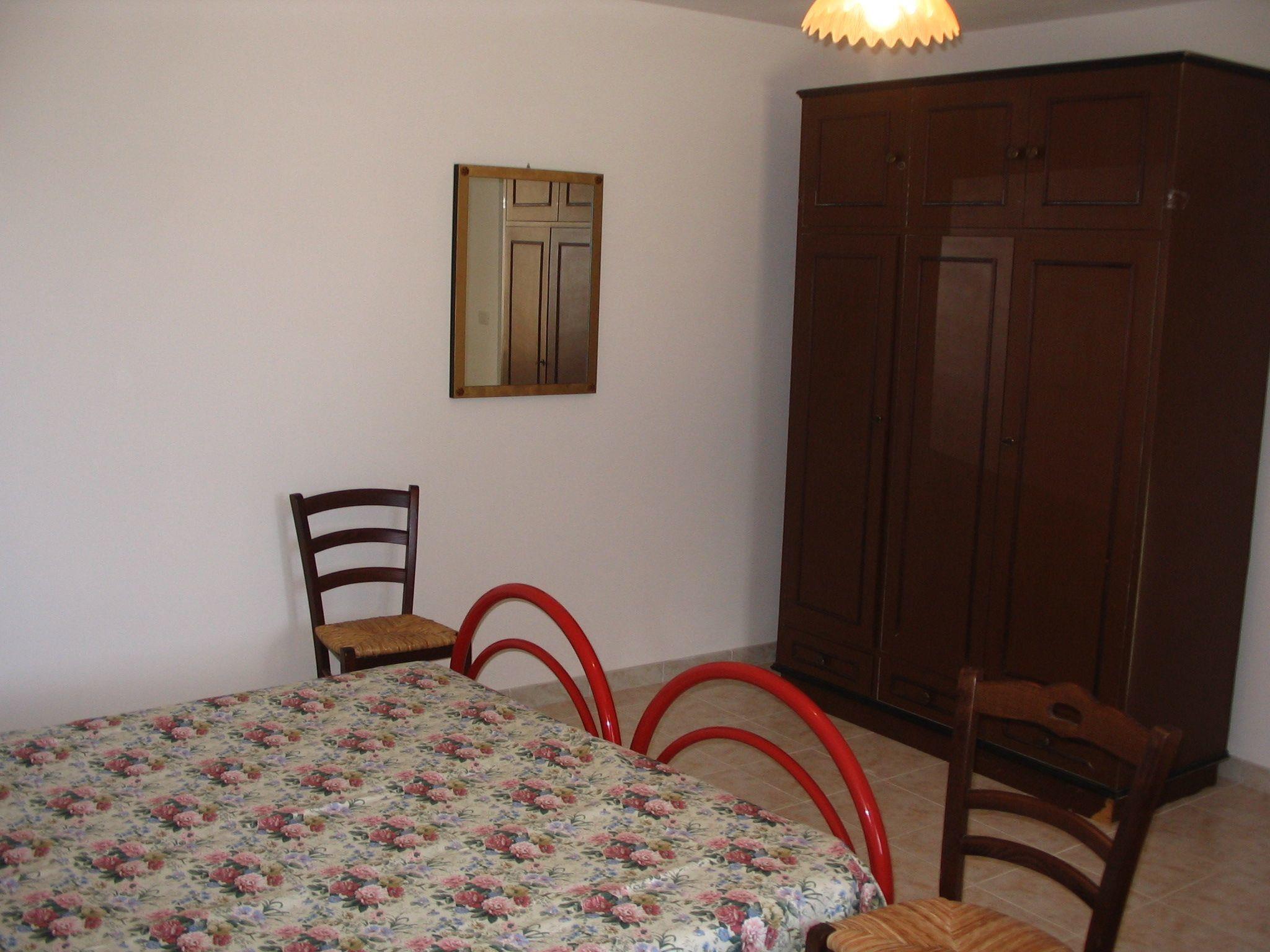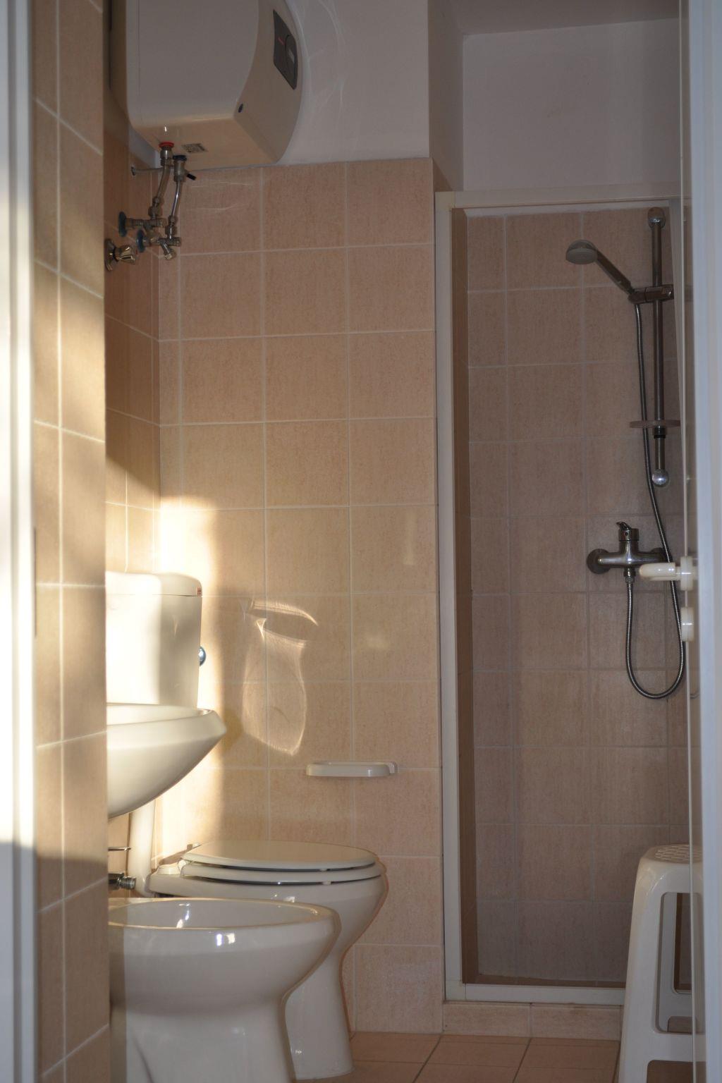 The flat is a two-room flat with an entrance - kitchen and a very large bedroom in which there is a double bed, two single beds and a large wardrobe. The bathroom has a shower and bidet. The kitchen is gas with an oven and four burners. The refrigerator is large with a freezer. Small appliances are missing. There are dishes, plates and glasses. A washing machine can be used.