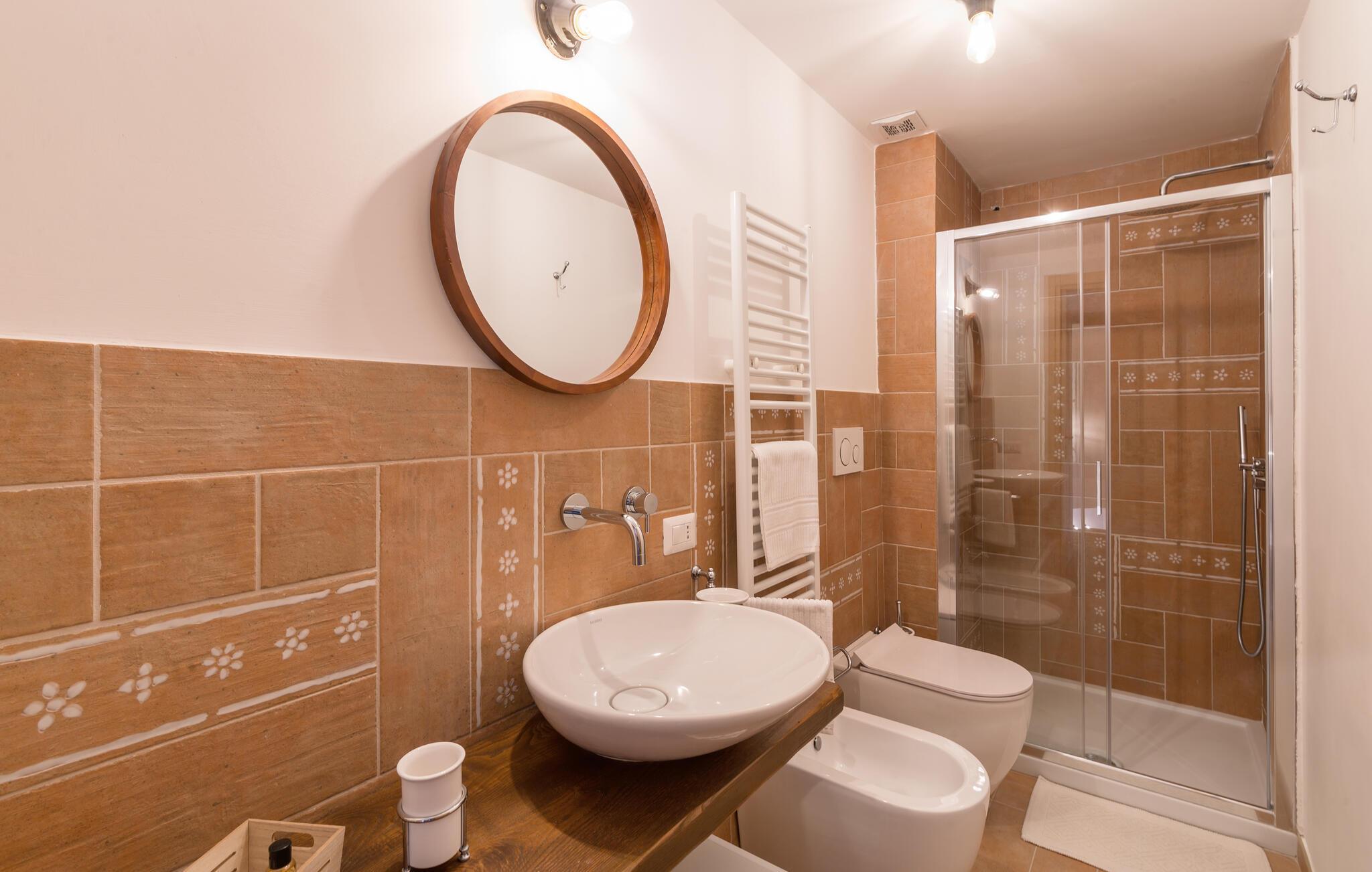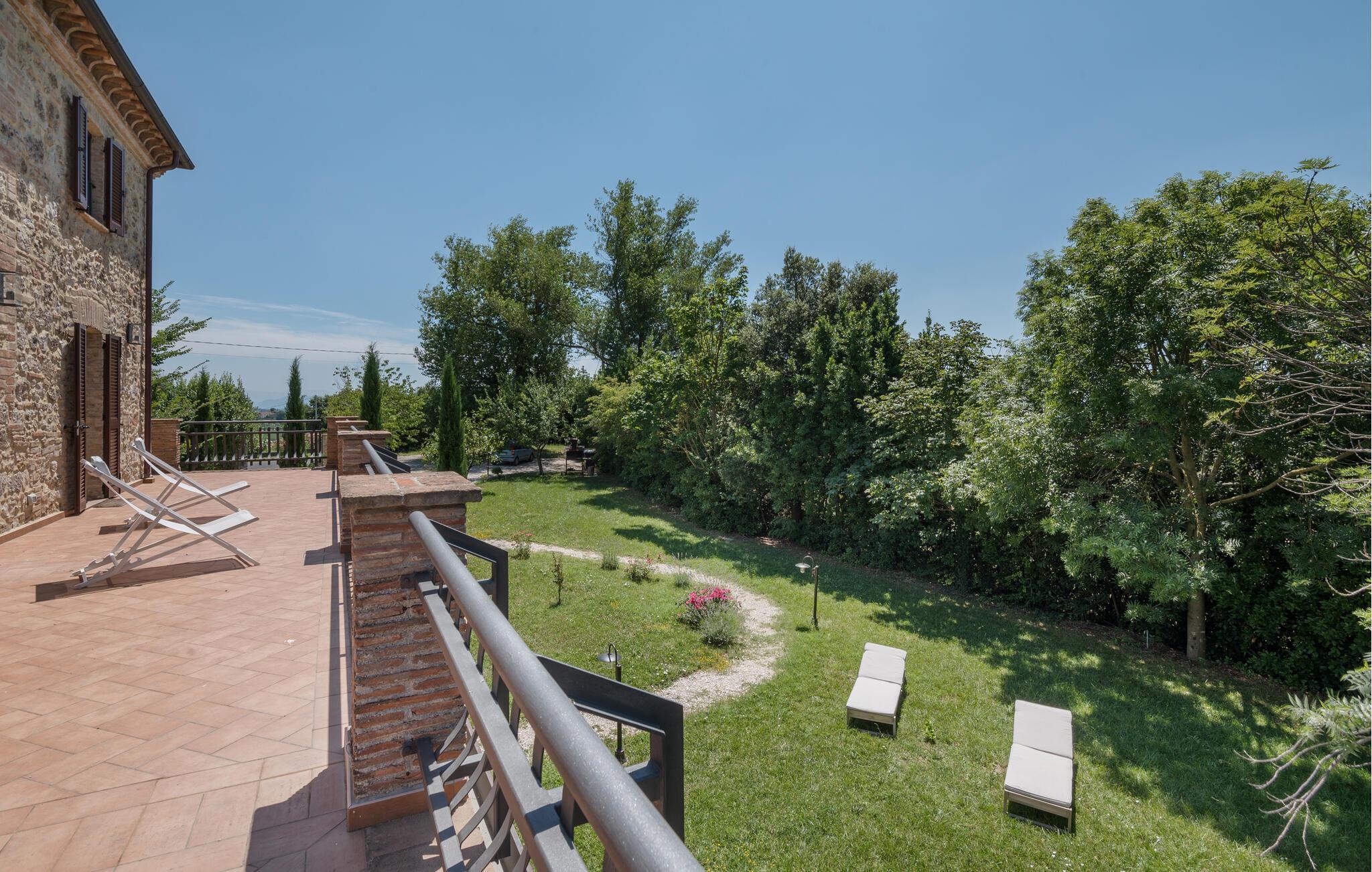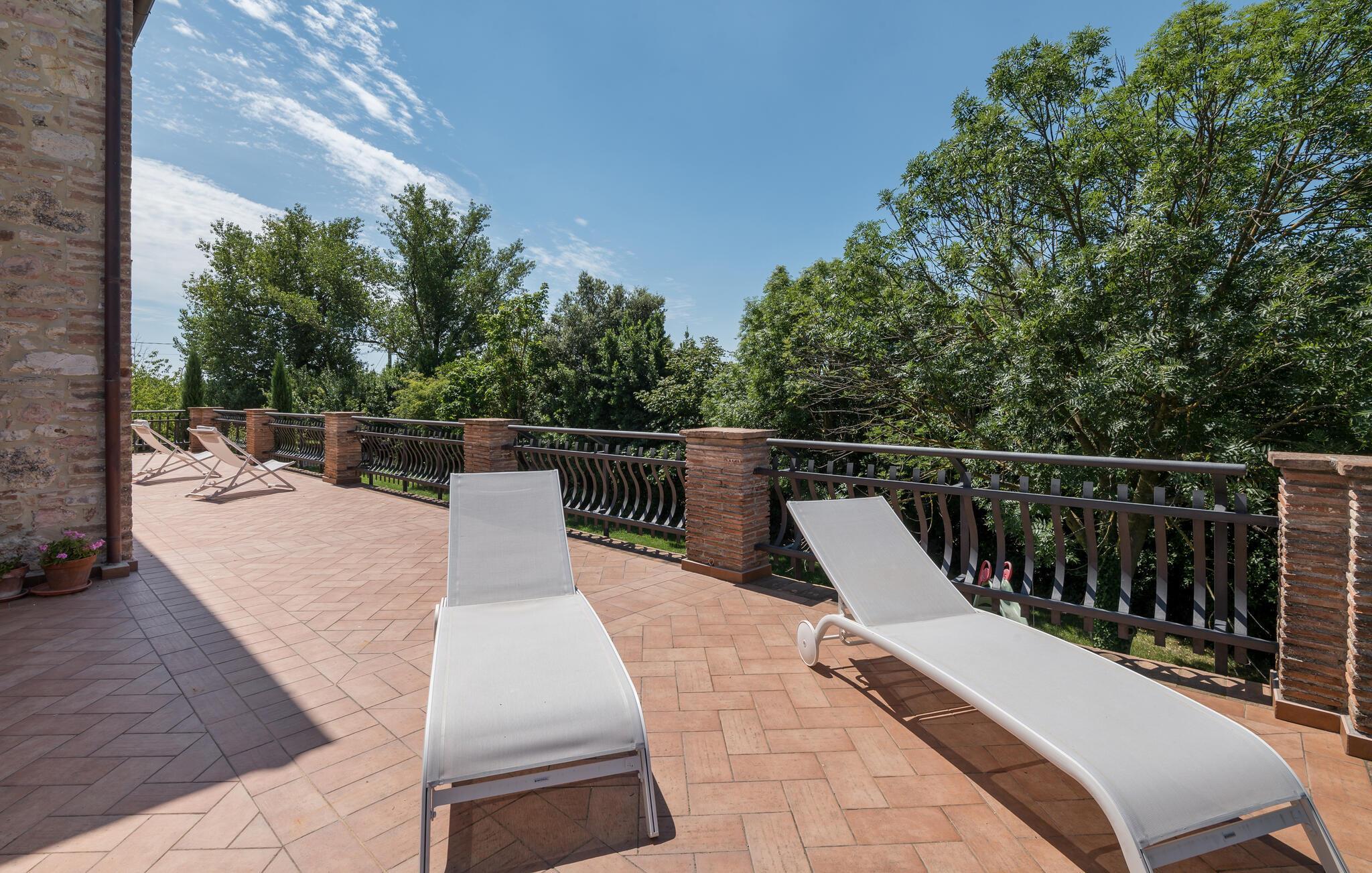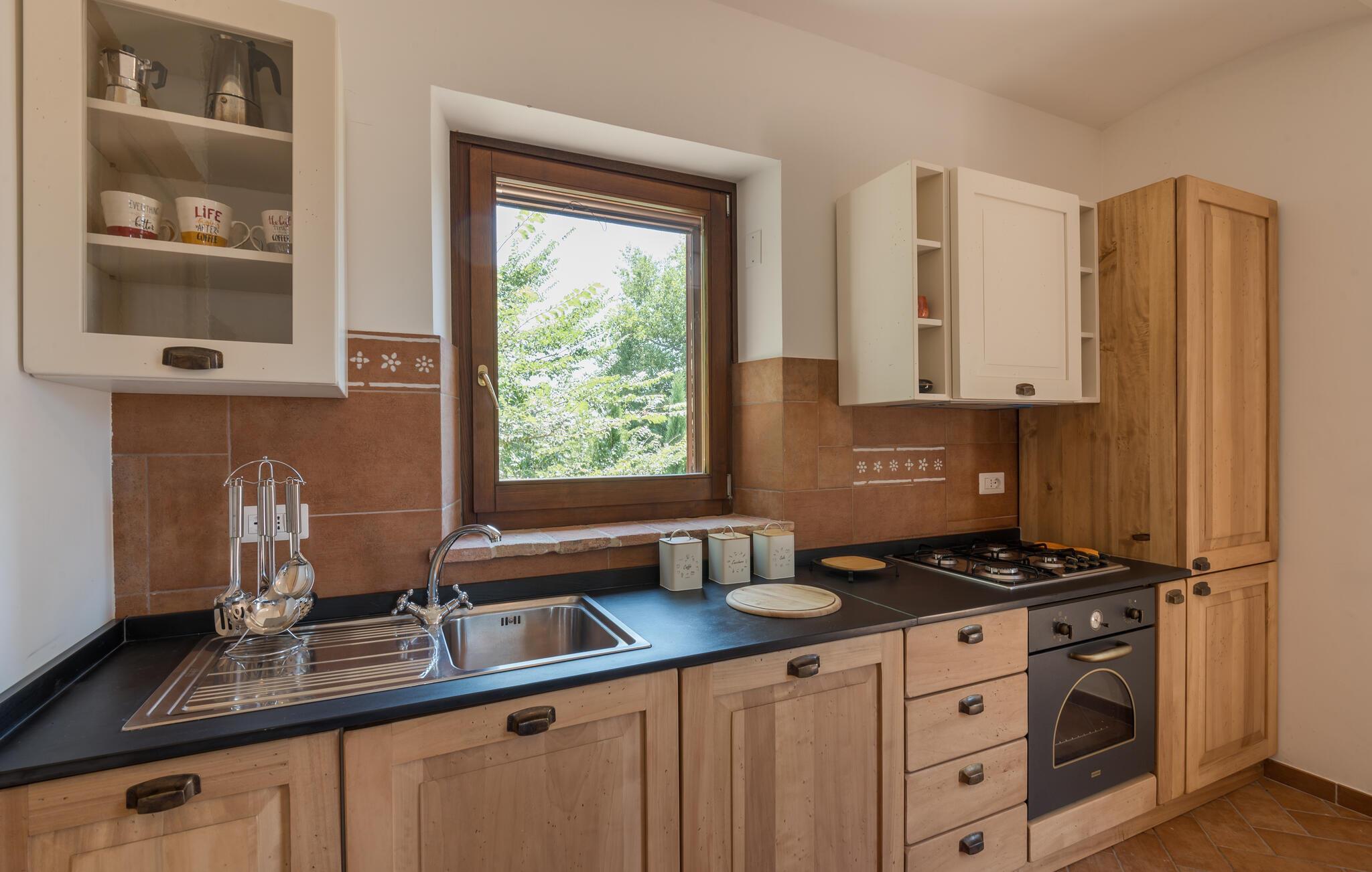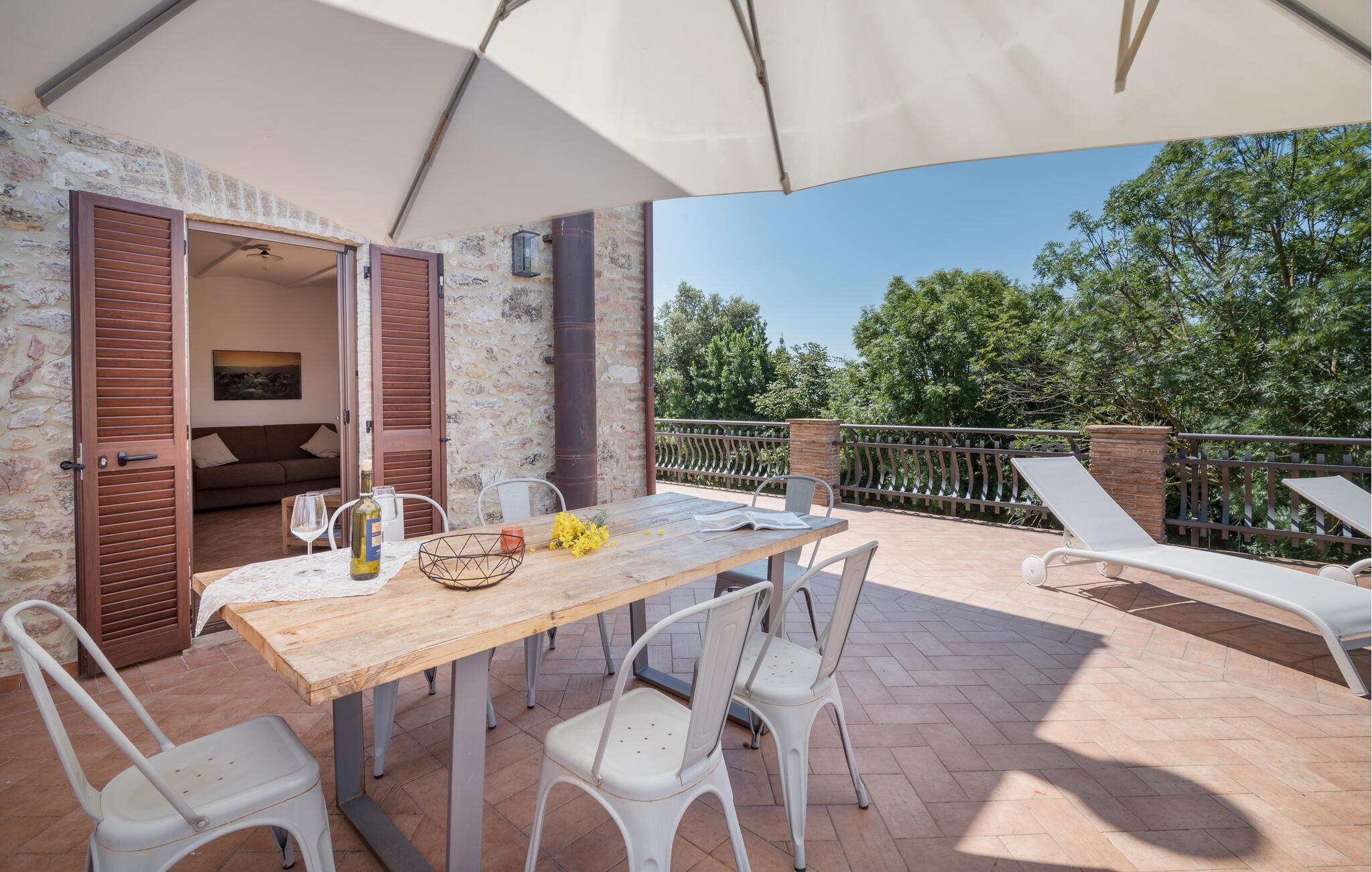 Lägenheten välkomnar dig på ett fantastiskt läge mitt i den umbriska naturen i en restaurerad bondgård och erbjuder dig idealiska förutsättningar för en avkopplande semester. De inbjudande rummen och den stilfulla inredningen med synligt tegel, inslag av trä och medelhavsfärger skapar en vacker miljö runt din semester. Gör det bekvämt i soffan efter händelserika dagar, prata sent på kvällen medan lågorna sprakar i kaminen och gör upp planer för de kommande dagarna.