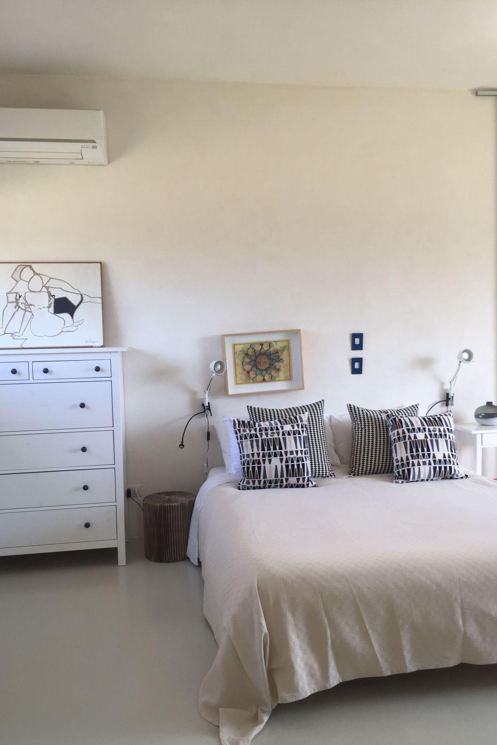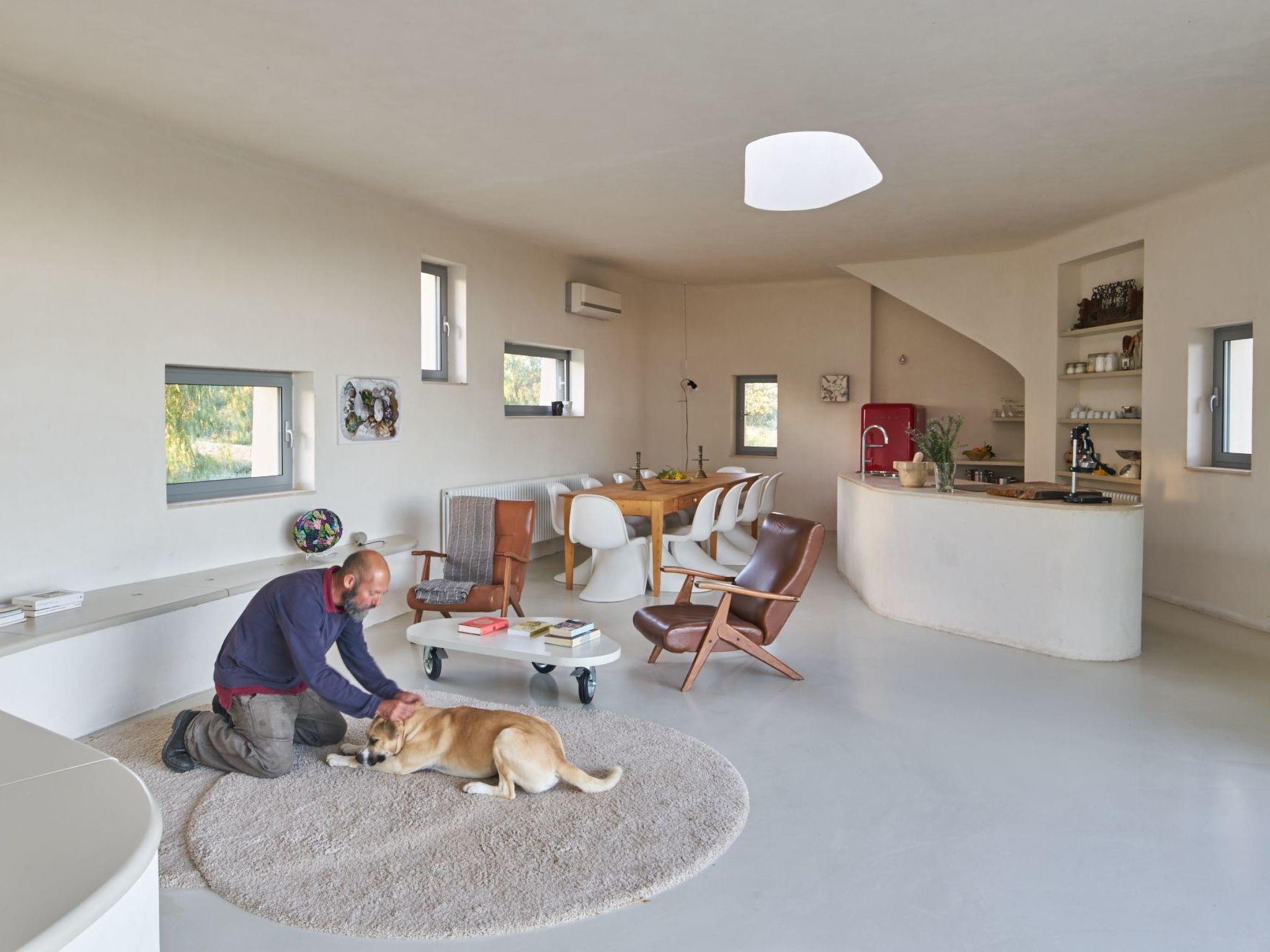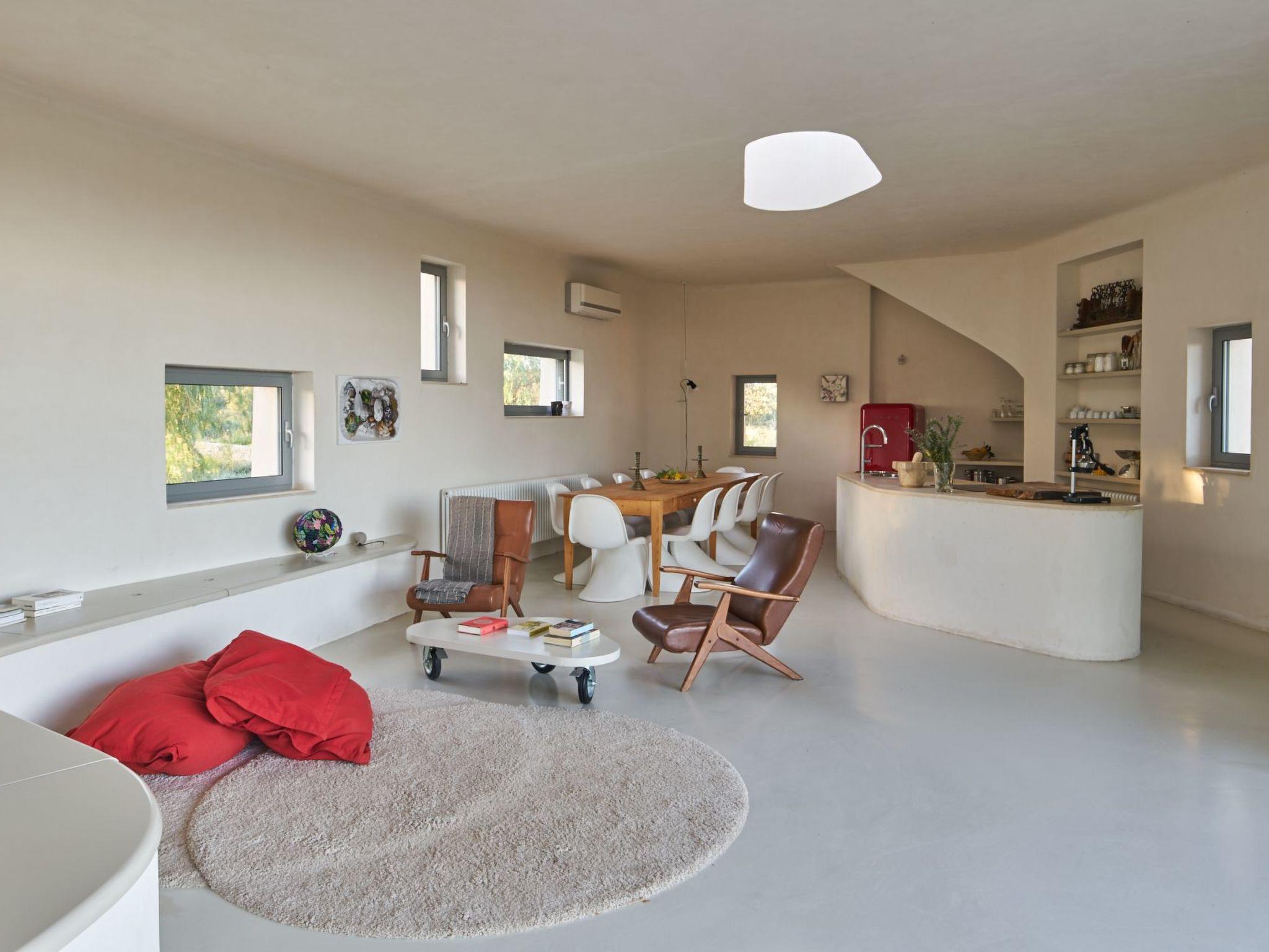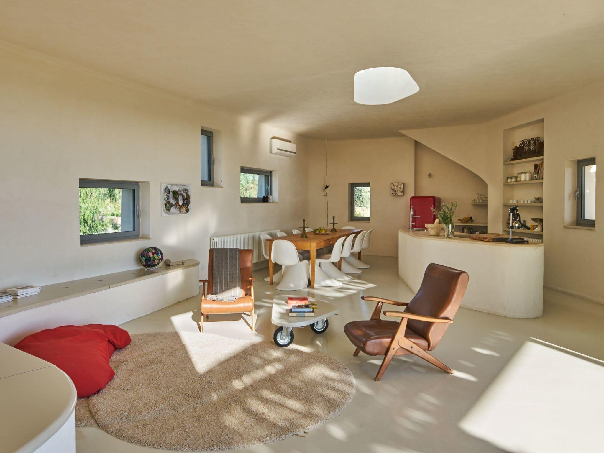 1- In the Senior Villa with large concrete bench/sofa with pillows for comfortable seating, armchairs, pouffs, fully equipped kitchen area, 3 mts long table and 10 Panton chairs, TV, AC, safe, skylight with electric open/close and 6 windows one of which is the wall wide door window;