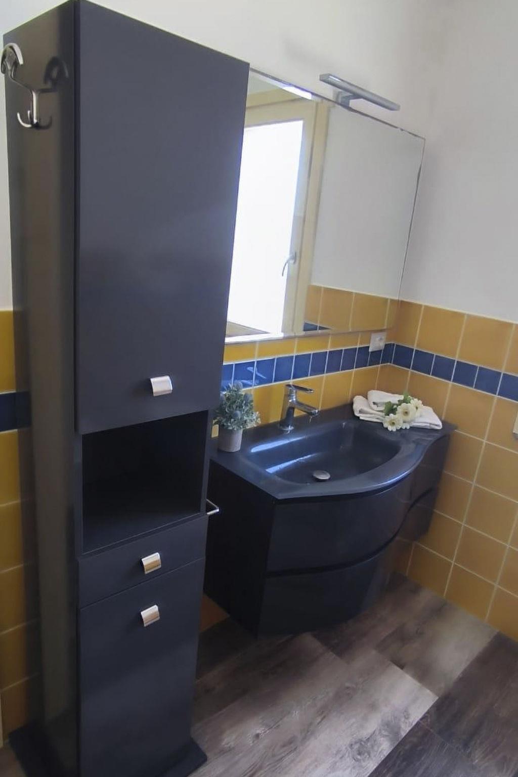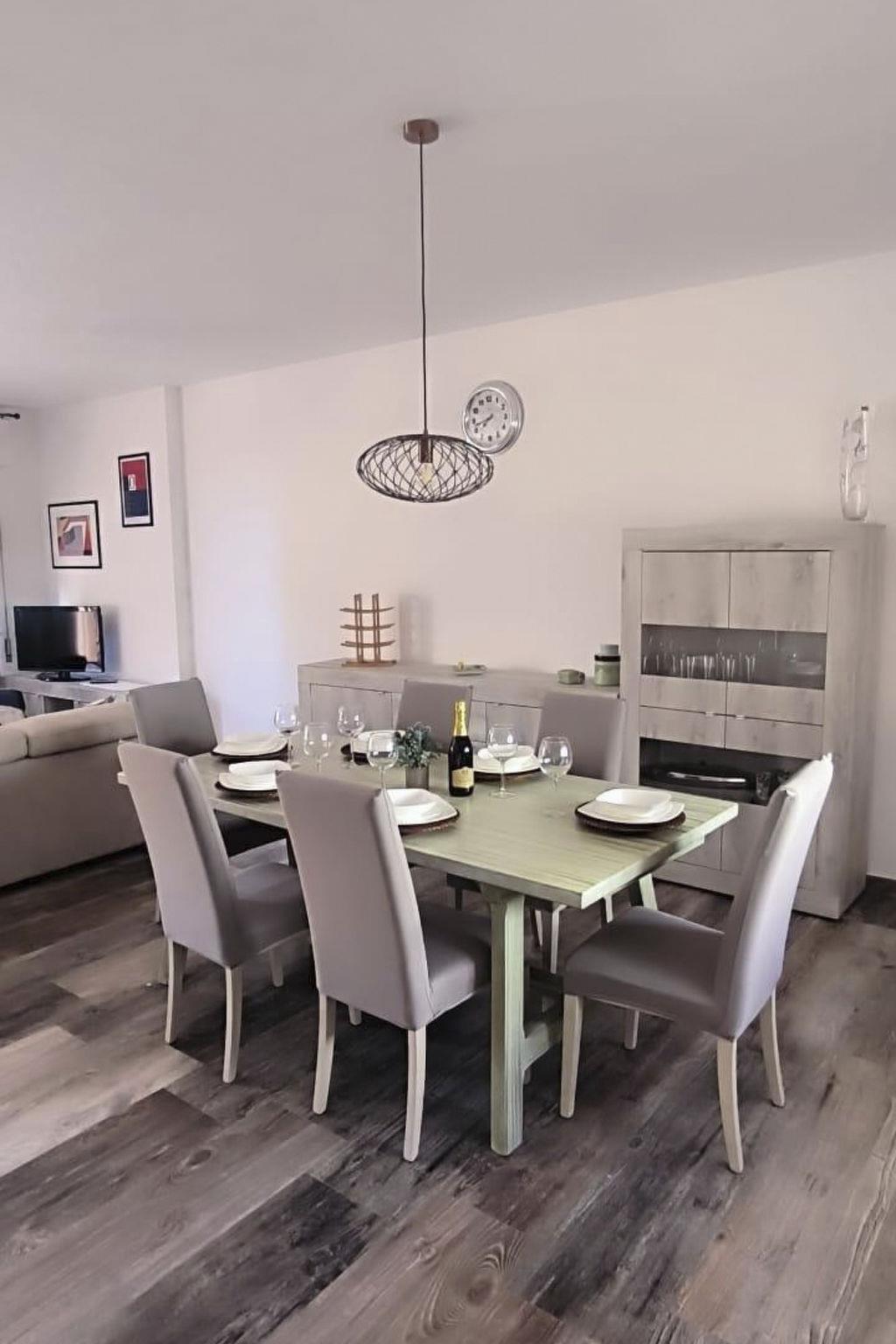Inside, you will find a spacious living ambience that can comfortably accommodate up to 6 people. The accommodation has a spacious open-plan living room with kitchen area, a master bedroom with double bed and two smaller bedrooms. There are also two fully equipped bathrooms with washbasin, WC, bidet and shower. Further comforts include air conditioning and WiFi to make your stay as pleasant as possible.