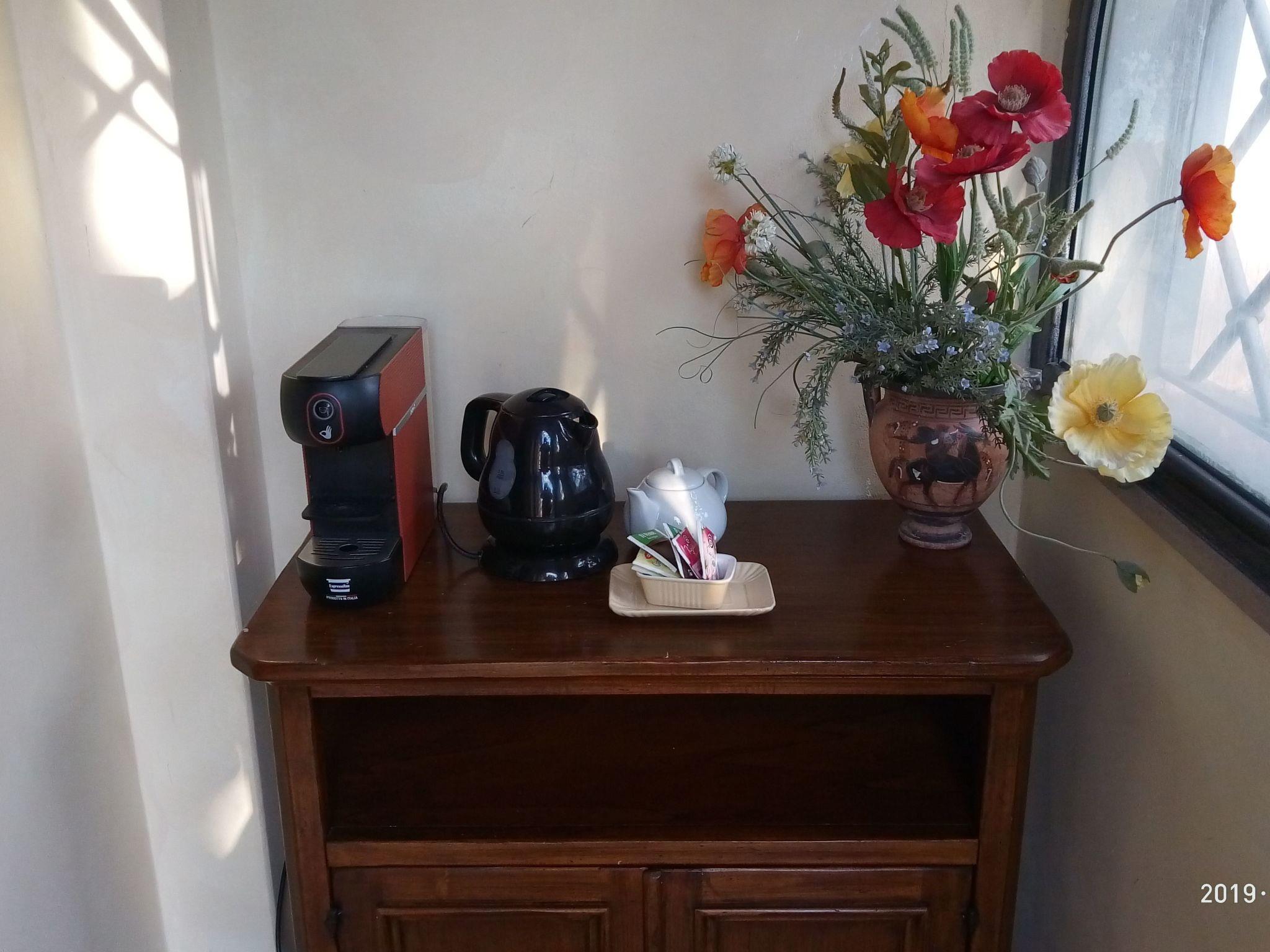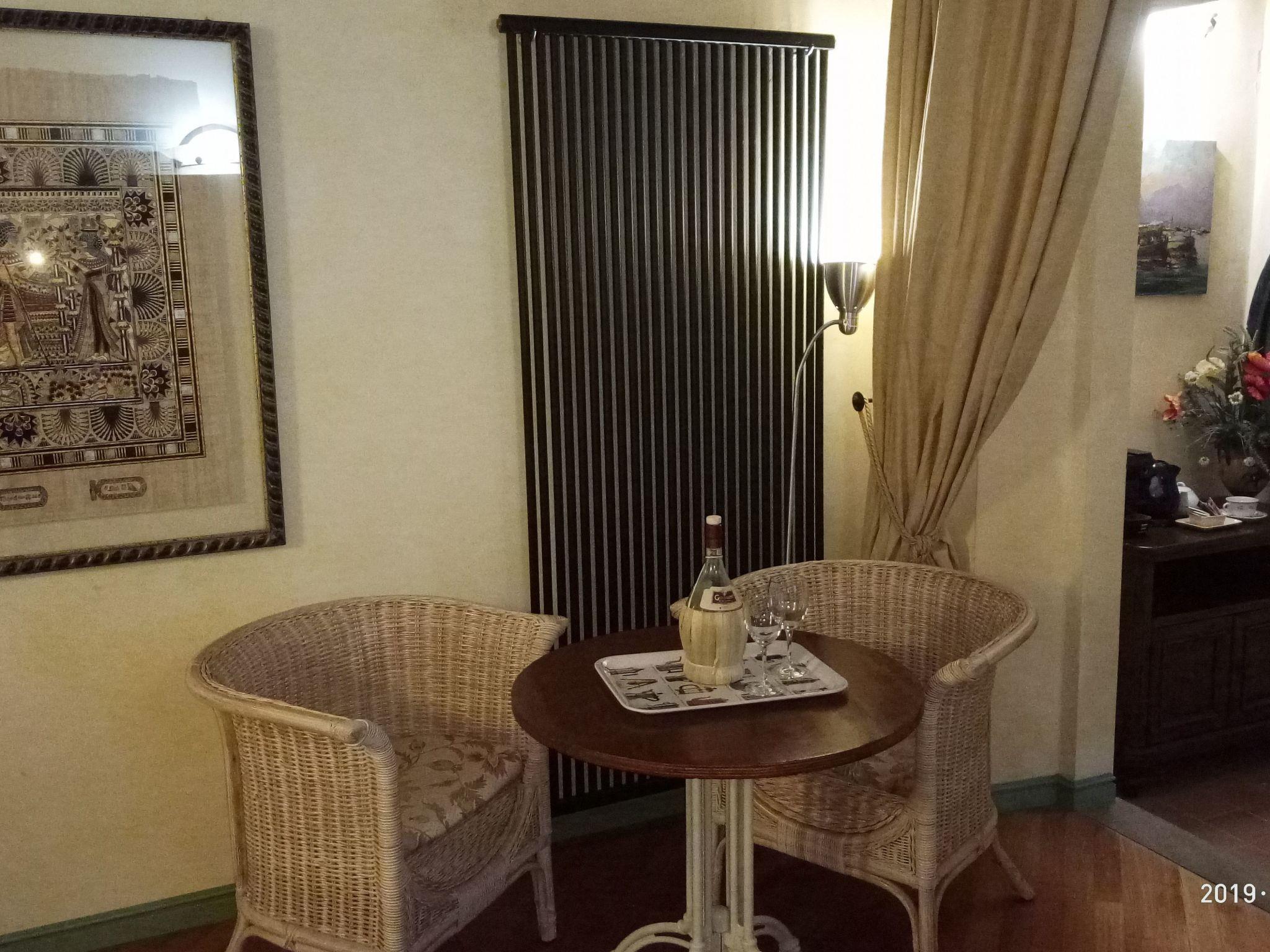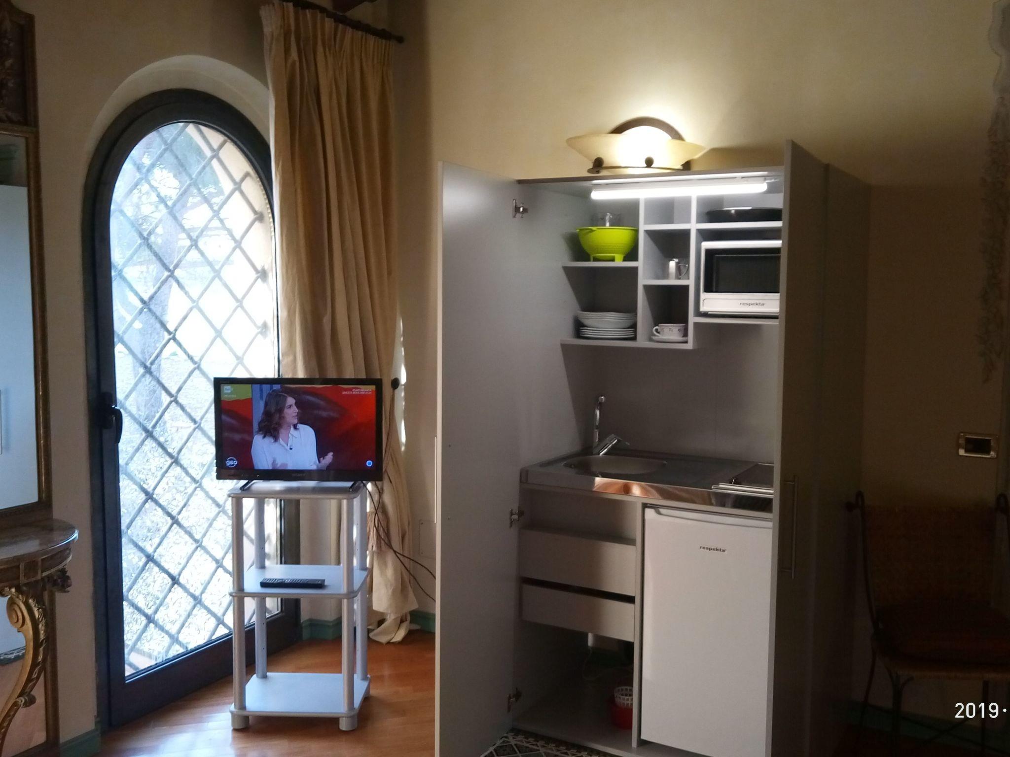 The interior of the studio, measuring approximately 35 square metres and accessible via a private external staircase, is elegantly furnished and equipped with every comfort. The large bedroom with double bed promises peaceful rest, while the adjacent wardrobe room offers ample space for your clothes. The wellness experience is rounded off by a luxurious bathroom that features a walk-in shower, double washbasin, toilet and bidet. For those moments when you wish to prepare a snack or beverage, the mini kitchen is equipped with a ceramic hob, microwave, refrigerator, toaster, kettle, electric capsule coffee machine and a flat-screen TV for your entertainment.
