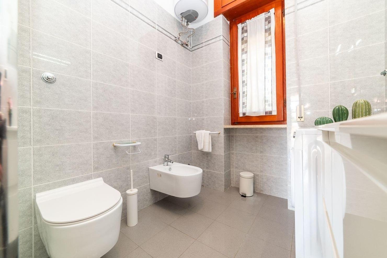 Das Badezimmer mit Fenster bietet eine Duschkabine, komplette Sanitäranlagen, eine Waschmaschine und ein komplettes Willkommensset mit Shampoo, Spülung und Duschgel.