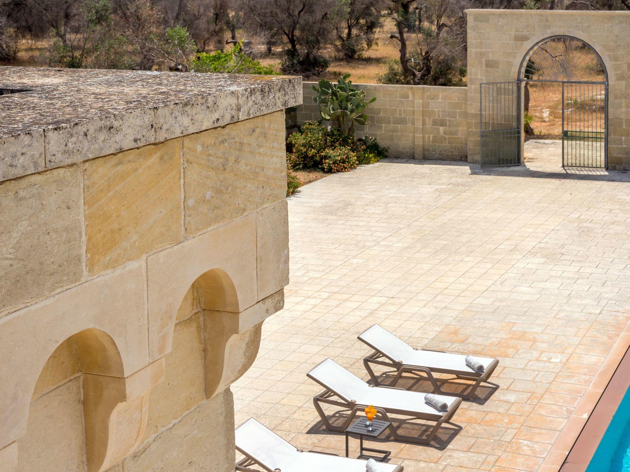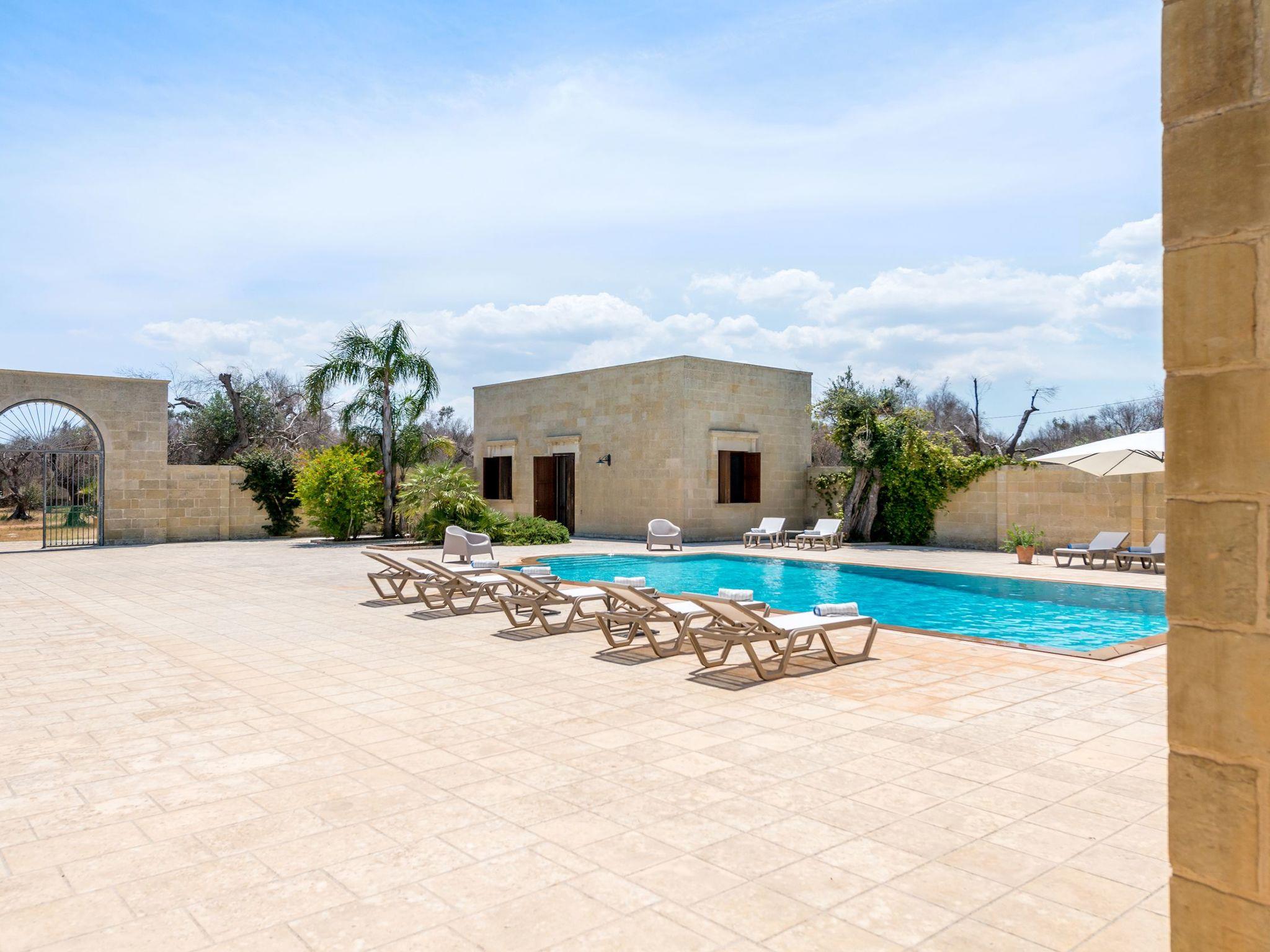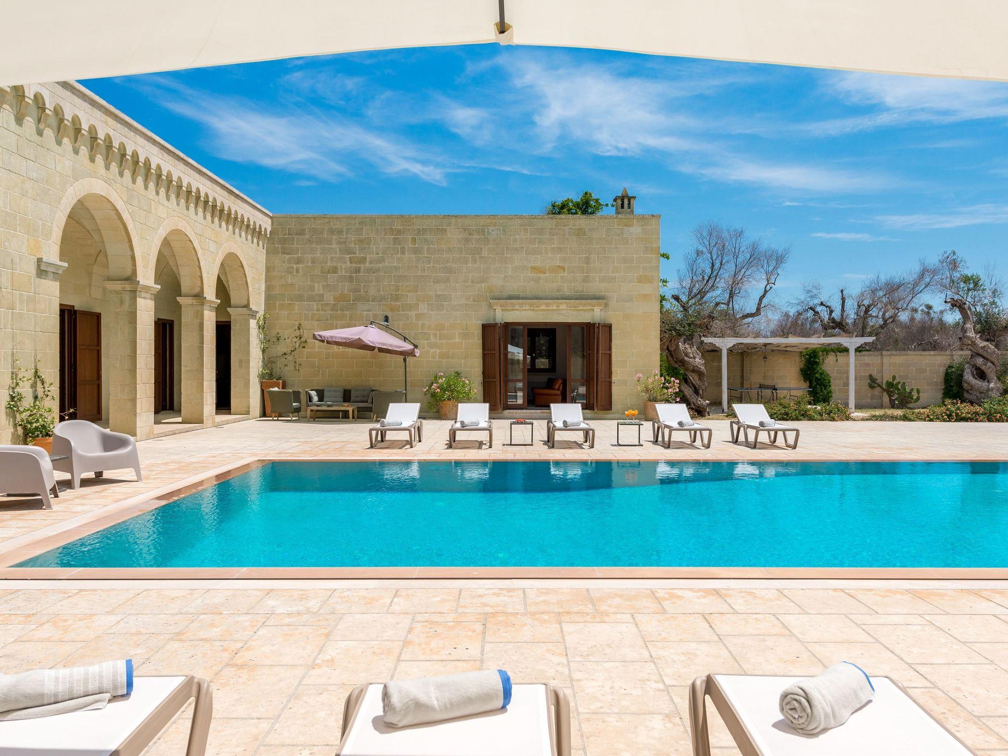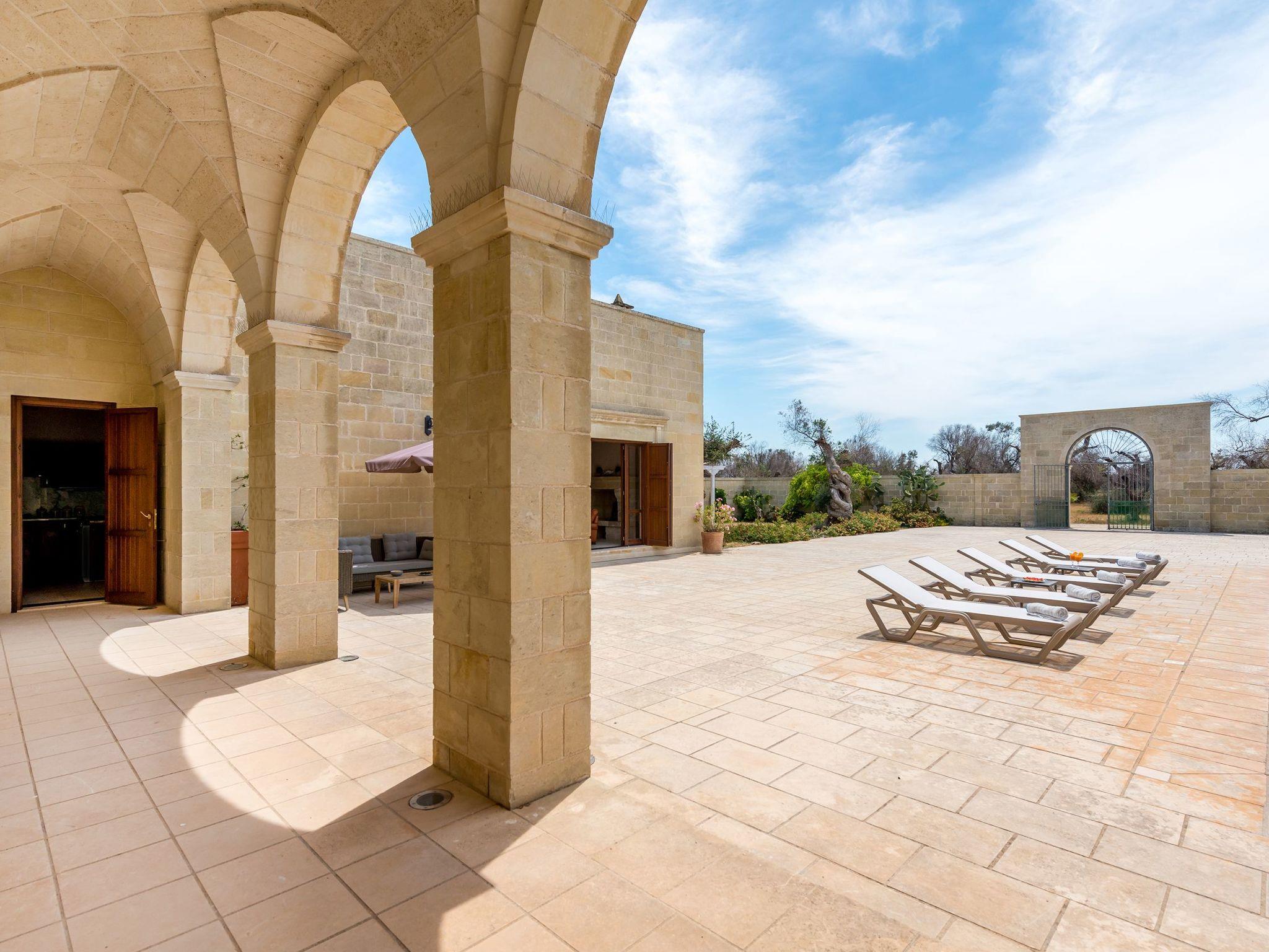 Ideal villa for those who love large spaces and maximum privacy. This property offers its visitors the typical characteristics of the ancient Salento farmhouses: central cloister, high "star" vaults, local Lecce stone. It is located in the center of a large land planted with olive groves. To make your stay more pleasant there is a beautiful swimming pool (10x5 meters) with majolica mosaic, a barbecue corner and a pizza oven with pergola for lunch or dinner outdoors.