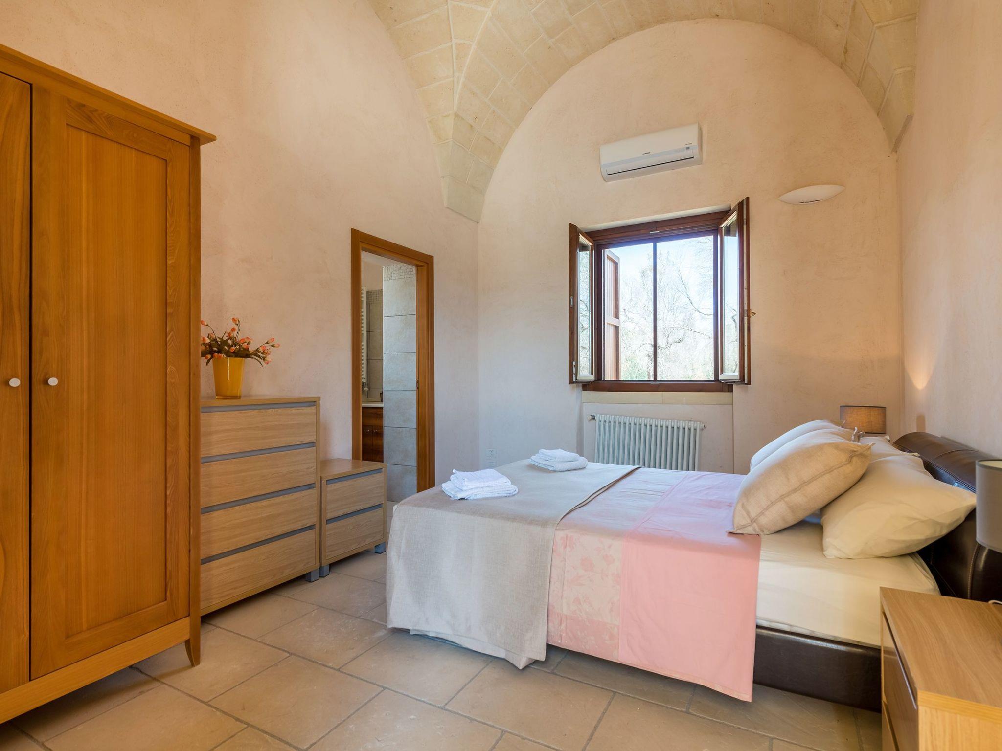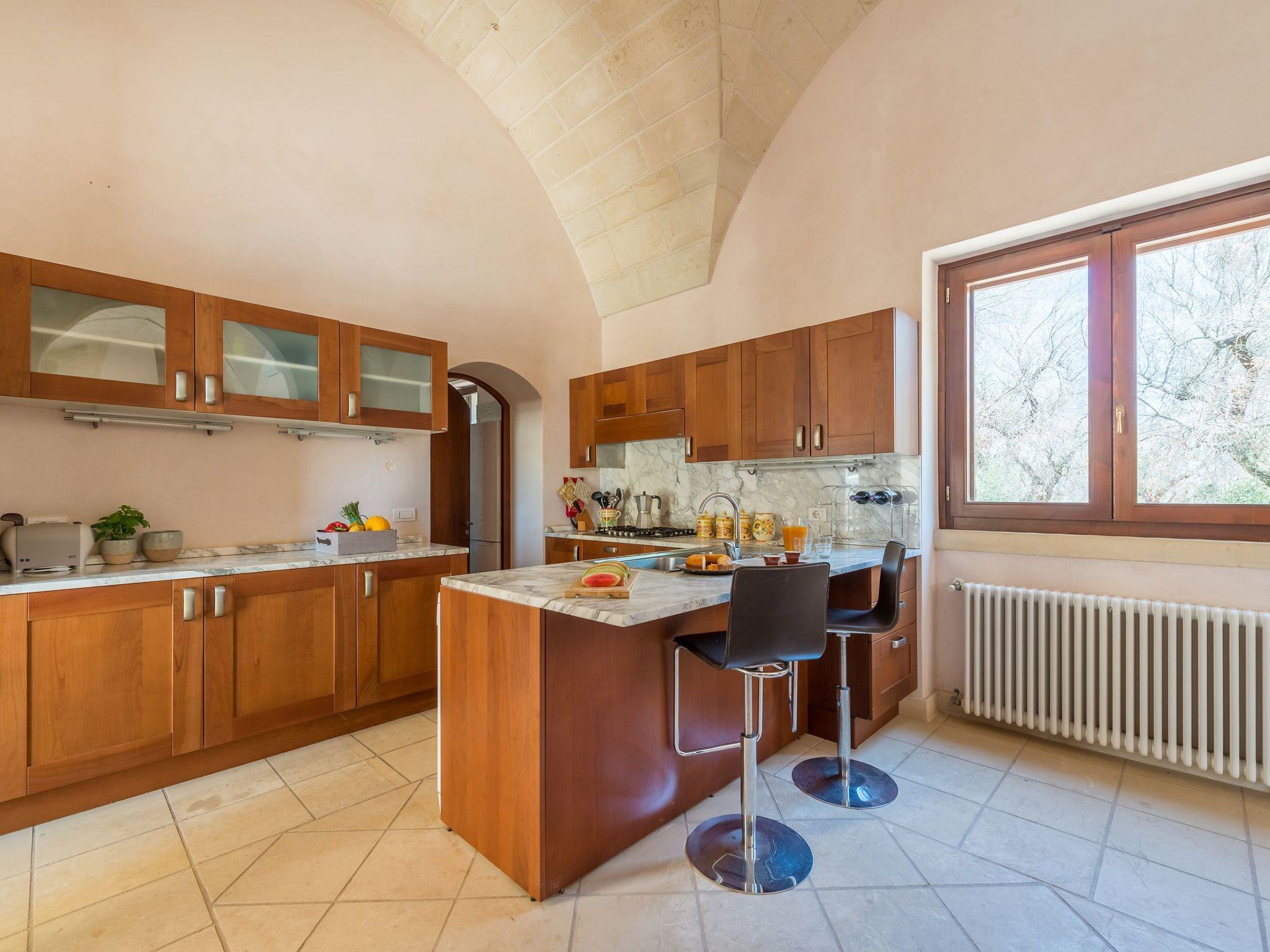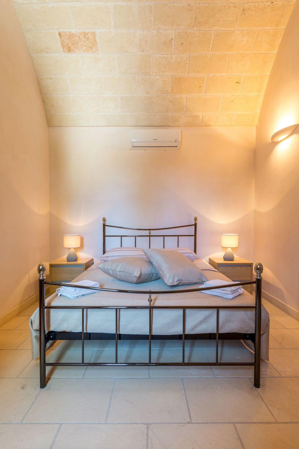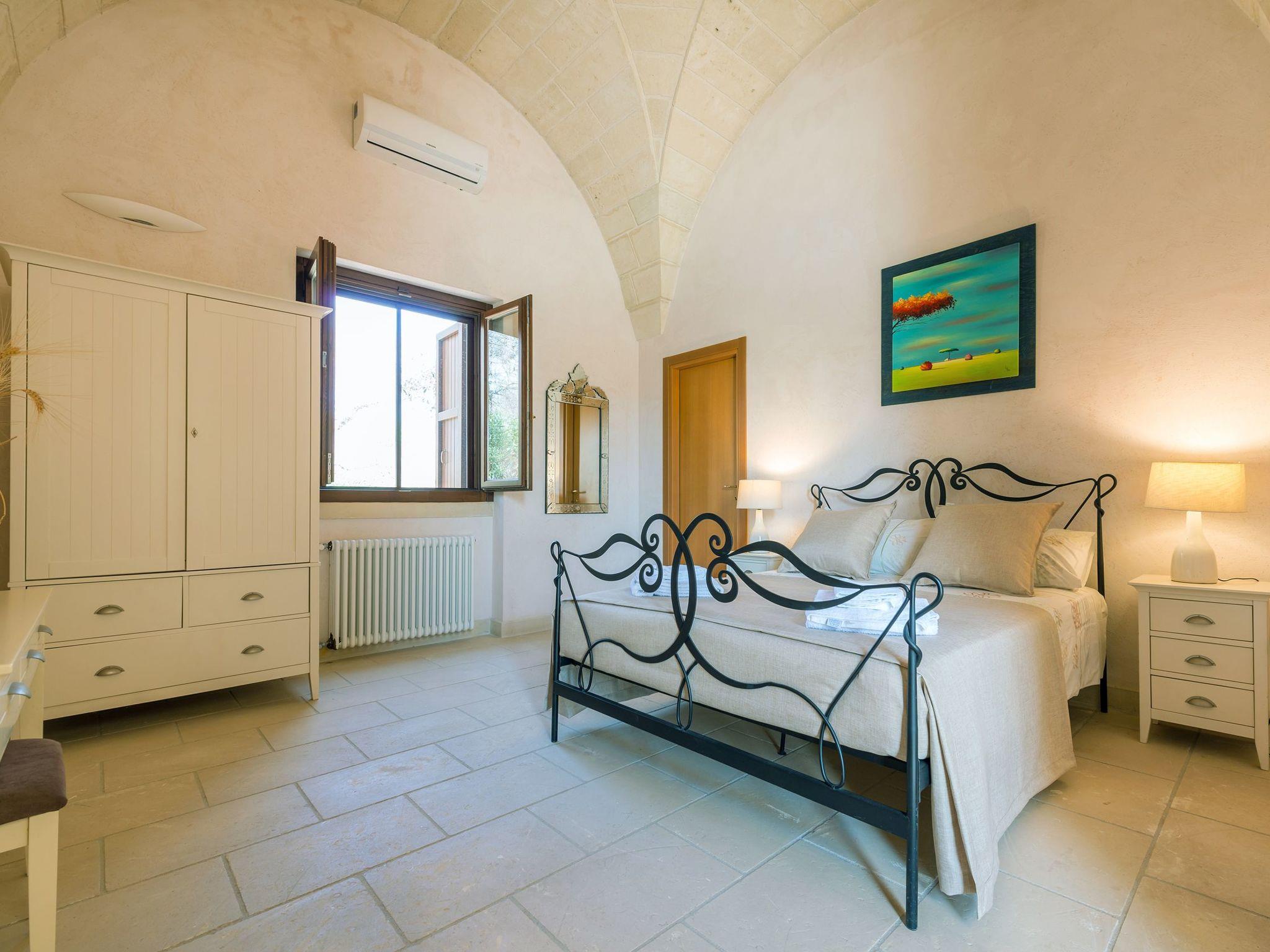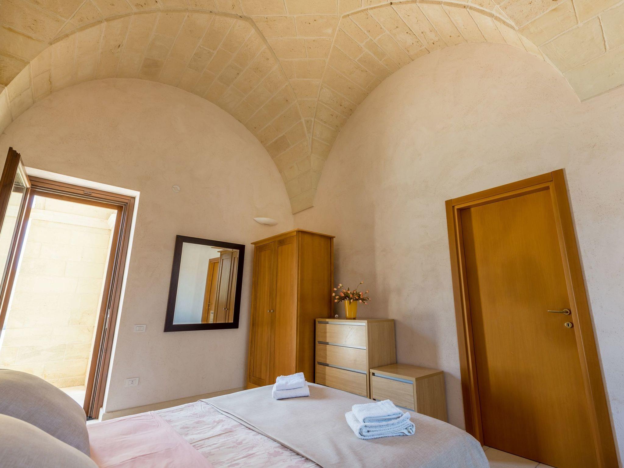Ideal villa for those who love large spaces and maximum privacy. This property offers its visitors the typical characteristics of the ancient Salento farmhouses: central cloister, high "star" vaults, local Lecce stone. It is located in the center of a large land planted with olive groves. To make your stay more pleasant there is a beautiful swimming pool (10x5 meters) with majolica mosaic, a barbecue corner and a pizza oven with pergola for lunch or dinner outdoors.