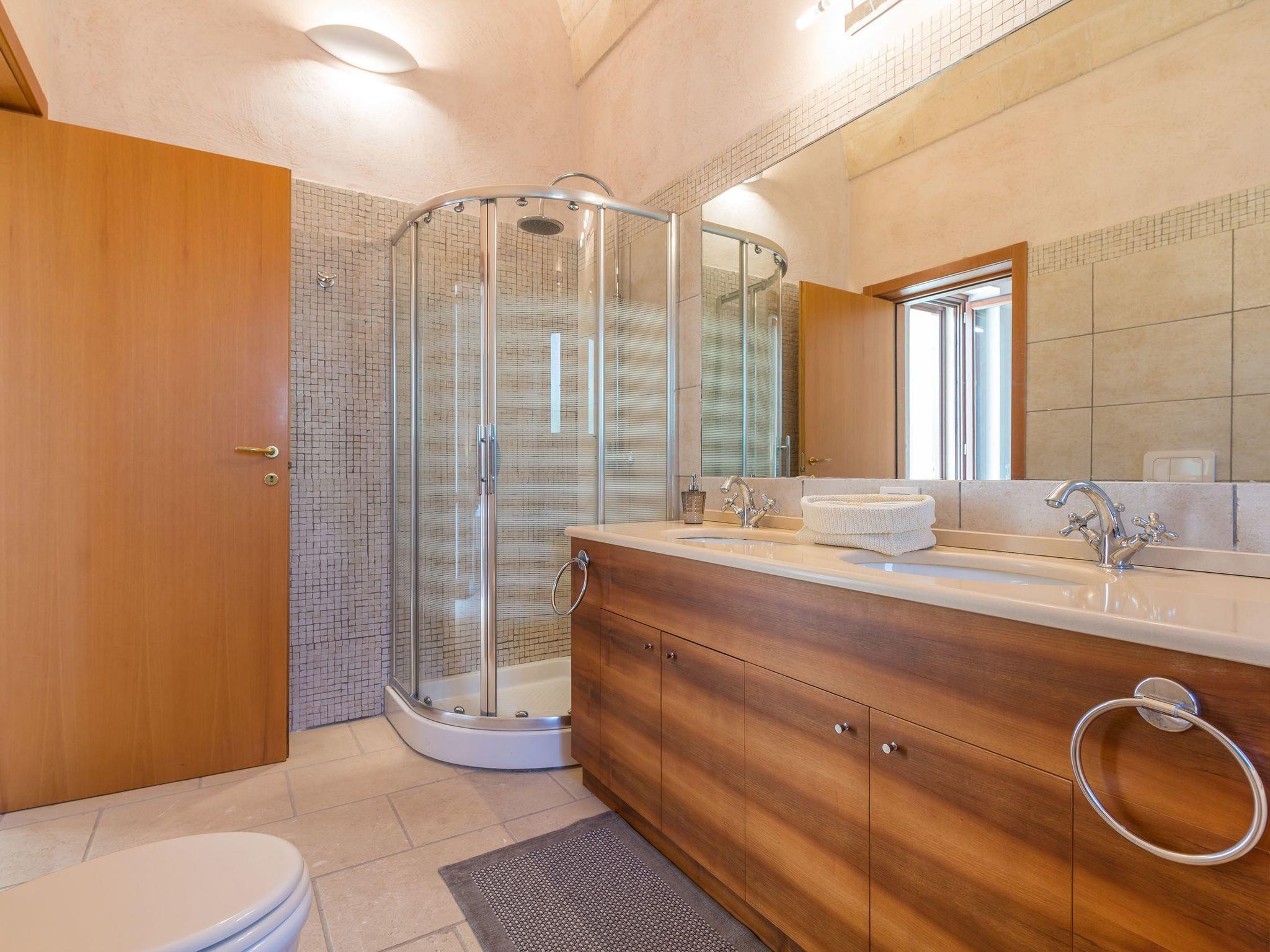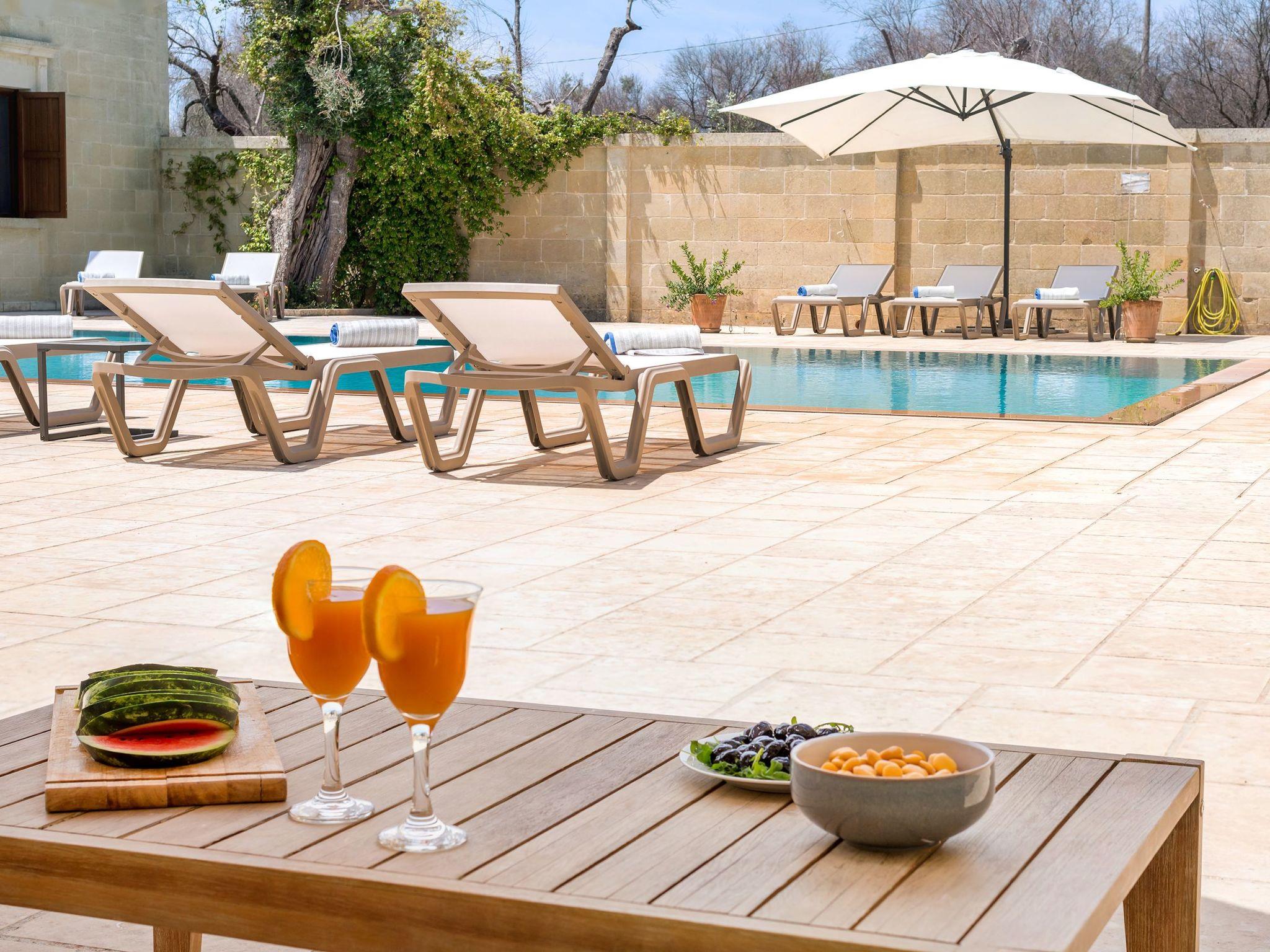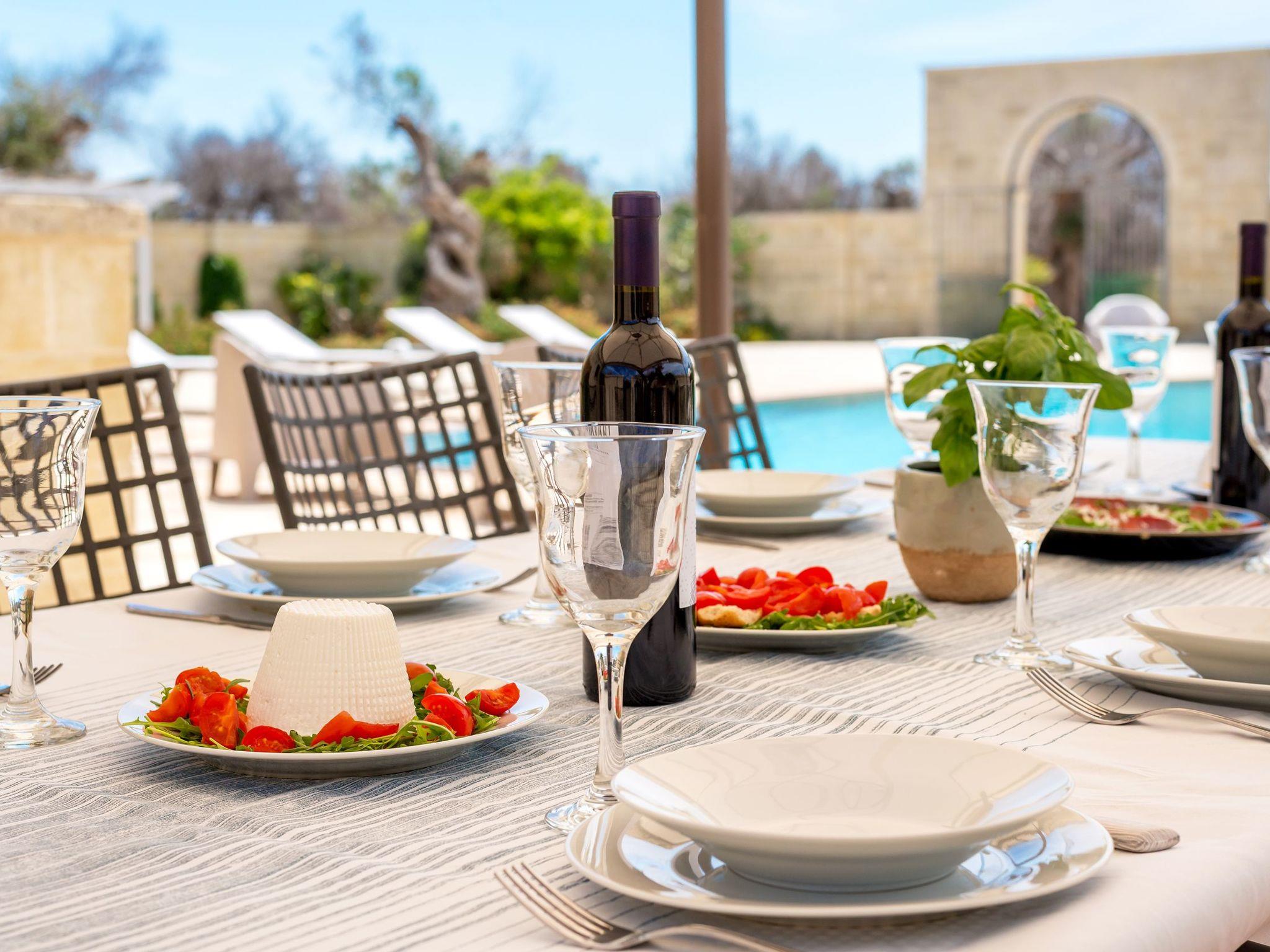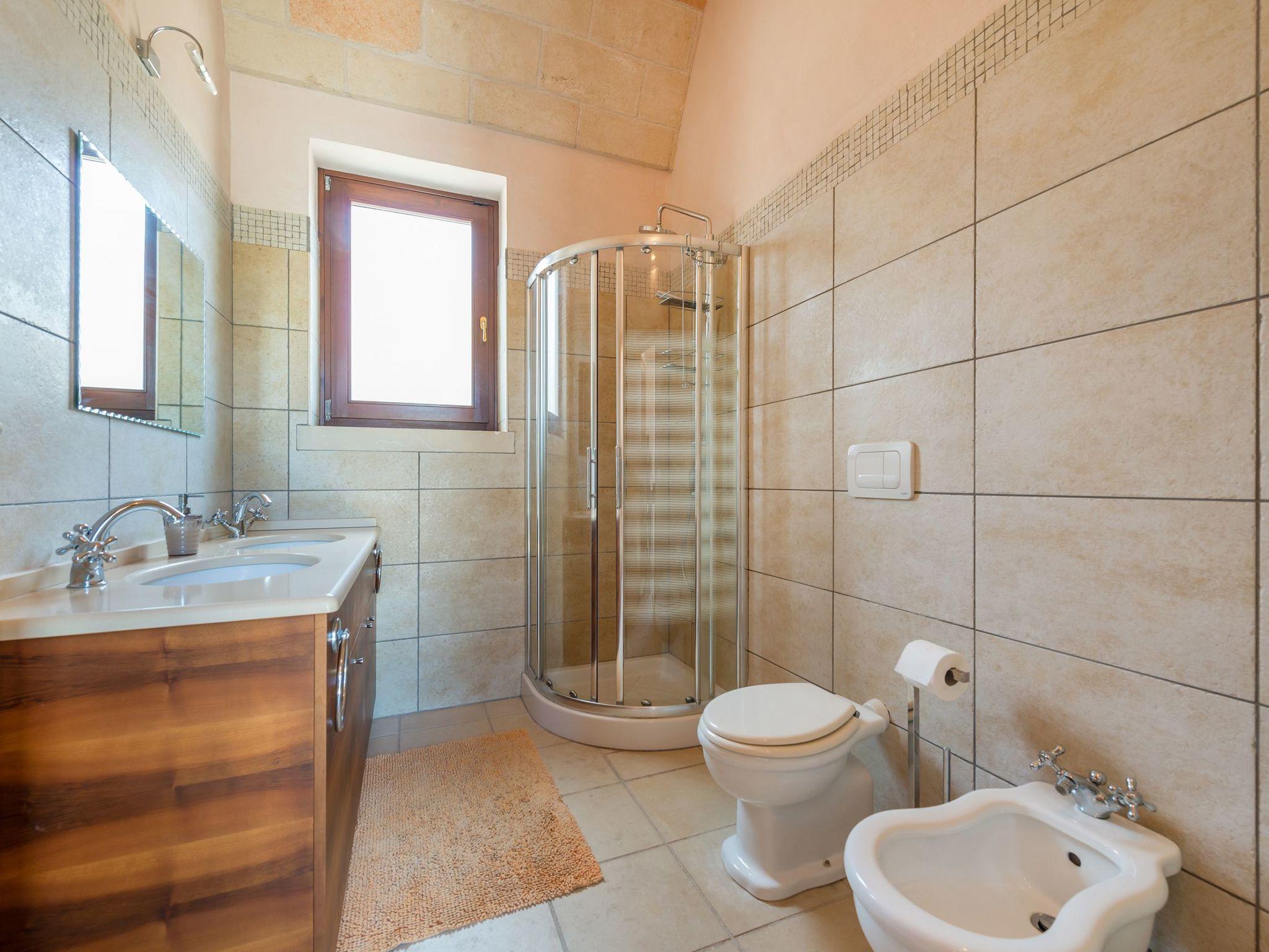 Masseria Le Cicale can accommodate 10 people with the possibility of adding two single sofa beds, up to a maximum capacity of 12 seats. The total bedrooms are 5, of which 3 with private bathroom and 2 that share a bathroom with shower (in the annex) .The property has an additional bathroom with shower accessible from the pool area, for a total of 5 bathrooms with shower.