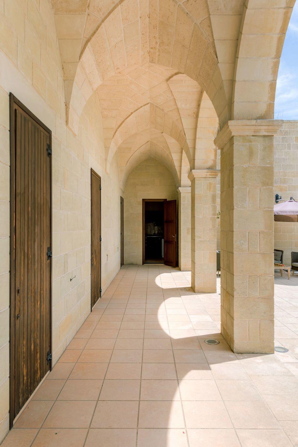 Two hectares of land with olive trees extend outside the perimeter wall, enclosed by a second fence with dry stone wall and automated gate.