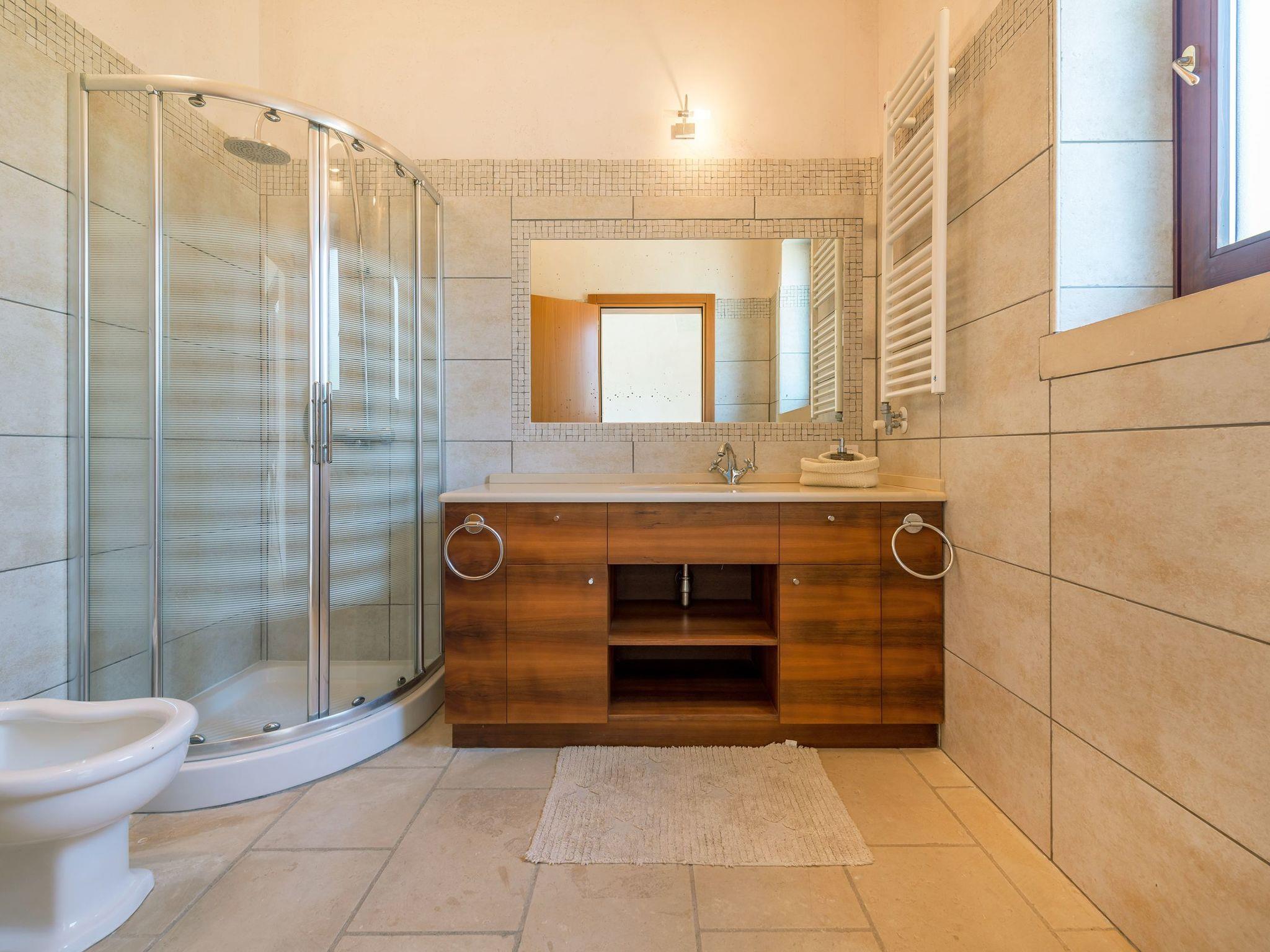 Layout: the villa consists of a central body and an annex. The central body has an "L" shape with a large living room that houses a relaxation area with sofas, armchairs and plasma TV with digital terrestrial channels, dining area, fully equipped kitchen with worktop, gas burners, electric oven and microwave , dishwasher, as well as laundry room with washing machine and large refrigerator. Adjacent, but not communicating with the living room, there are 3 bedrooms, spacious and bright, each with its own bathroom-shower. On the opposite side of the courtyard is the annex with two other bedrooms, which share a bathroom with shower. In the property there is an additional bathroom with shower accessible from the pool area.