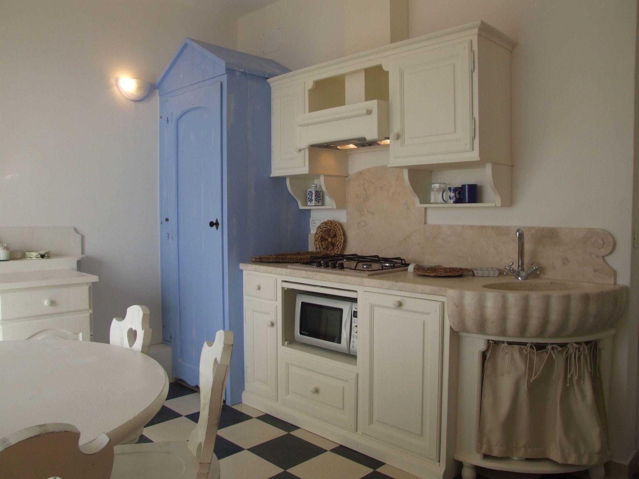 From this room there is access to a balcony overlooking the sea, furnished with a marble table and wrought-iron chairs. A door on the front right leads to the dining room, where there is a dining table and two sofas that can be converted into single beds. The kitchen is very well equipped with a gas cooker, microwave, refrigerator with freezer, toaster, kettle, mocha and filter coffee machines and dishwasher. This room overlooks a balcony with a breathtaking view.