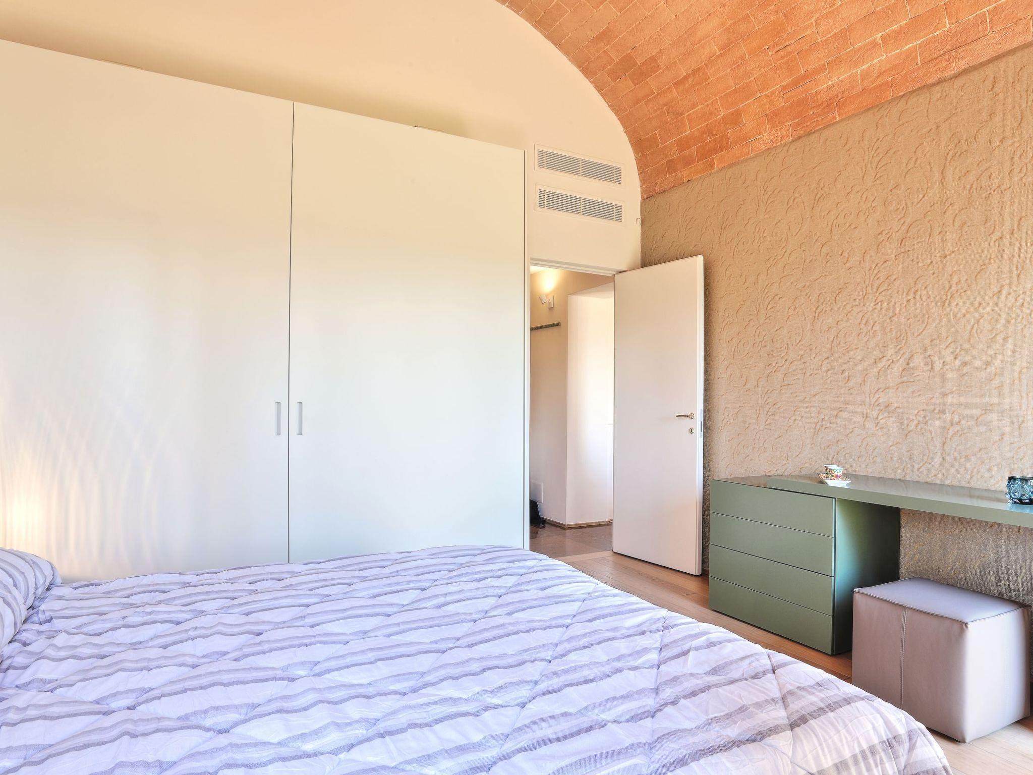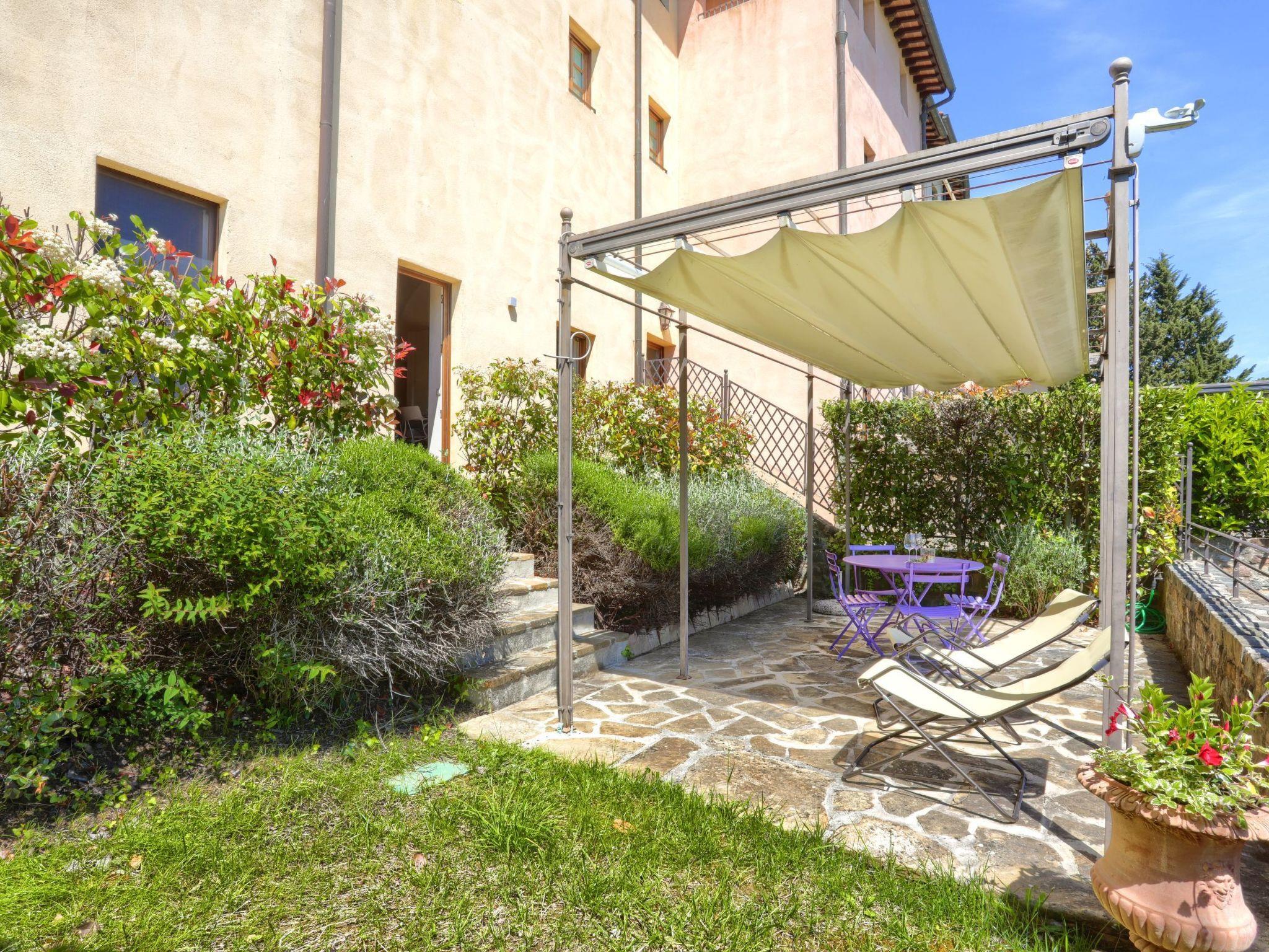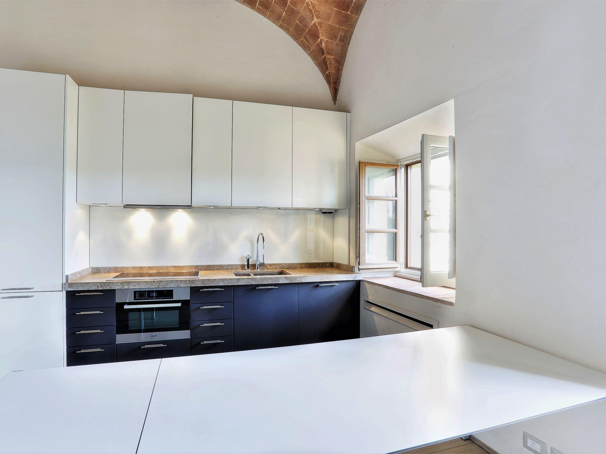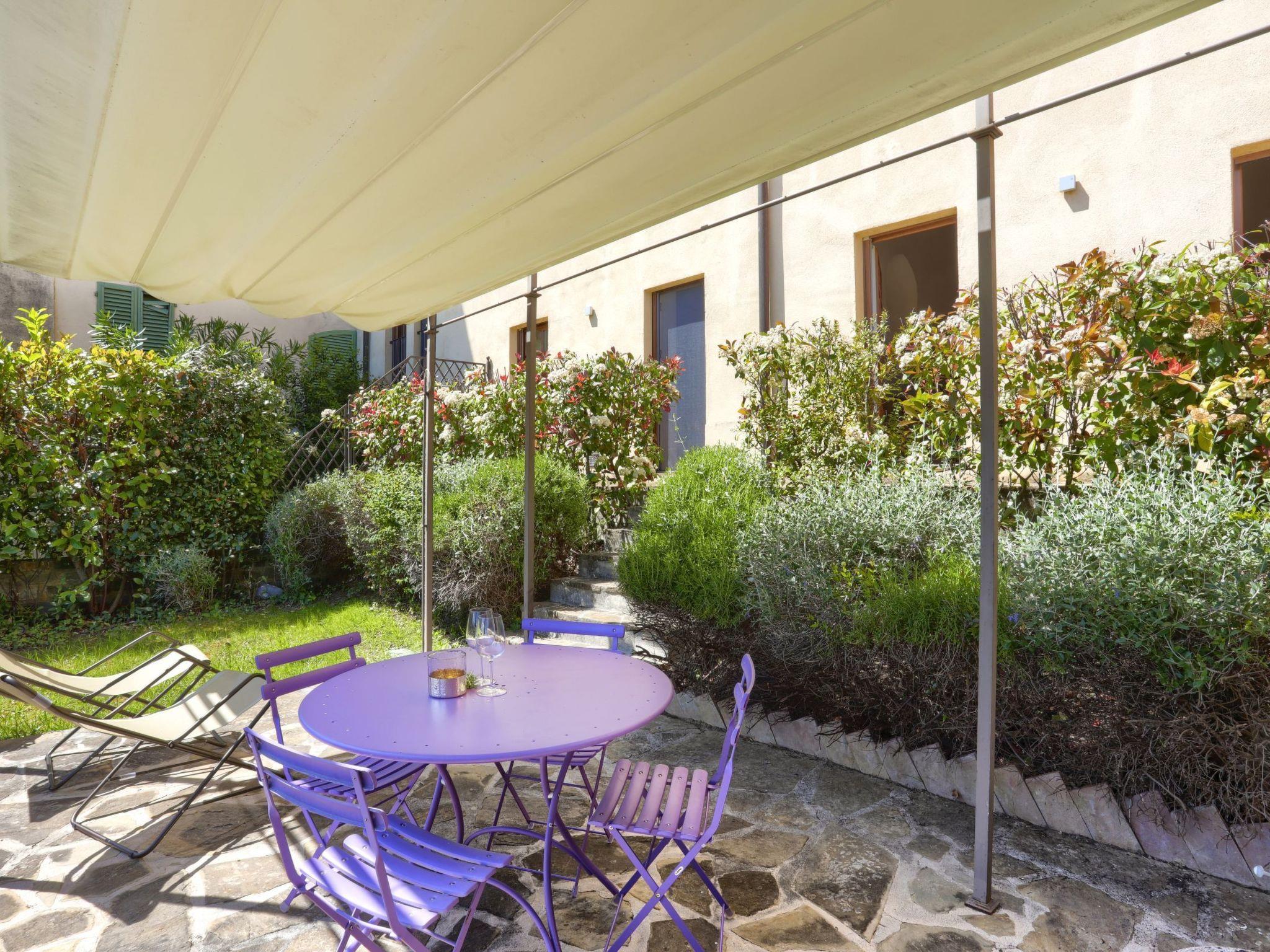 The flat of about 50 sq. m. inside the ancient palace flanking the Borgo, completely renovated and furnished with great attention to detail, opens onto a large living area with kitchen and living room from which, through a glass door, there is access to the delightful patio covered by a pergola and a 65 sq. m. garden with a view of the hills and the swimming pool. A sofa bed for two persons is available in the living room.