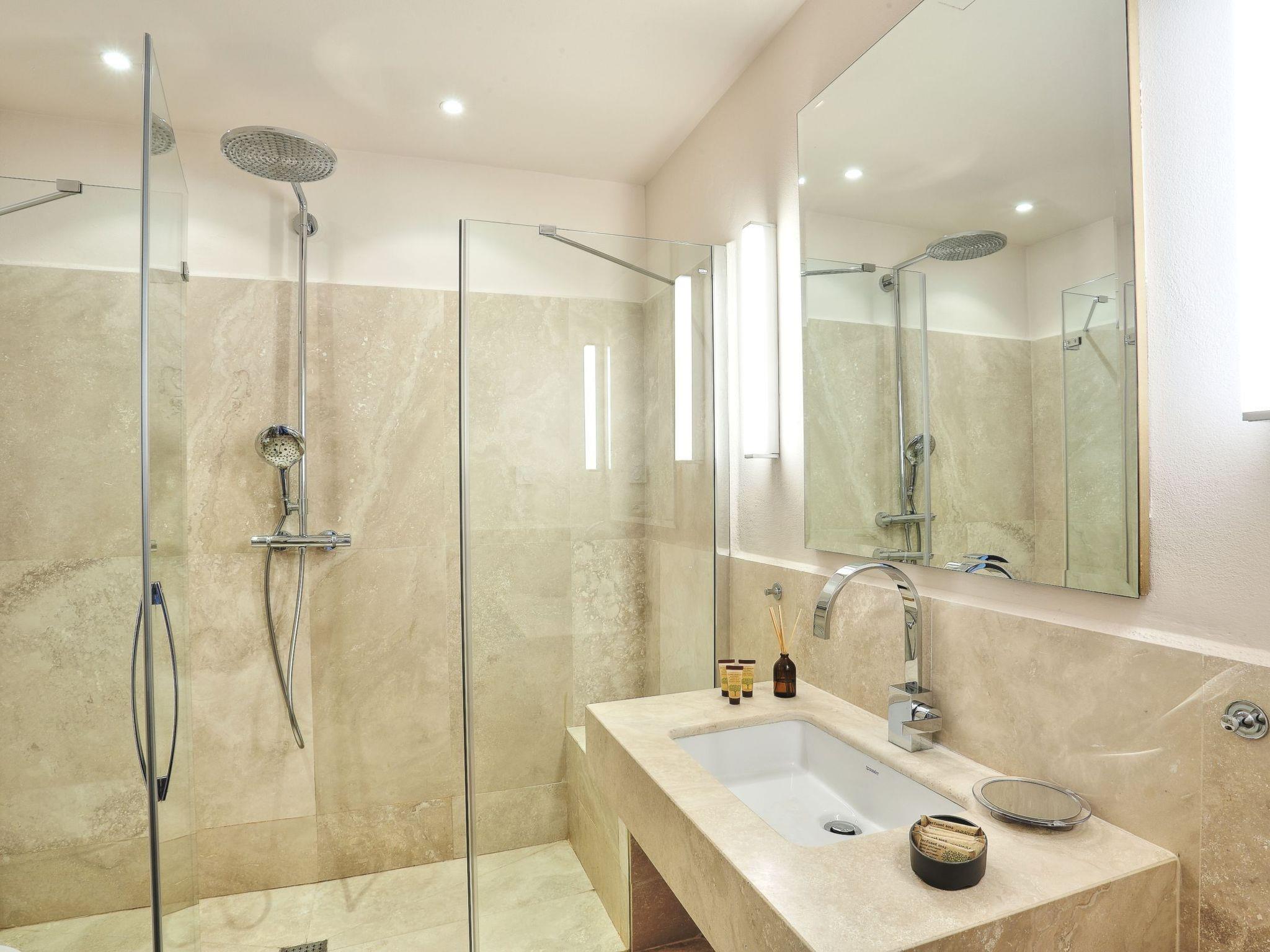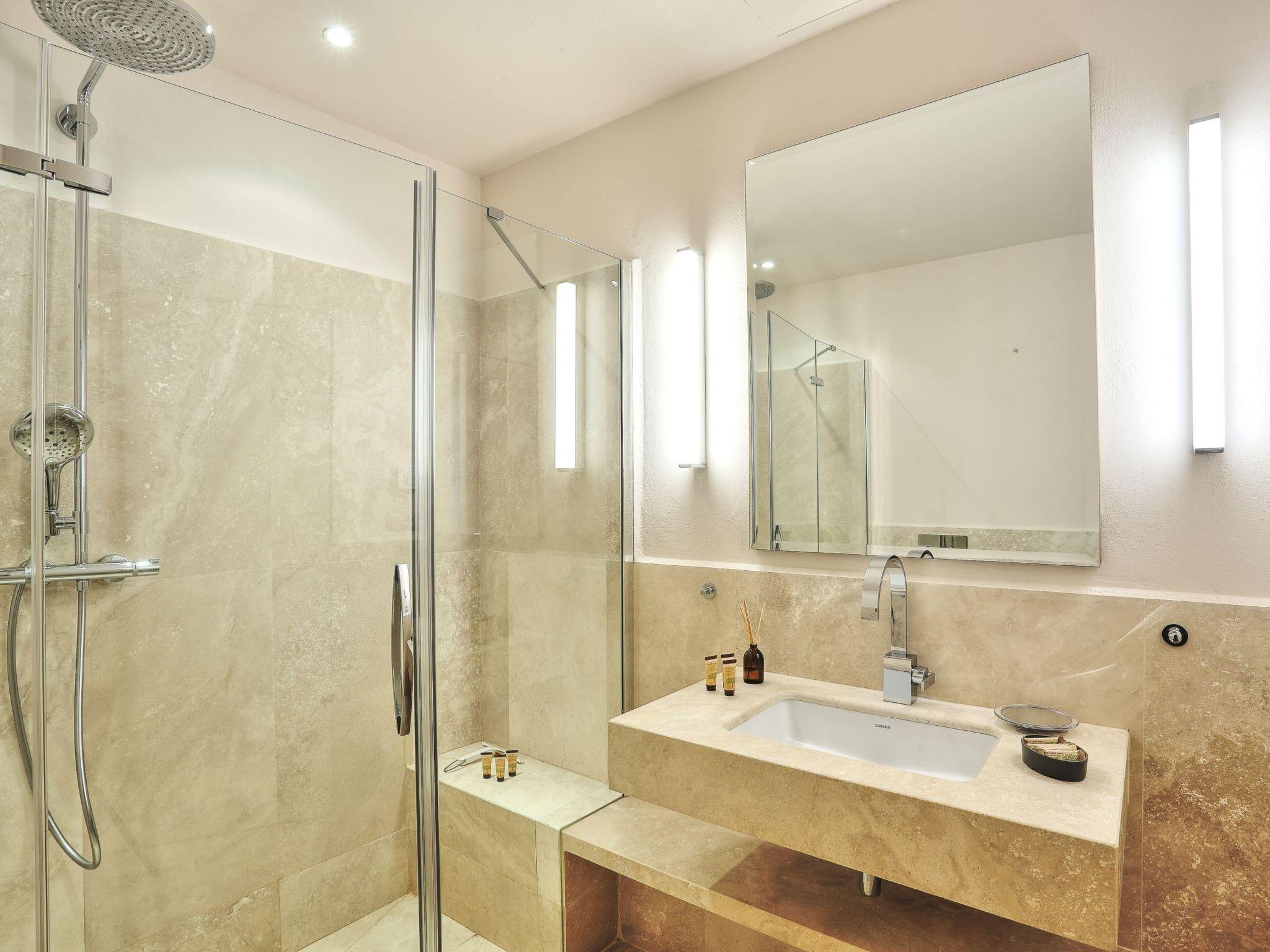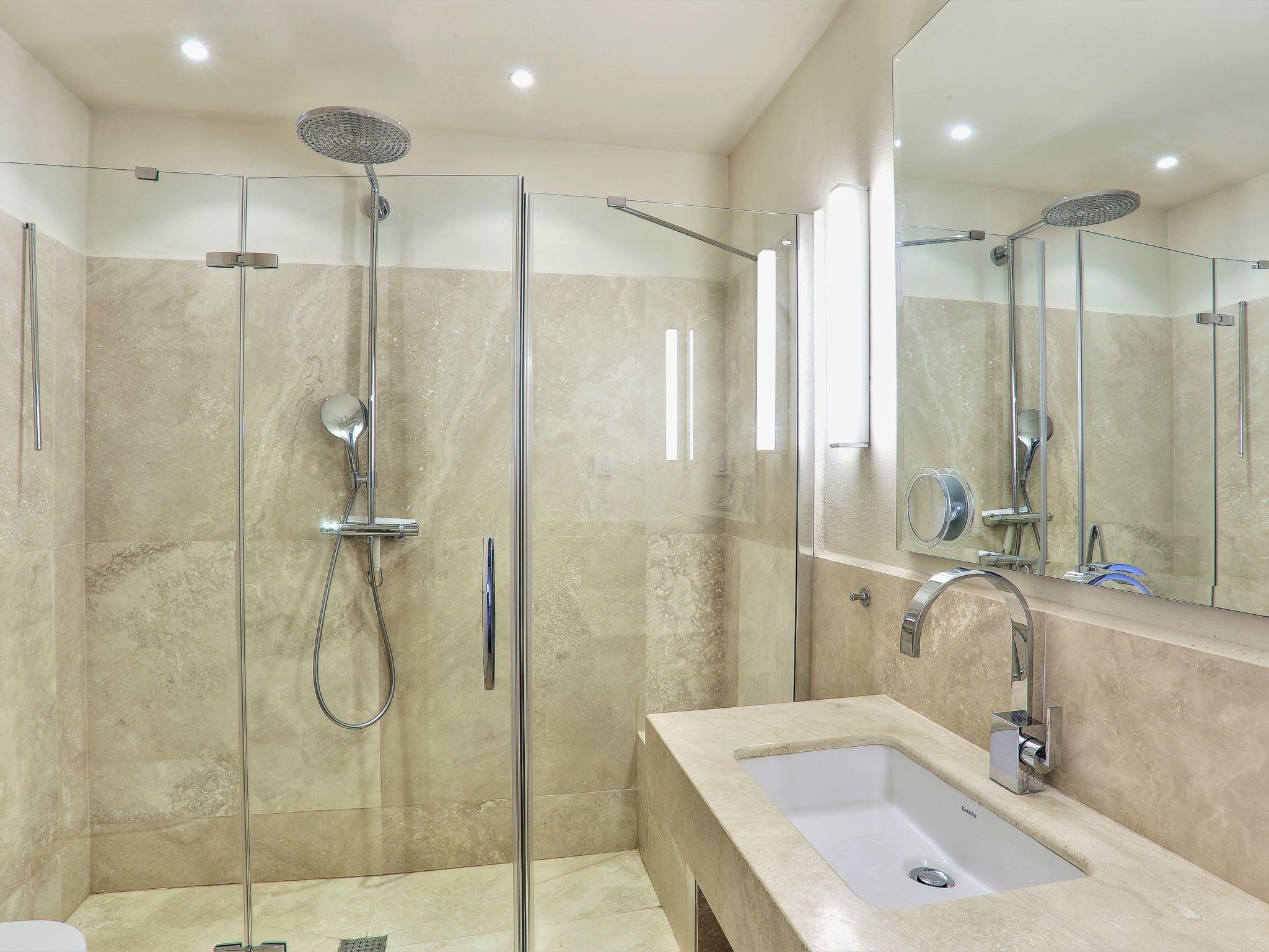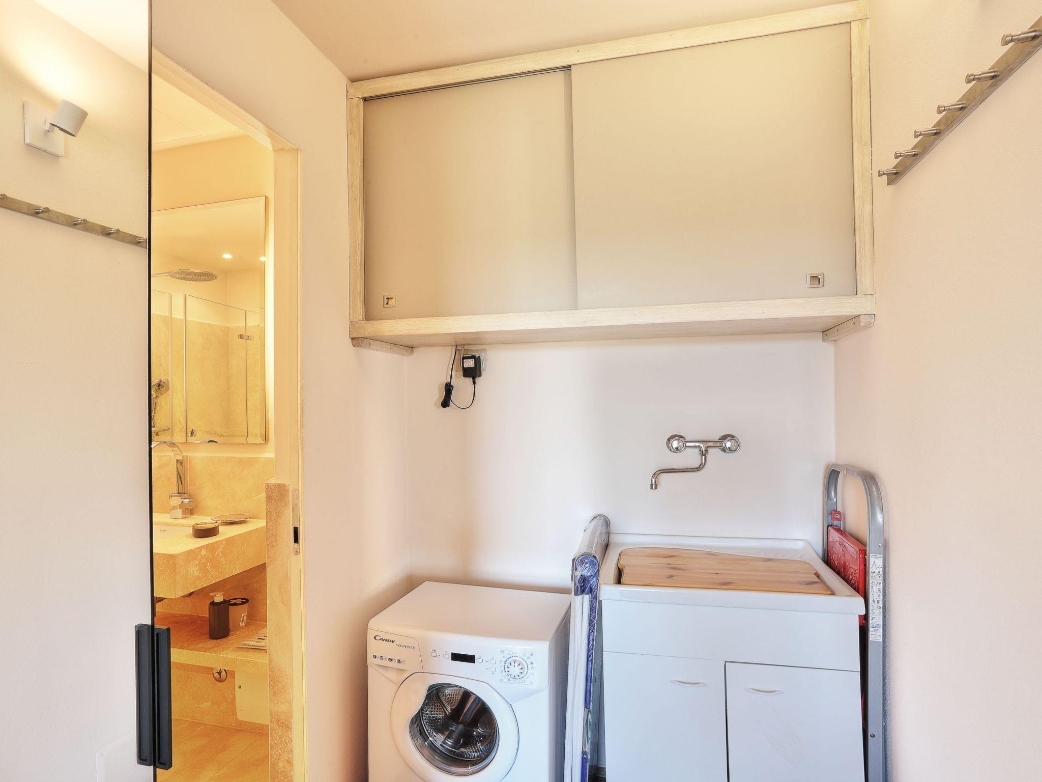 There is a double bedroom, also with access to the garden, and a bathroom with a large rain shower, ante-bathroom with washing machine.