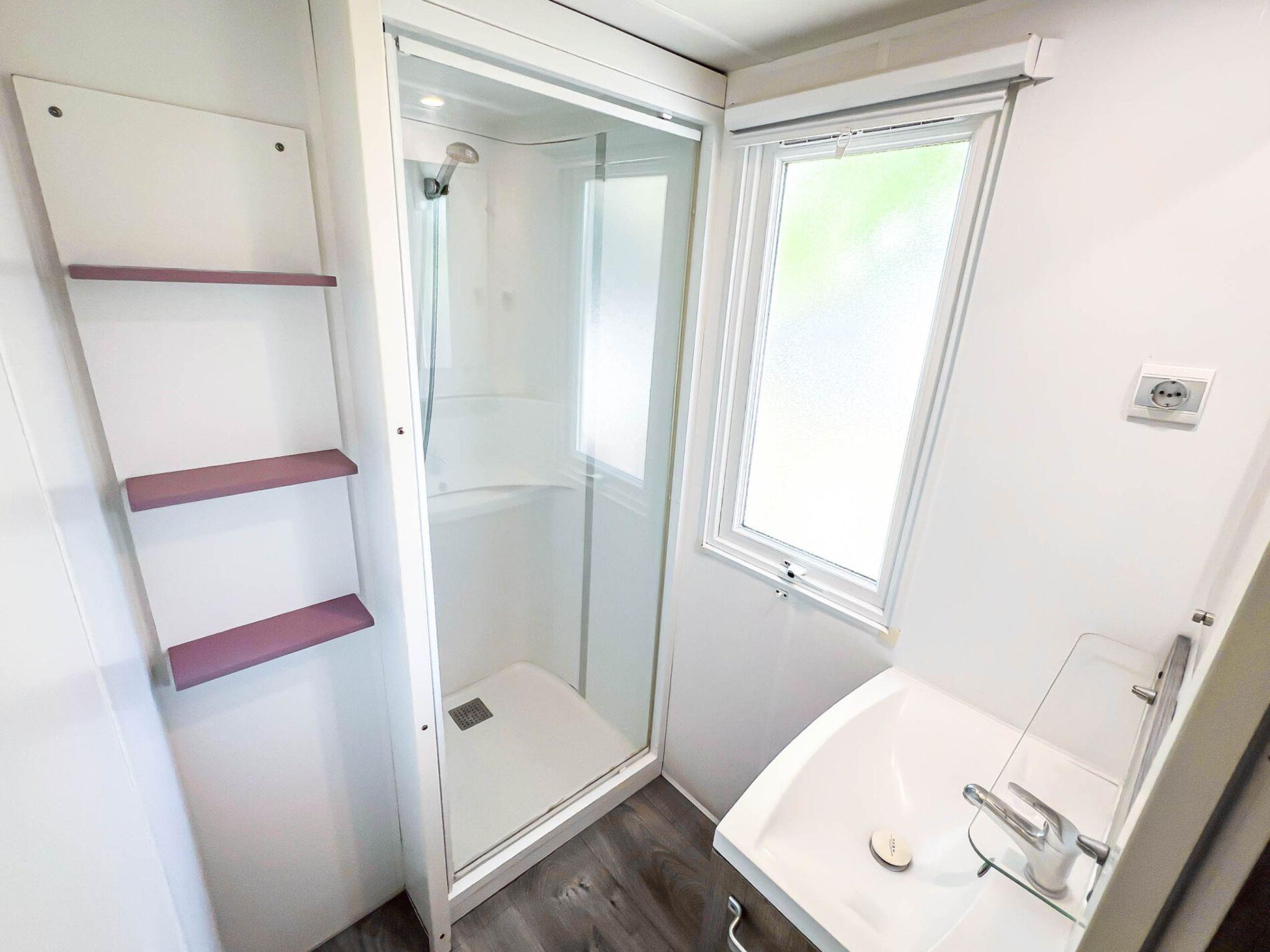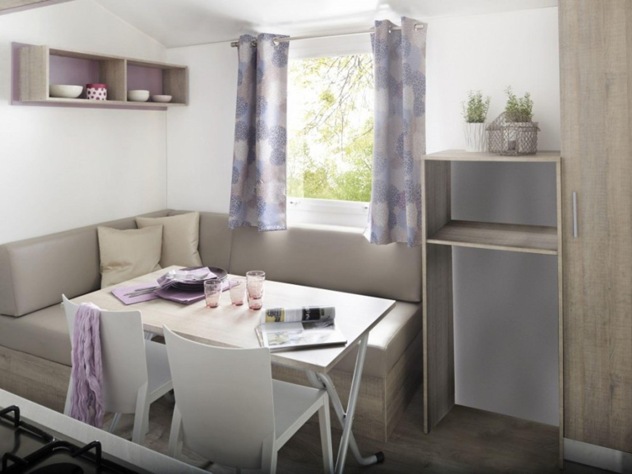 "Happy Comfort", 3-room mobile home 25 m2. Practical furnishings: living/sleeping room with 1 sleeping facility (120 cm, length 200 cm), dining table, electric heating and air conditioning. 1 room with 1 french bed (140 cm, length 190 cm). 1 room with 2 beds (70 cm, length 190 cm). Open kitchen (4 hot plates). Shower/WC. Air-conditioning (extra). Terrace partly roofed. Terrace furniture, electric barbecue (portable), deck chairs (2). Facilities: mosquito net. Parking (1 car). Please note: non-smokers only. Maximum 1 small pet/ dog allowed. IT003043B16L25GVPL