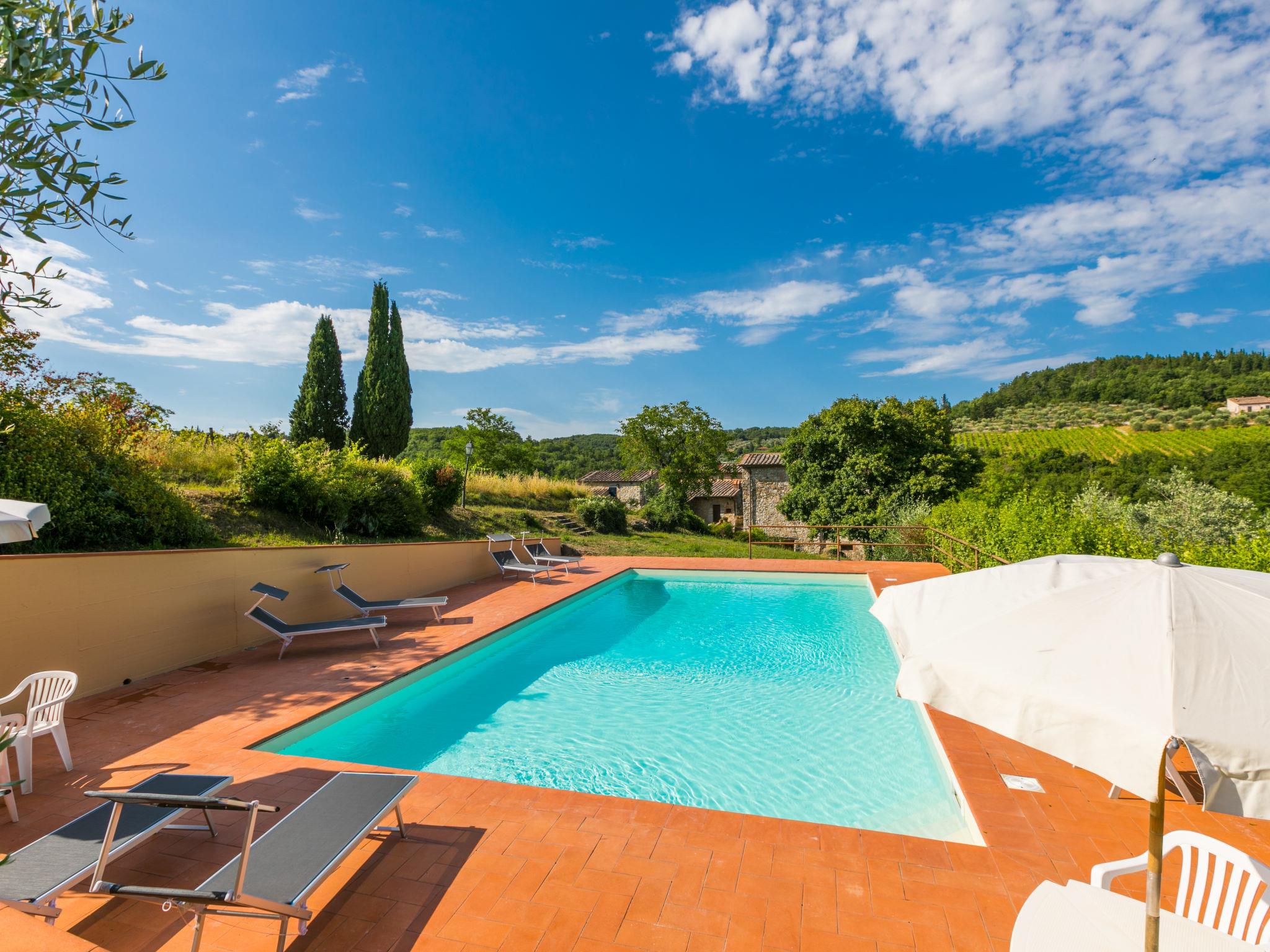 Castellina in Chianti: Cosy, rustic country house "Cerretino", surrounded by fields and vineyards. 3 houses in the residence. 1 km from the centre of Castellina in Chianti, in a sunny position, 200 m from the edge of the forest, in the countryside. For shared use: natural state property, swimming pool (6 x 12 m, depth 100 - 180 cm, seasonal availability: 15.May. - 15.Oct.). Outdoor shower, patio, terrace, garden furniture, pool maintenance by the owner/gardener. In the house: air conditioning, washing machine, tumble dryer (for shared use). 300 m long very bumpy, narrow motor access to the house. Parking at the house. Shop 1 km, grocery 1 km, supermarket 1 km, restaurant 1 km, bar 500 m, bakery 1 km, pedestrian zone 1 km, 15 minute walk to the centre, bus stop 1 km, sandy beach "Cecina Mare" 88 km, thermal baths "Rapolano Terme" 50 km. Walking paths from the house 200 m. Nearby attractions: Panzano in Chianti 13 km, Greve in Chianti 20 km, Gaiole in Chianti 20 km, Siena 26 km, San Gimignano 42 km, Firenze 50 km. Please note: baby equipment (included).