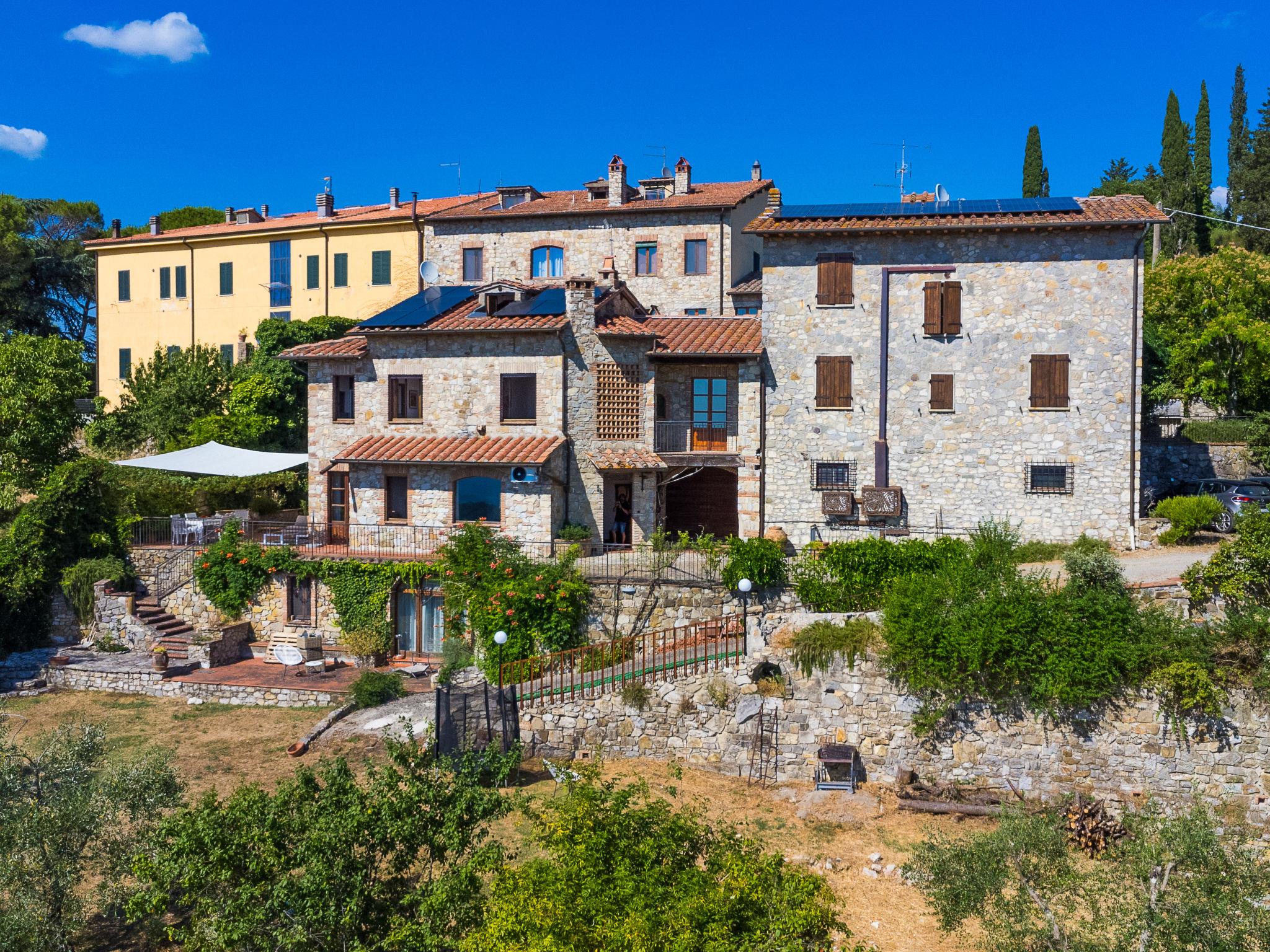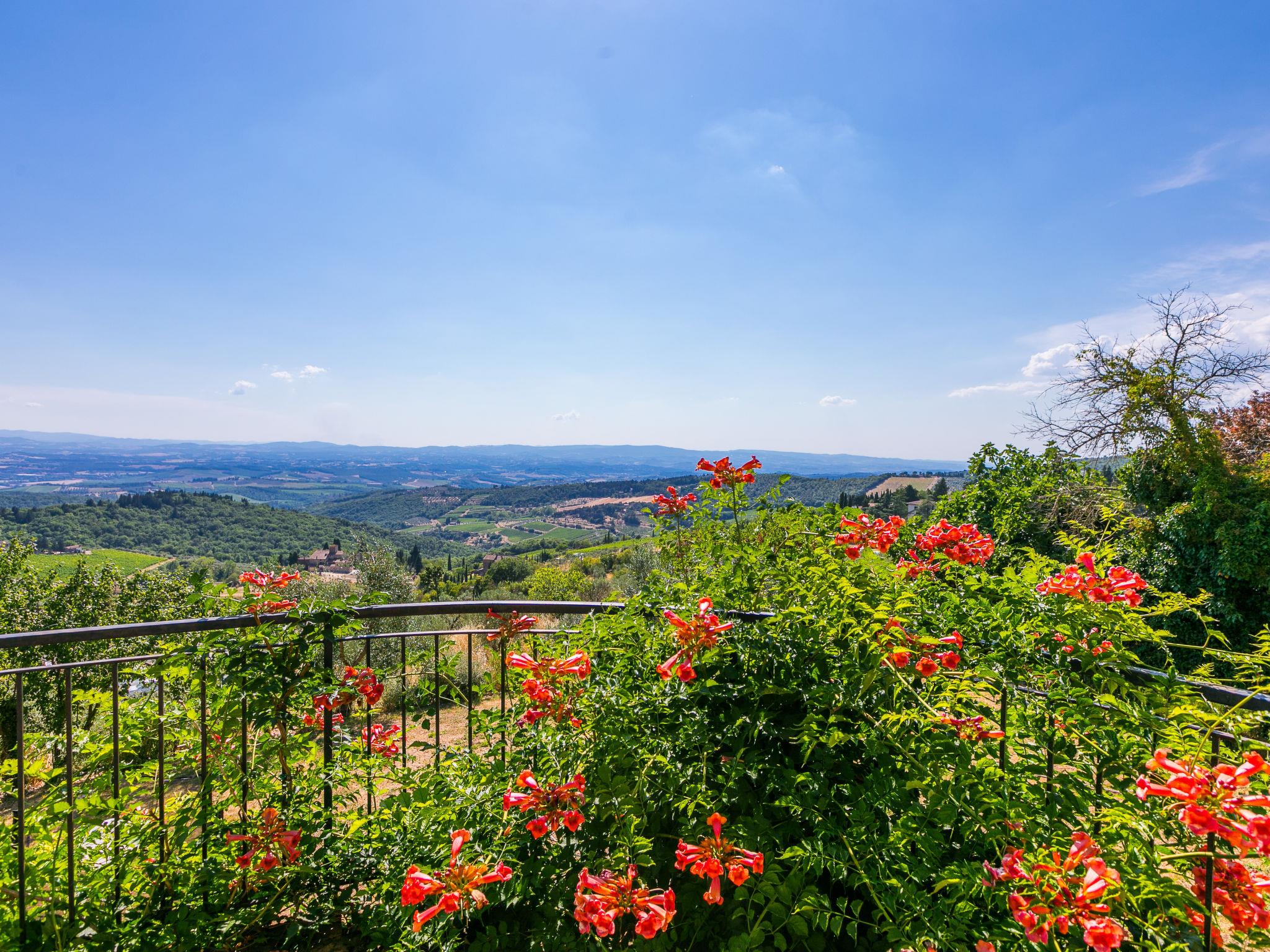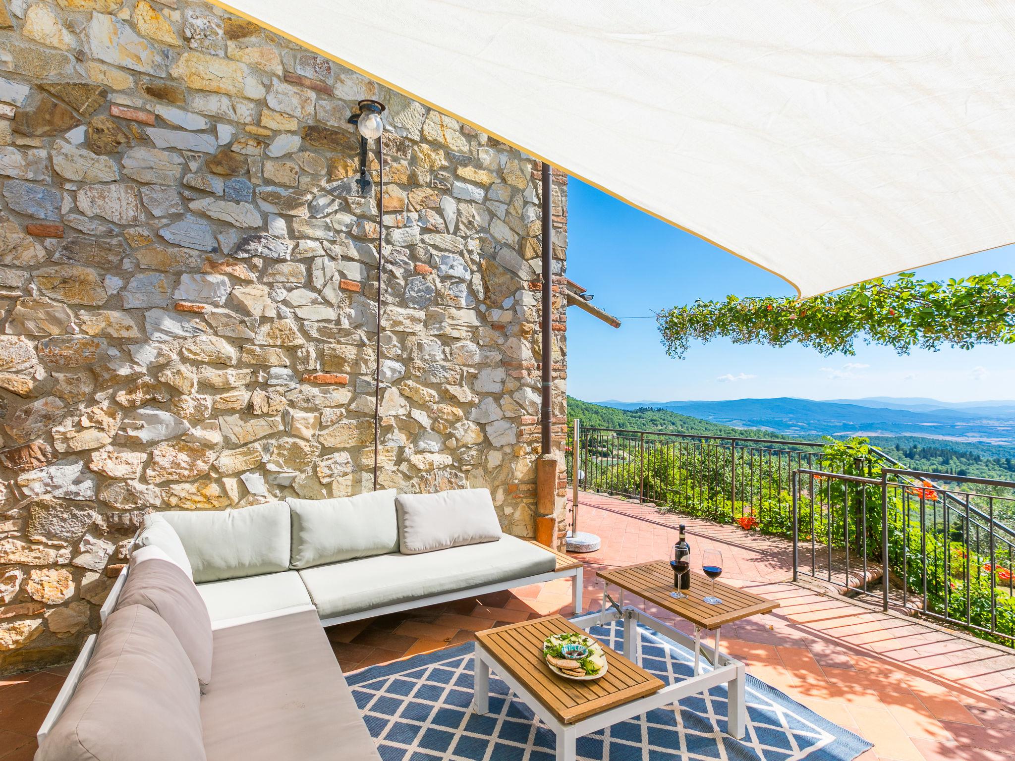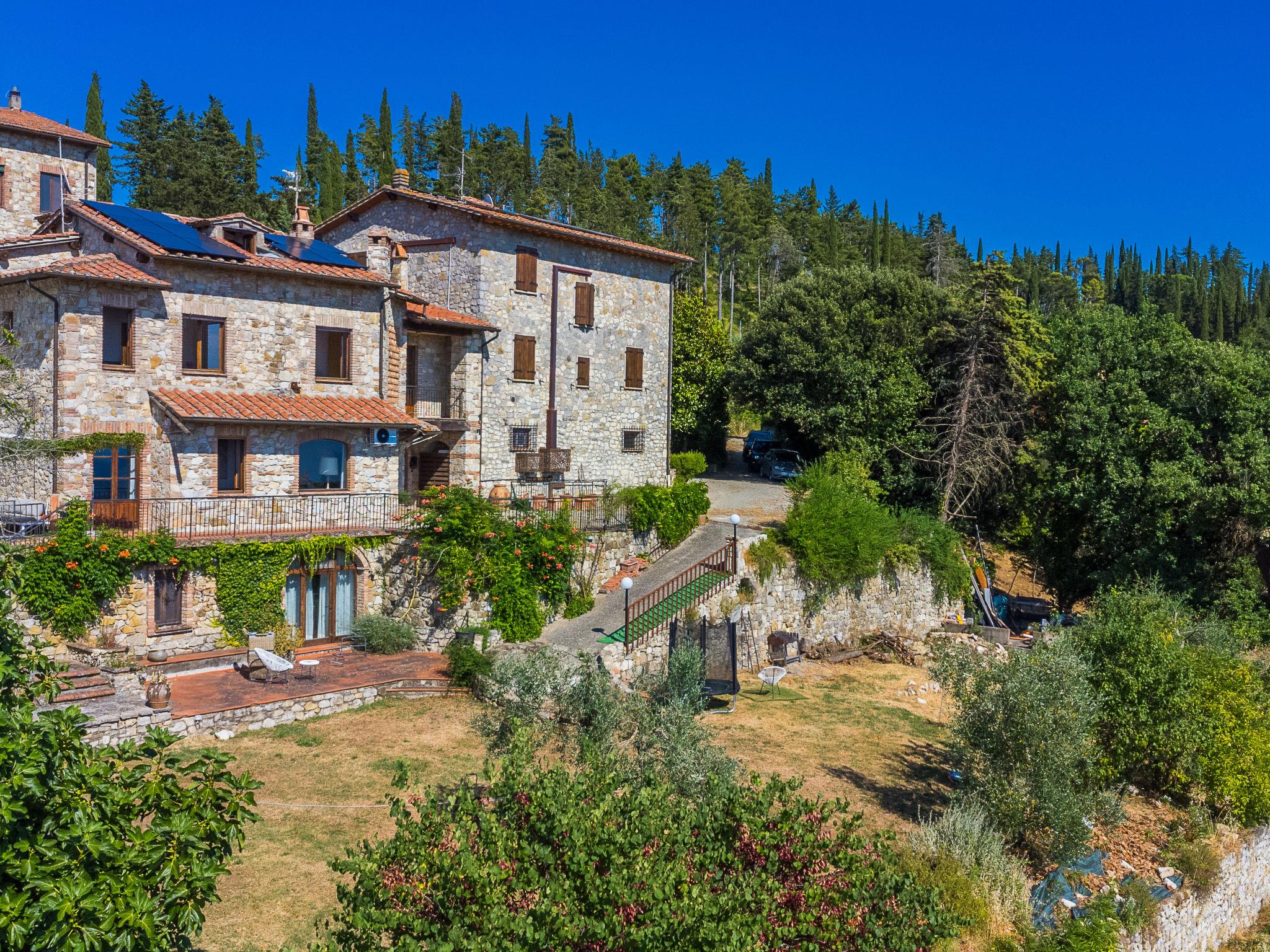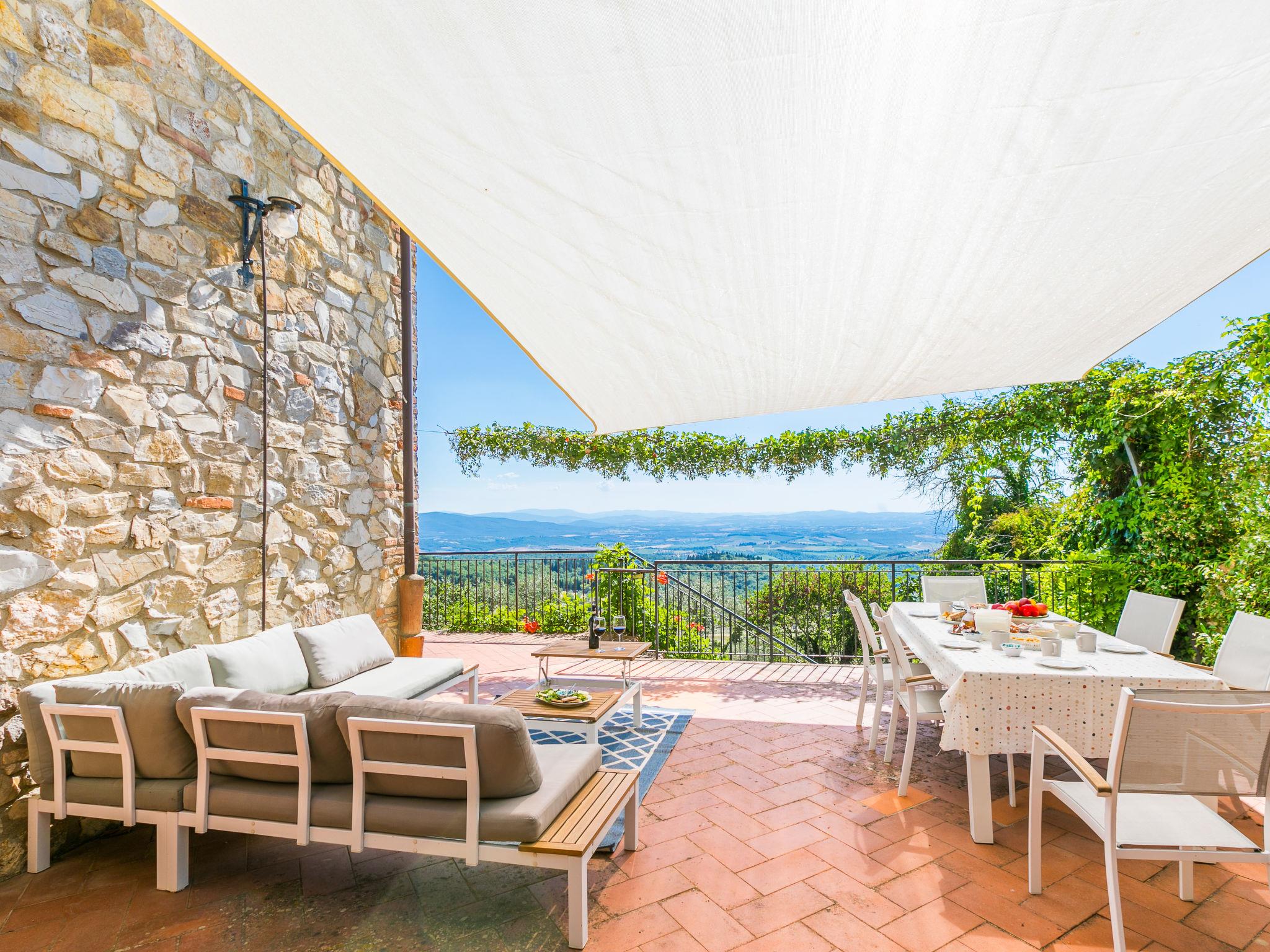 "Terrazza sul Chianti", 7-room semi-detached house 150 m2 on 3 levels. Spacious and bright, renovated in 2025, very tasteful and cosy furnishings: entrance hall. Large living room with panoramic window west facing position with open-hearth fireplace and TV (flat screen), air conditioning. Exit to the terrace. Open dining room with kitchen corner and air conditioning. Exit to the garden. Large, open kitchen (oven, dishwasher, Gas stove, 5 gas rings, toaster, kettle, microwave, freezer, electric coffee machine, Capsules for coffee machine (Nespresso) extra) with air conditioning. Exit to the terrace. Sep. WC. Upper floor: 1 large double bedroom with shower/bidet/WC and TV (flat screen), air conditioning. Exit to the balcony. 2 double bedrooms, each room with shower/bidet/WC and air conditioning. 1 double bedroom with air conditioning. Shower/bidet/WC. 2nd upper floor: open large living/sleeping room with sloping ceilings, ceiling height 100 - 220 cm with 1 bed (80 cm), 1 sofabed (130 cm), open-hearth fireplace (only for decoration), air conditioning. Exit to the balcony. Heating, air-conditioning. Parquet floors, natural stone floors. Large terrace partly roofed, west facing position, patio. Terrace furniture, barbecue, box-room. Marvellous panoramic view of the countryside. Facilities: washing machine, safe, iron, mosquito net, children's high chair, baby cot for up to 2 year olds, hair dryer, logs (extra). Internet (WiFi, free). Parking at the house. Please note: suitable for families. Non-smokers only. Private entrance, smoke alarm, fire extinguisher. IT052005C2MJMX9V8B