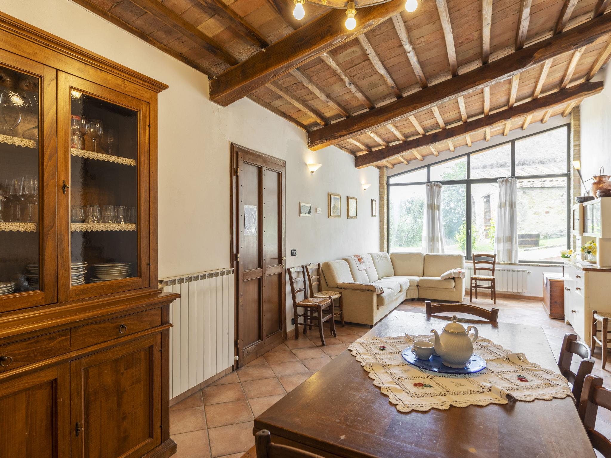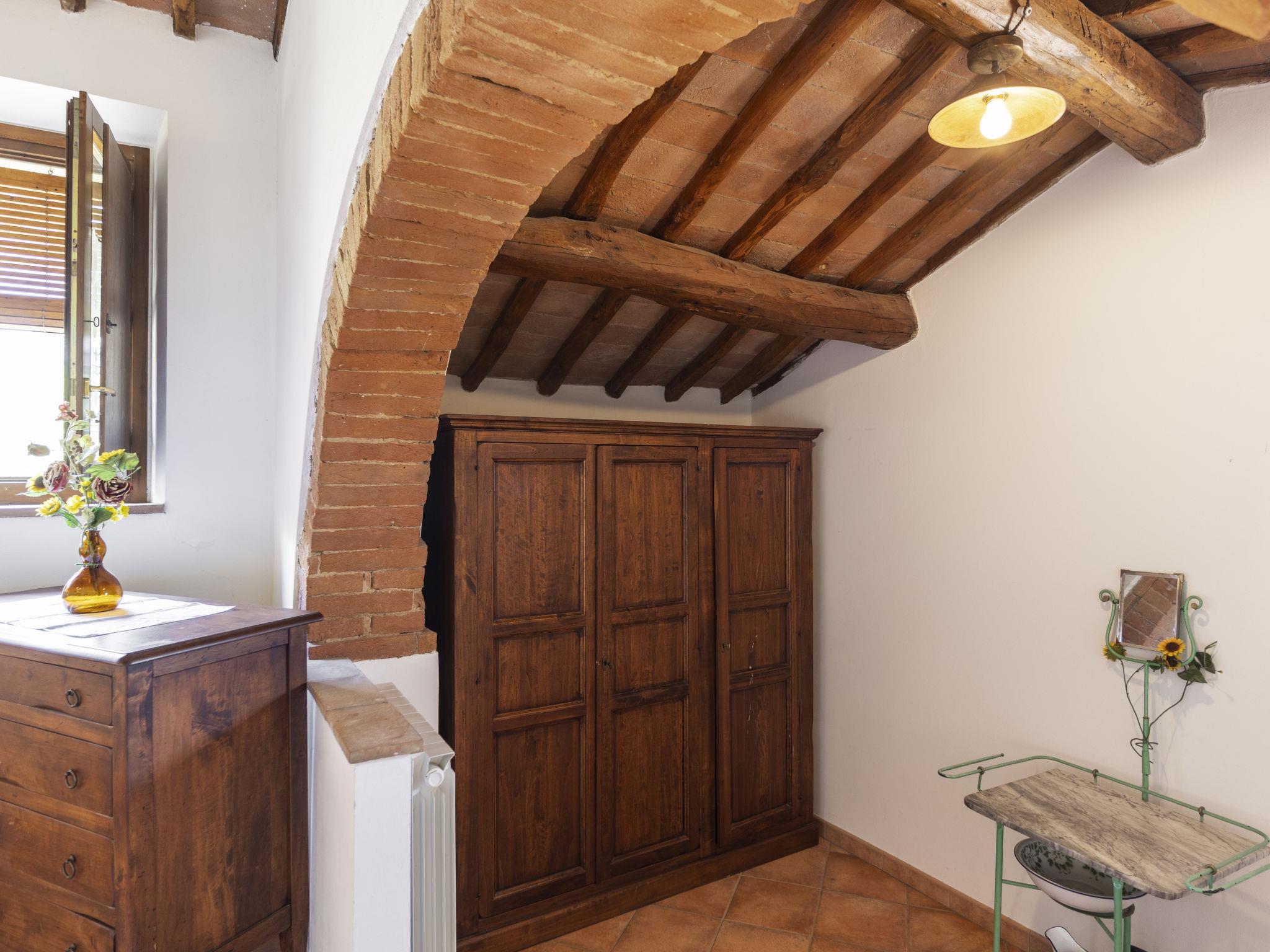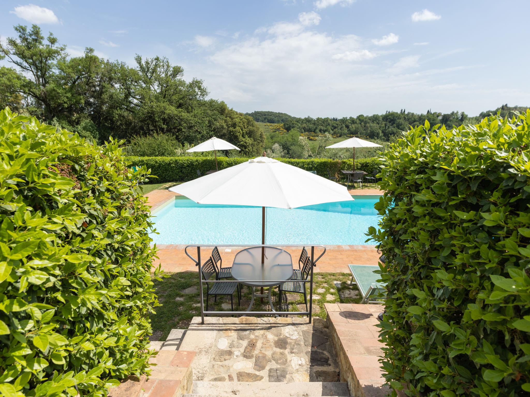 Chianti Classico 14 km from Castellina in Chianti: Dated back to the 1600, is surrounded by the magnificent Tuscan landscape, among vineyards and olive groves. Set on a small working farm there are the main house and the barn now divided in 3 units. Each apartment has independent entrance and outdoor private area. Rustic large working farm "Le Buche". 14 km from the centre of Castellina in Chianti, 38 km from the centre of Siena, 49 km from the centre of Firenze, in a quiet, sunny position, in the countryside. For shared use: swimming pool fenced (6 x 12 m, depth 130 - 230 cm, seasonal availability: 12.Apr. - 01.Nov.). Table tennis, barbecue. In the house: central heating system, heating to be paid on the spot, heating available only from 01.Nov. - 15.Apr.. Motor access to the house (600 m via unmade road). Parking on the premises. Shop 6 km, grocery 6 km, restaurant 6 km, bus stop 6 km, railway station "Poggibonsi" 6 km, thermal baths "Rapolano Terme" 64 km. Golf course (9 hole) 10 km, tennis 6 km, riding stable 10 km. Nearby attractions: Barberino Val D'elsa 16 km, San Gimignano 21 km, Monteriggioni e San Donato 22 km, Radda in Chianti 24 km, Badia a Passignano 25 km, Volterra 40 km. Local sale of farm products.