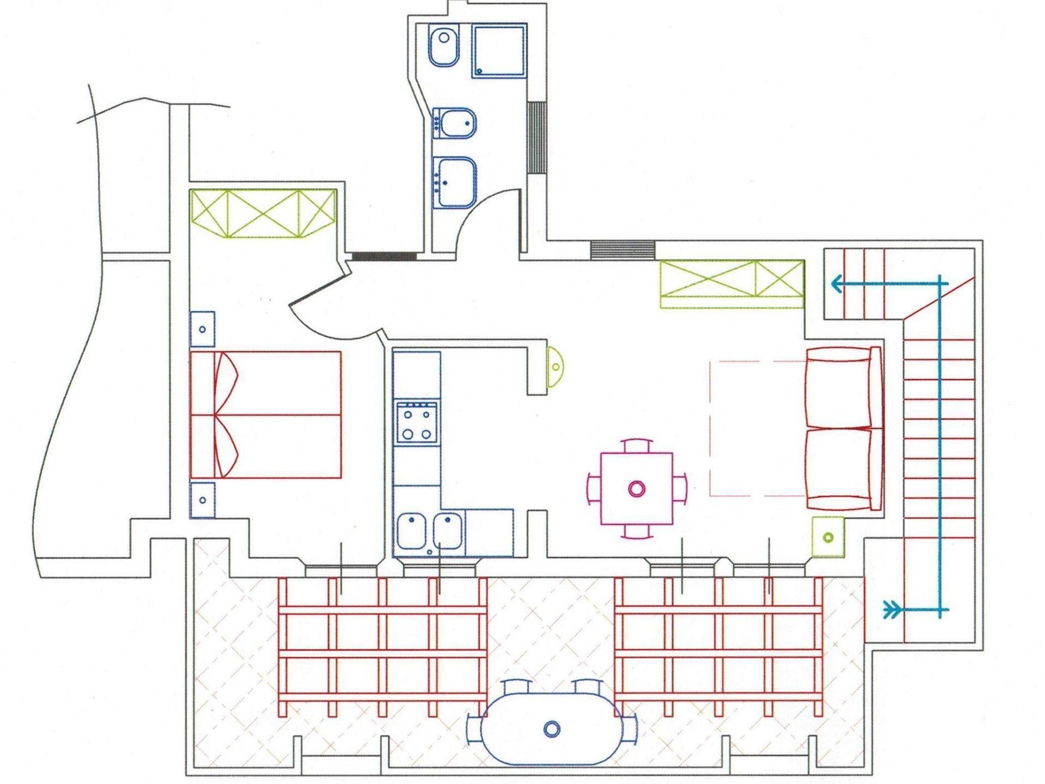 The Scoiattolo flat is a two-room flat ideal for four people and especially for a couple with two children. It consists of a living room with a double sofa bed with a regular mattress (160 x 190 cm) and a separate kitchen with appliances, dishes and a dishwasher. There is a bedroom with a double bed (160 x 190 cm). The functional and comfortable bathroom consists of a washbasin, bidet, toilet and large shower with cubicle. The flat is also equipped with mosquito nets. The flat is equipped with satellite TV, DVD, washing machine and central heating. Bed, bathroom and kitchen linen is included in the price. Baby bed free of charge.From the flat's patio with wooden tables and chairs you can enjoy a 180-degree panorama, ranging from medieval villages such as Monteverdi Marittimo to the sea. A barbecue for charcoal, made of masonry, is also at the flat's disposal. A staircase leads up to a panoramic terrace/solarium (furnished with a reed lounge).In this complex it is possible to visit the swimming pool of approx. 25 x 15 m, open from 10 June to 31 August and closed to be paid for on site at the time of booking.Please note: the costs for the use of the swimming pool include access for four persons, a sun umbrella and two sun beds. Additional parasols and sun loungers may be reserved at an additional charge.