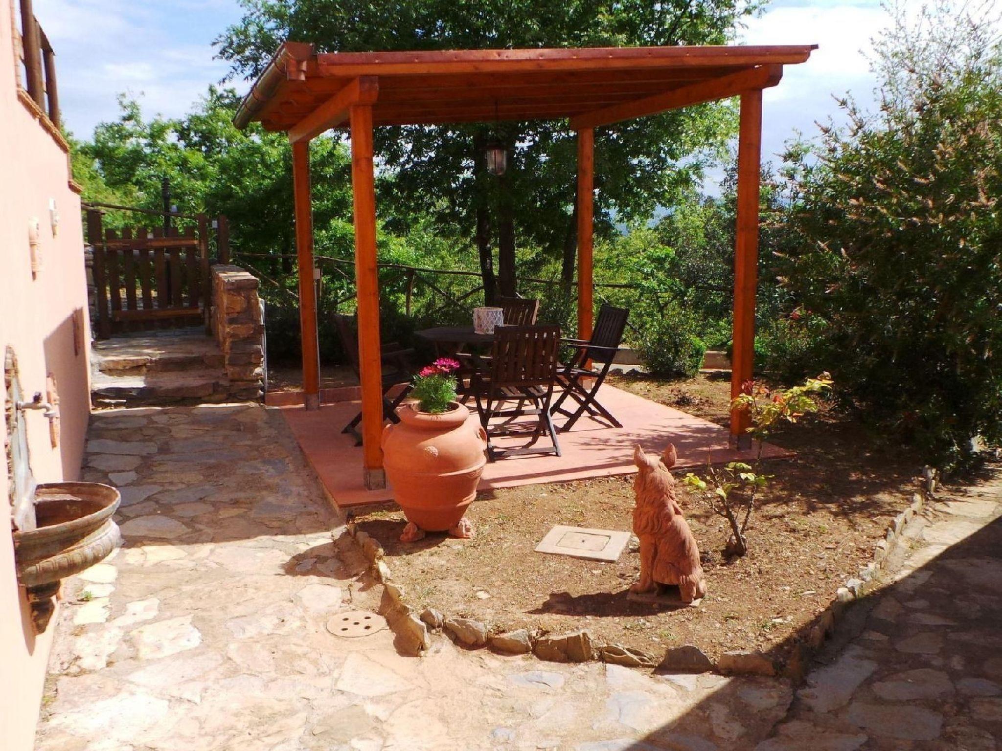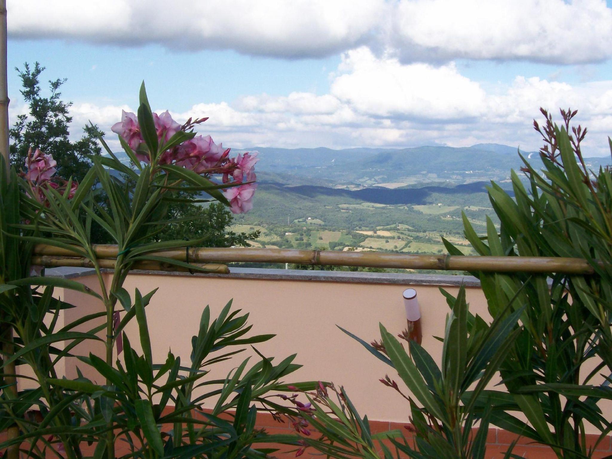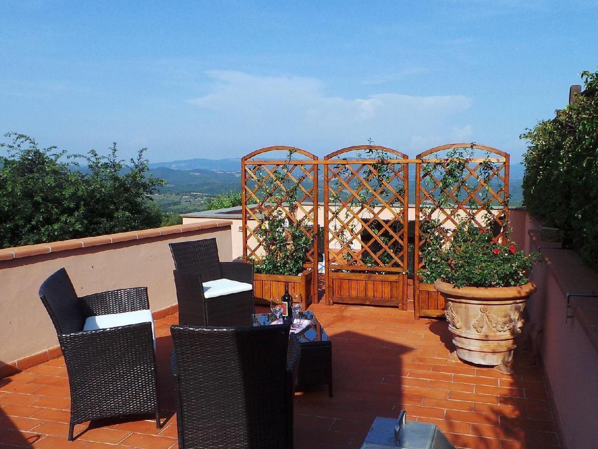 Externally, the flat boasts a charming patio furnished with wooden tables and chairs, perfect for dining al fresco while admiring the spectacular 180-degree view of the Tuscan countryside. Guests also have exclusive access to a fixed barbecue for unforgettable barbecues under the stars and a private terrace/solarium, equipped for relaxing moments in the heart of nature.