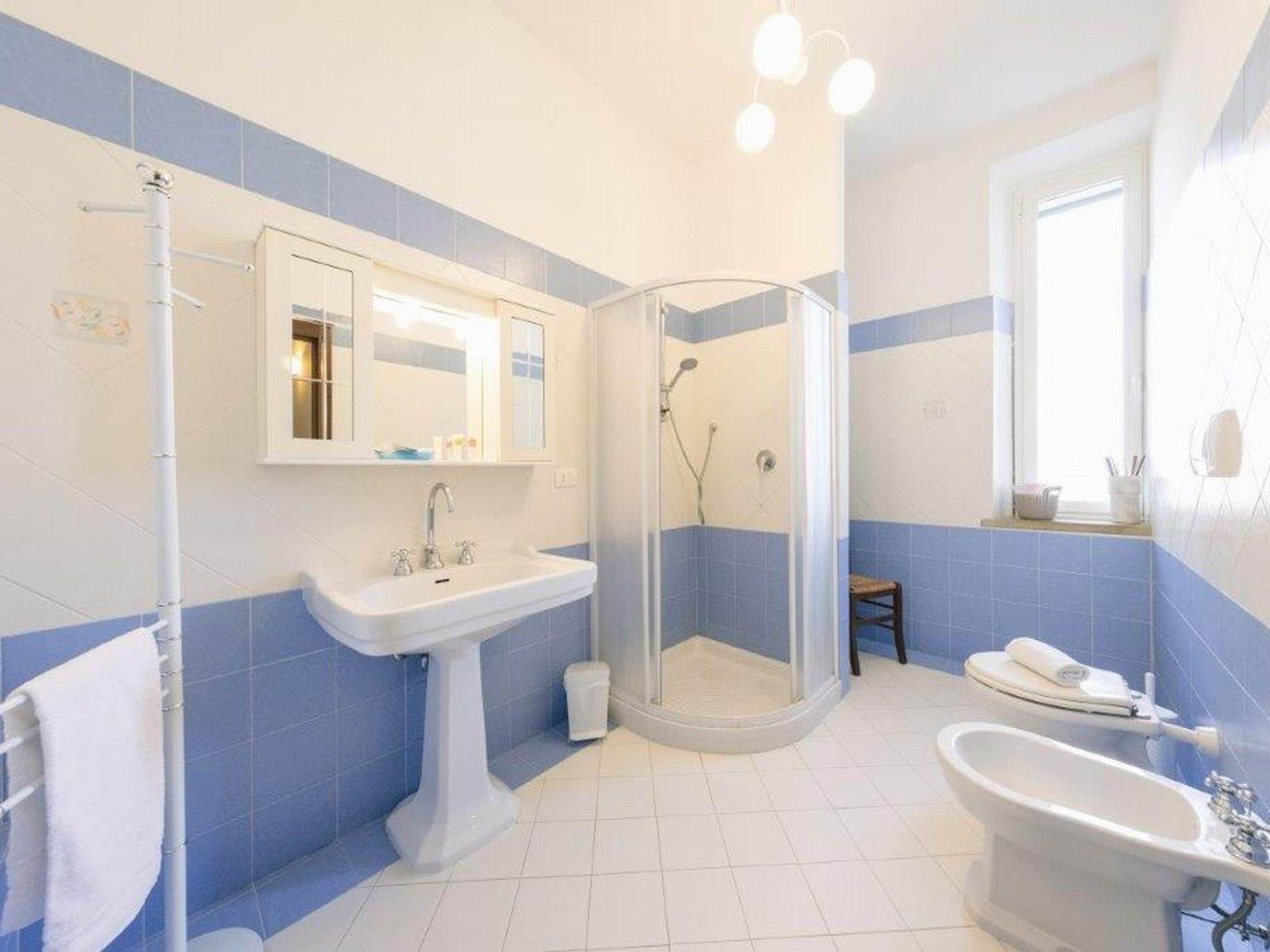 Ground floor: large entrance hall, 2 small living rooms, a large dining room, kitchen (fridge with freezer, dishwasher, toaster, microwave, moka, kettle), 1 twin bedroom and two bathrooms with shower.