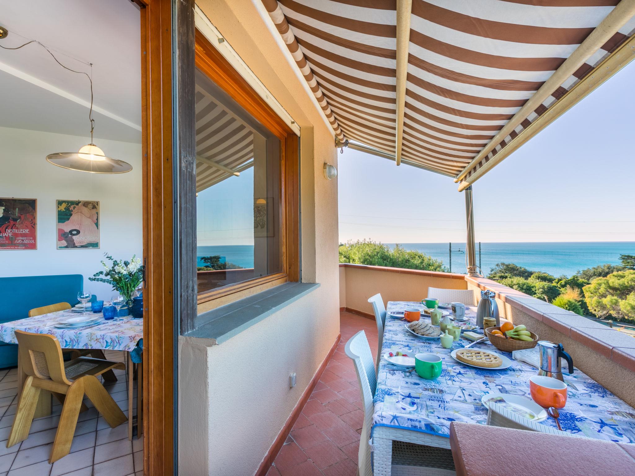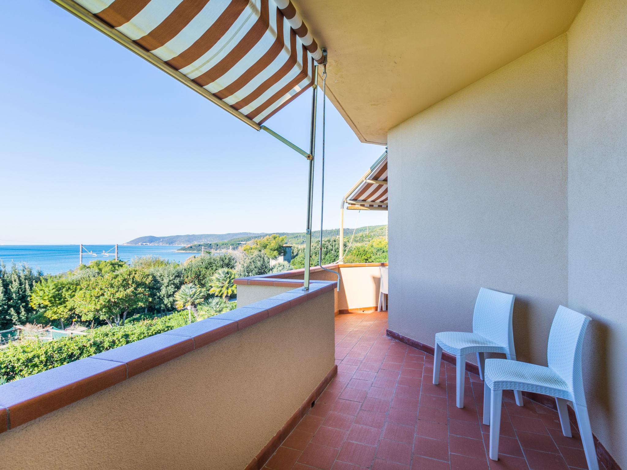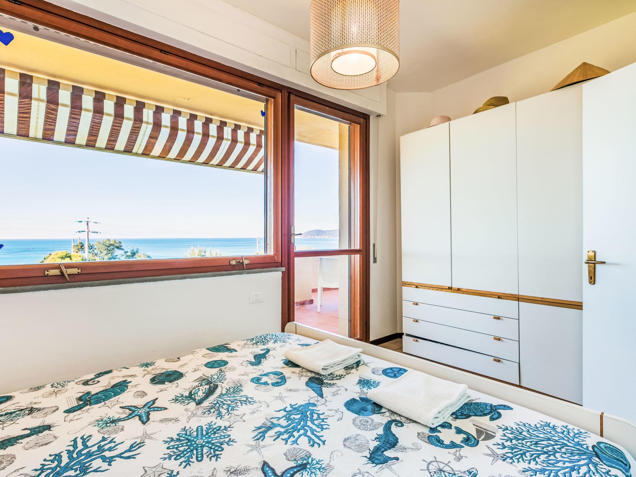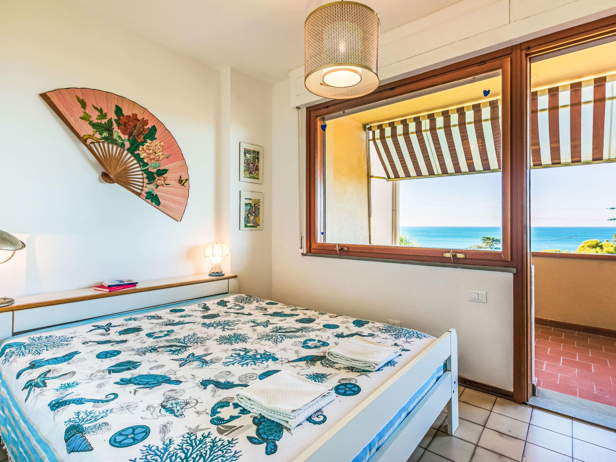 2-room apartment 50 m2 on 1st floor. Spacious and bright, beautiful and modern furnishings: upper floor: (exterior staircase) living/sleeping room with 1 double sofabed, dining table and TV. Exit to the balcony. 1 double bedroom with 1 double bed. Exit to the balcony. Open kitchen (oven, dishwasher, 4 induction hot plates, toaster, kettle, electric coffee machine). Shower/bidet/WC. Electric heating, air-conditioning. Balcony 30 m2. Balcony furniture, deck chairs (2). Marvellous view of the sea. Facilities: hair dryer. Internet (WiFi, free). Please note: fire extinguisher. Bedlinen, towels, final cleaning and all energy costs are included. IT049017C235RLHE4A
