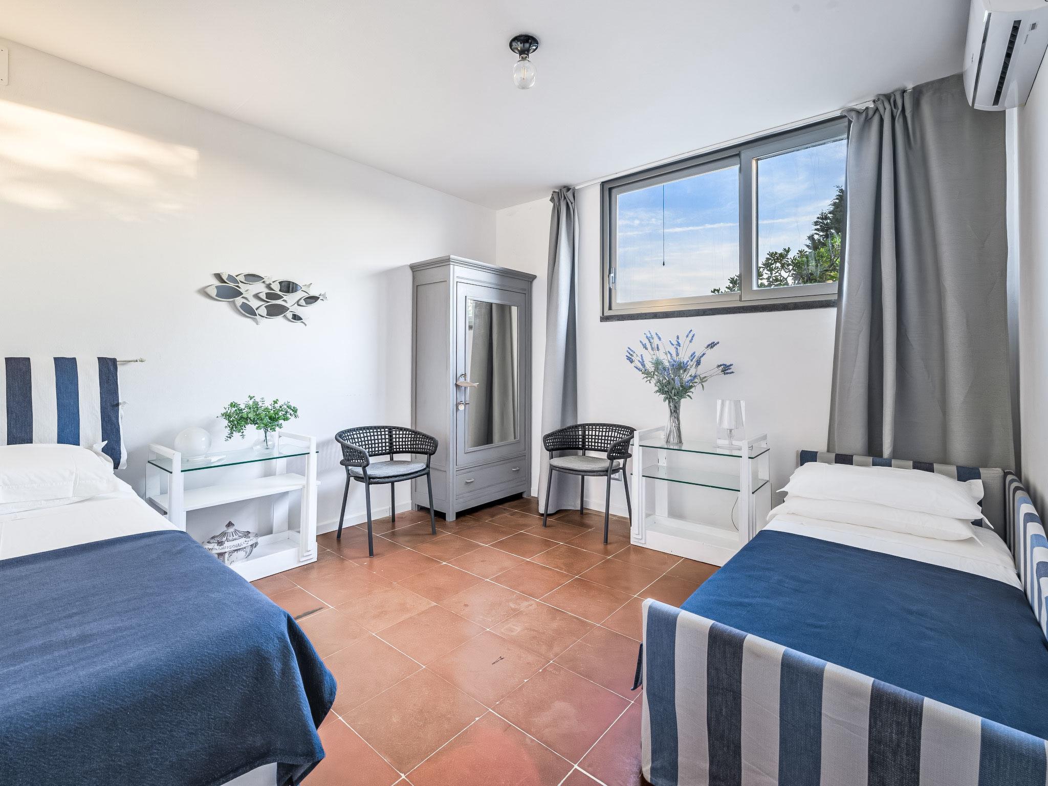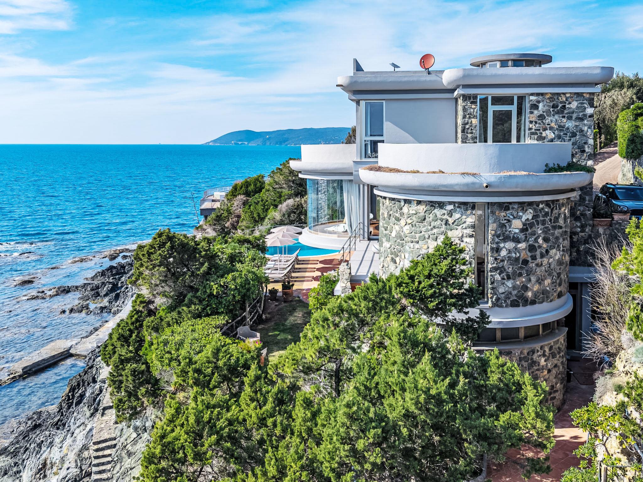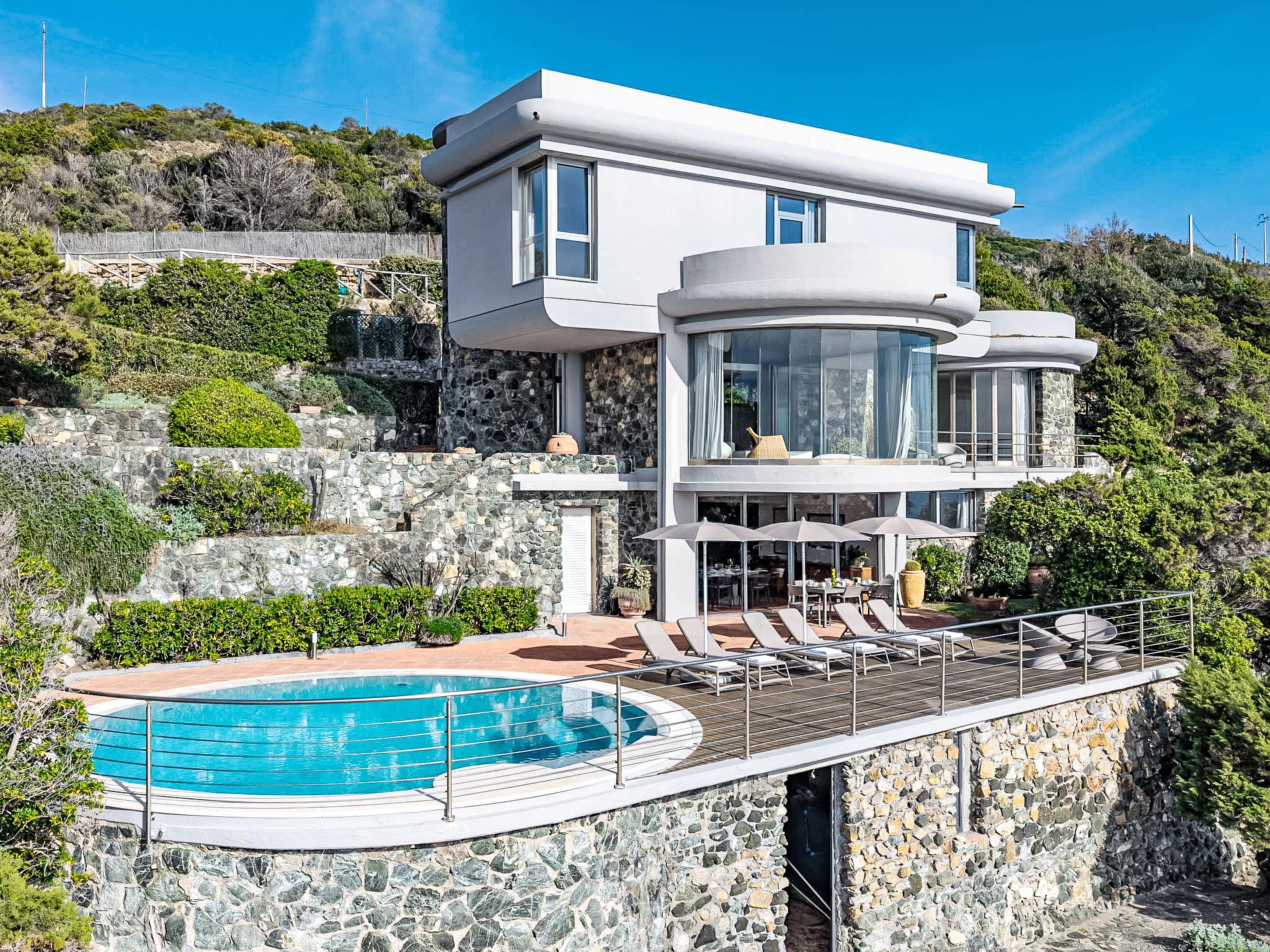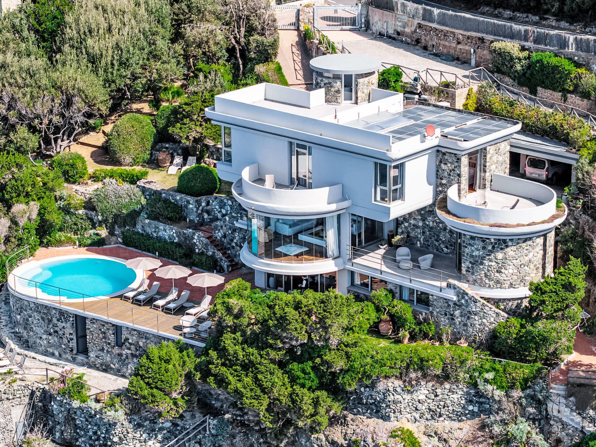"Vistamare", 8-room house 450 m2 on 3 levels. Renovated in 2022, beautiful and tasteful furnishings: 1 double bedroom with 1 double bed. 1 room with 2 beds (80 cm). Dining room with dining table. Exit to the terrace. Kitchen (oven, dishwasher, 5 induction hot plates, toaster, kettle, microwave, freezer, electric coffee machine). Exit to the garden. Shower/WC. Upper floor: (spiral staircase) living room with TV, hi-fi system and DVD. Exit to the terrace. 2nd upper floor: 2 double bedrooms. 1 double bedroom. Exit to the balcony. 1 room with 2 beds. Exit to the balcony. 2 showers/WC. Electric heating, air-conditioning. Parquet floors. Balcony, 3 terraces partly covered. Terrace furniture, box-room. Marvellous view of the sea. Facilities: washing machine, safe, iron, children's high chair, baby cot for up to 3 year olds, hair dryer. Internet (WiFi, free). Please note: maximum 2 pets/ dogs allowed. Fire extinguisher. IT049017B4ZSMZZVZD