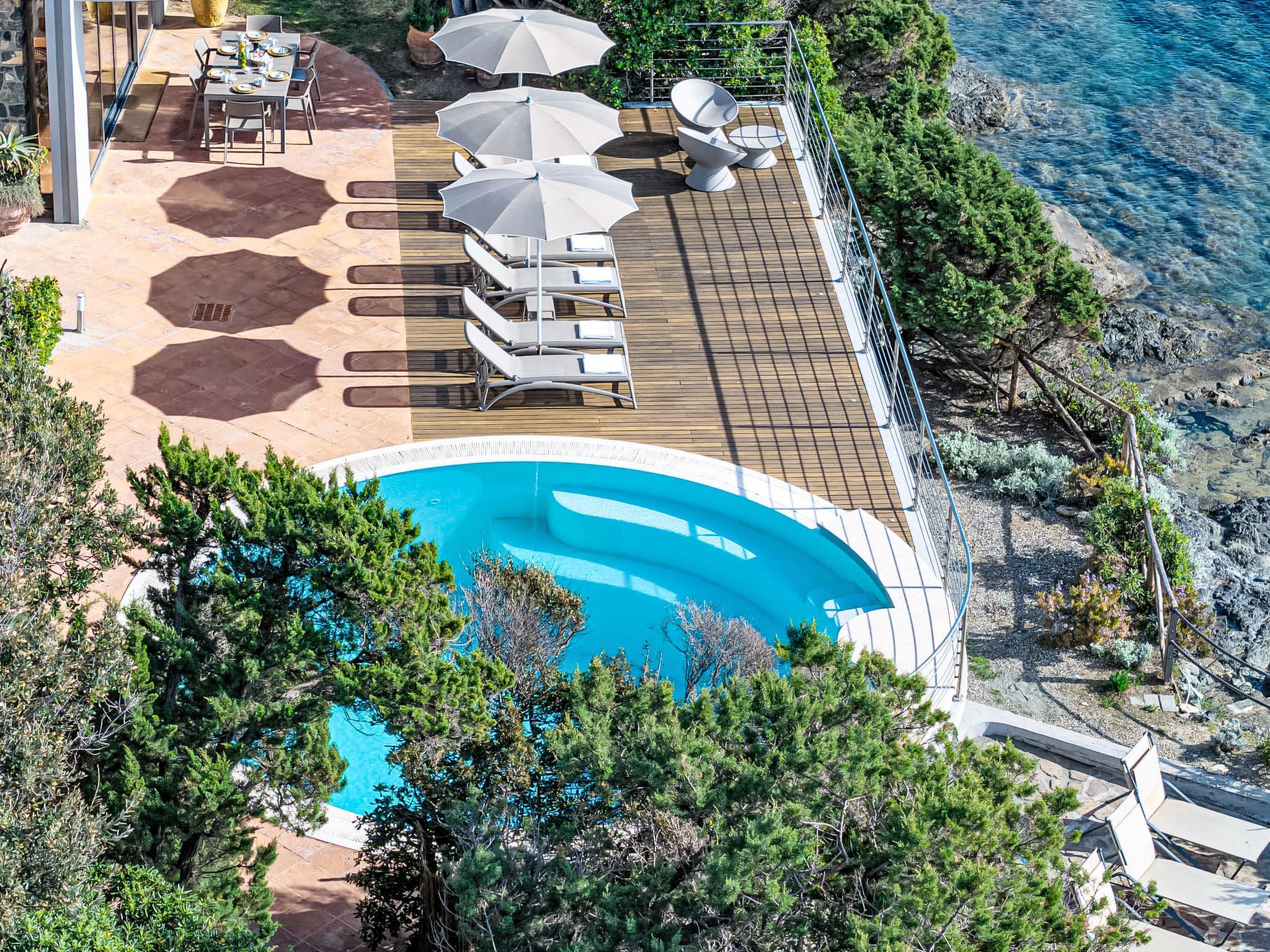Modern villa "Vistamare", 3 storeys, renovated in 2022, surrounded by trees. 1.5 km from the centre of Castiglioncello, 13 km from the centre of Cecina, 20 km from the centre of Livorno, on a slope, 30 m from the sea, direct access to the beach. Private: property 900 m2 (fenced), terraced garden with wildlife garden and trees, swimming pool (7 m diameter, seasonal availability: 03.Apr. - 30.Oct.) with salt water. Shower/WC in the pool area, outdoor shower, barbecue, bathing place. Stepped path to the house. Roofed, parking (for 4 cars). Shop 1.5 km, supermarket 1.5 km, bakery 1.5 km, bus stop 250 m, railway station "Castiglioncello" 2 km, sandy beach "Baia del Quercietano" 1.5 km, rocky beach 30 m. Marina 4 km, tennis 2 km, minigolf 2 km. Nearby attractions: Pisa 40 km, Lucca 65 km, Firenze 110 km. The owner does not accept any youth groups.