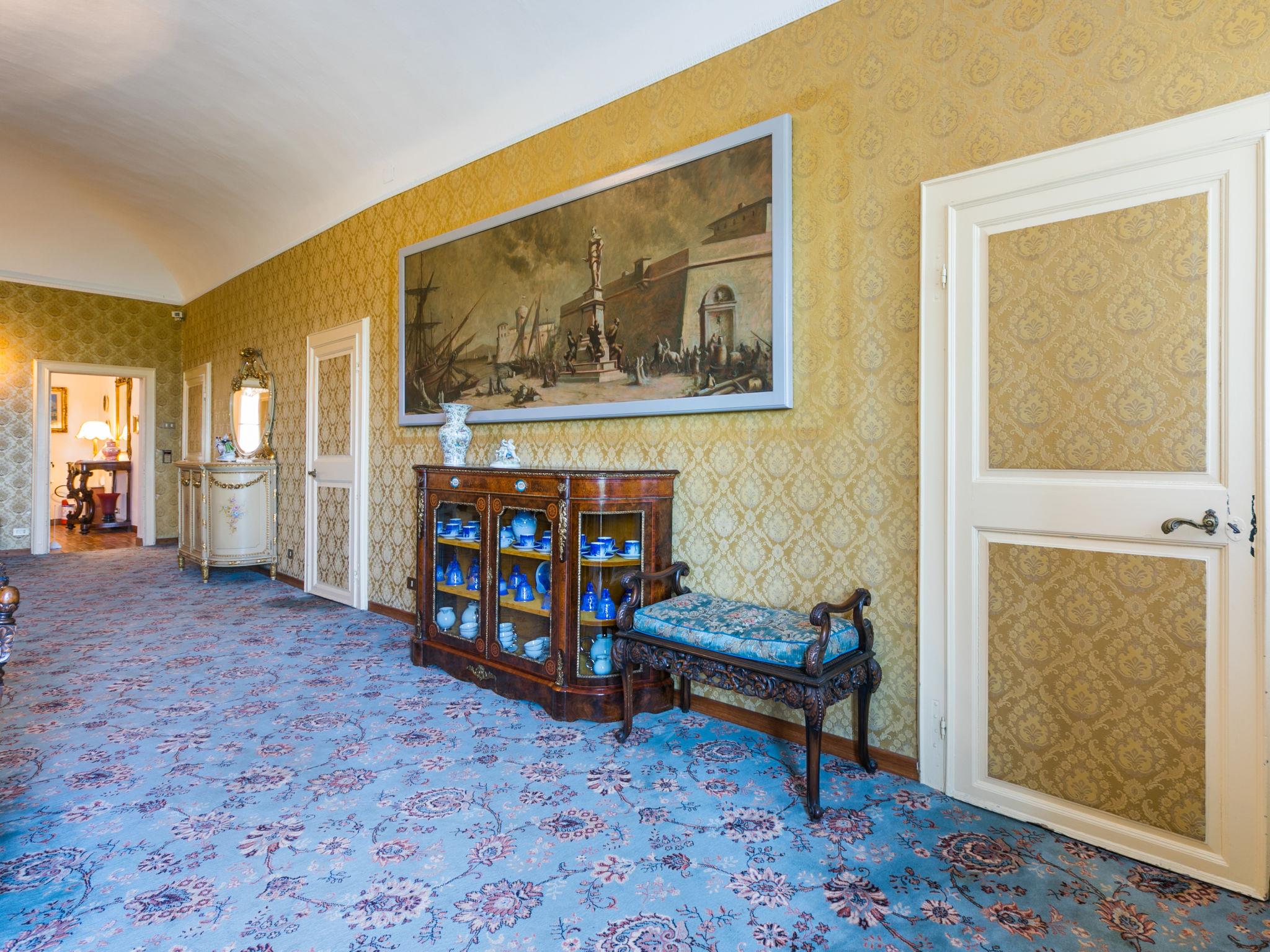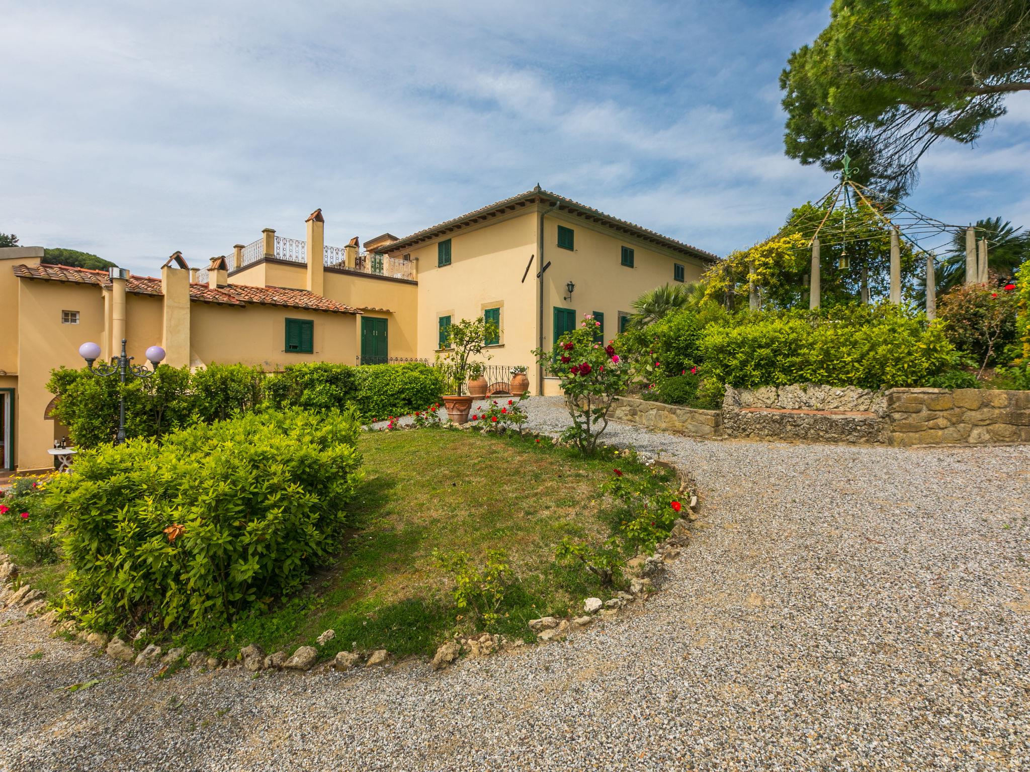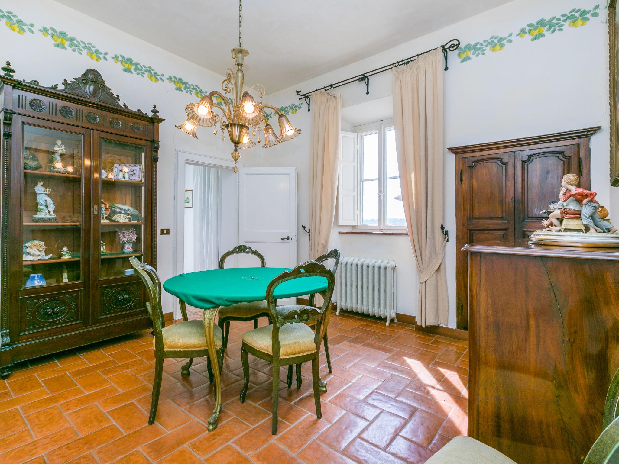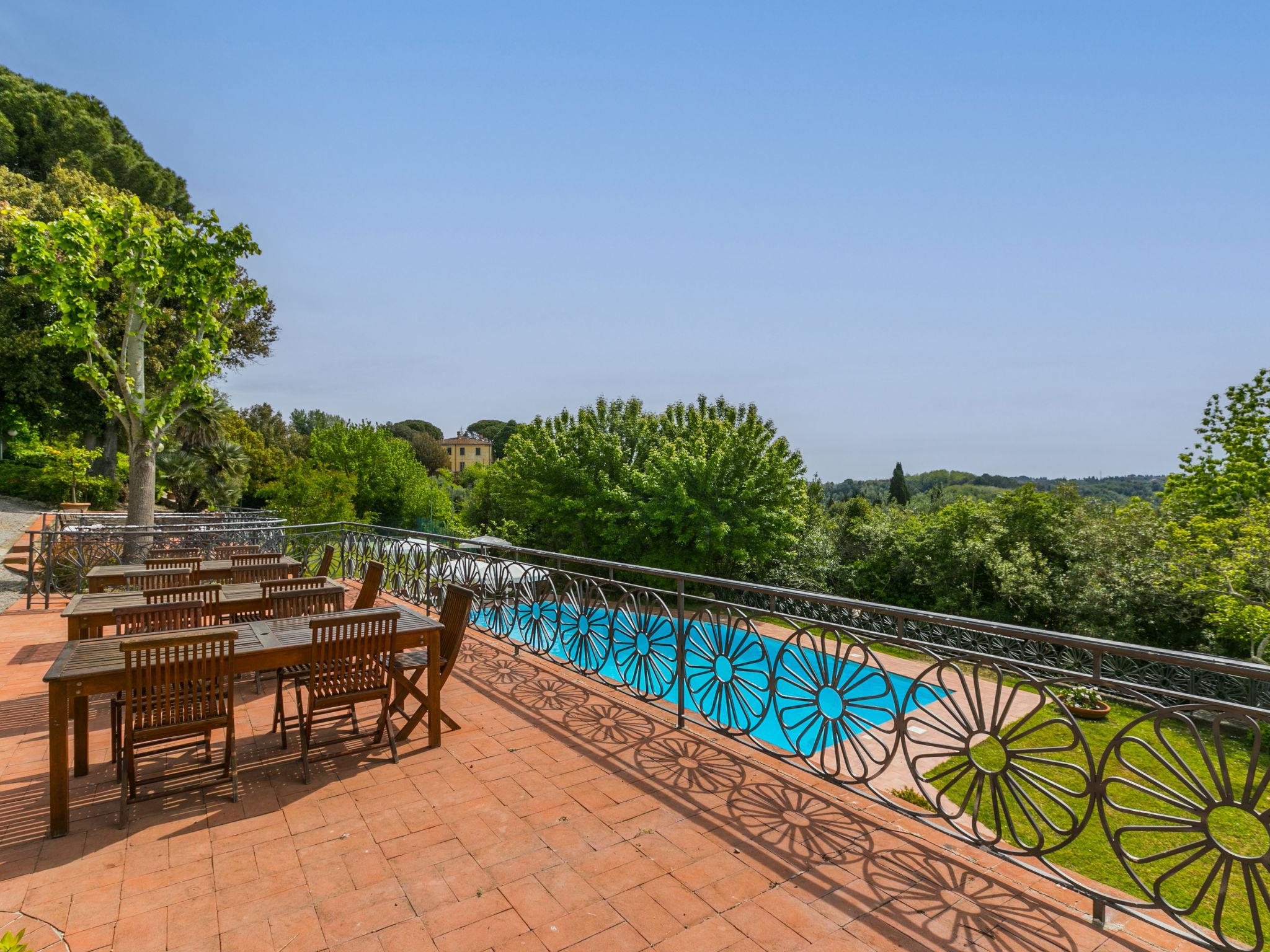 Exclusive and elegant 19th century property located in the heart of the Tuscan hills. Historical country house "Villa La Guardia Vecchia", detached, built in 1700, renovated, surrounded by meadows. 700 m from the centre of Crespina Lorenzana, 30 km from the centre of Pisa, 33 km from the centre of Livorno, in a secluded, quiet, sunny position on top of a hill, 30 km from the sea, in the countryside. Private: park (fenced), flowers and trees, beautiful garden to relax, swimming pool (15 x 7 m, depth 120 - 275 cm, seasonal availability: 01.May. - 01.Oct.). Shower/WC in the pool area, tennis (1 x hard court), table tennis, garden furniture, barbecue. In the house: billiard table, heating to be paid on the spot, heating available only from 01.Nov. - 15.Apr.. Parking on the premises. Restaurant 1 km, bus stop 500 m, sandy beach "Castiglioncello" 35 km, rocky beach "Calafuria" 38 km, thermal baths "Cascina Terme" 10 km. Golf course (9 hole) 30 km, riding stable 500 m. Nearby attractions: Villa Belvedere 500 m, Certosa di Calci 23 km, Lajatico 29 km, Volterra 46 km, San Gimignano 55 km, Lucca 63 km. Please note: car recommended. Suitable for families. Groups of teenagers on request only. Suitable for events. The villa is surrounded by a splendid park with an Italian garden, inside which there are benches, gazebos, fruit trees, a splendid swimming pool and a tennis court. This Villa, an ideal place to spend exclusive relaxing holidays, also offers the possibility of hosting events, weddings and meetings. Adjacent to the villa, with an independent entrance, is the caretaker's house.