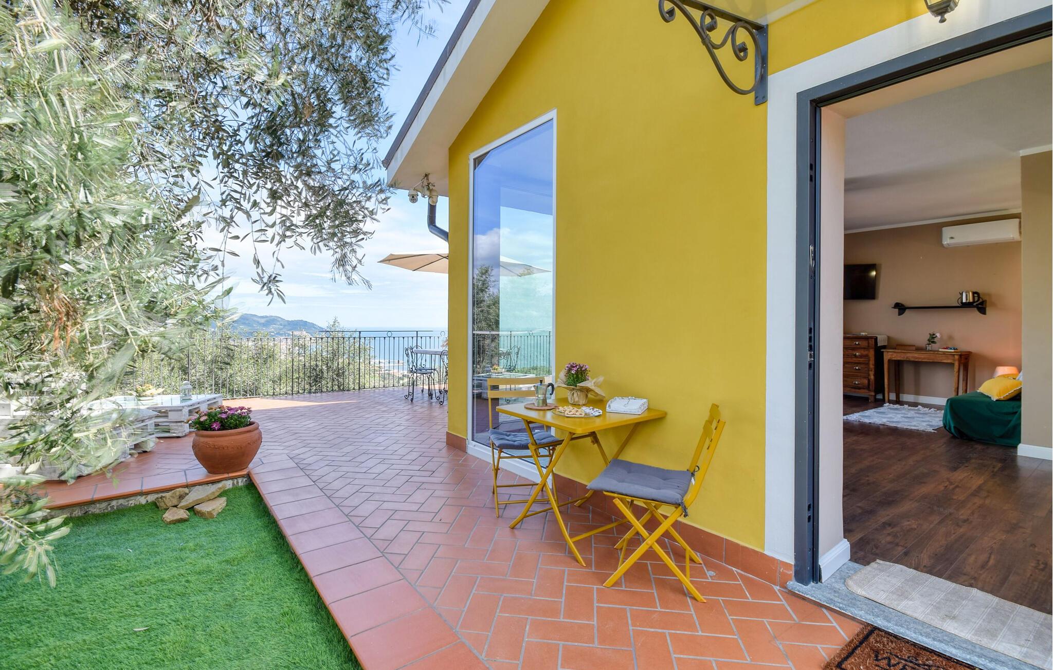 Utnyttja den fantastiska utsikten från terrassen och låt blicken vandra över den omgivande landsbygden och havet.