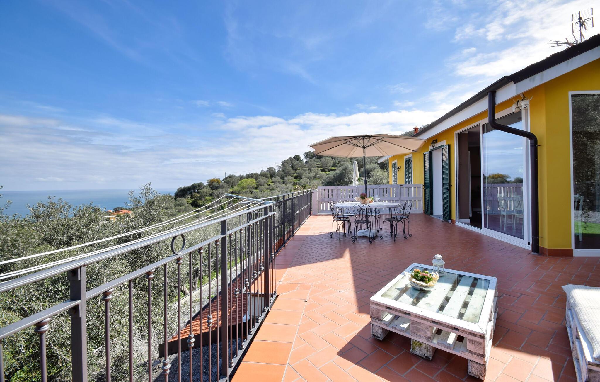 I ett fantastiskt läge med utsikt över havet och kusten, välkomnar detta inbjudande hus dig med sina mysiga möbler och vänliga färger, där du kan känna dig som hemma under din semester. Njut av den fantastiska panoramautsikten när ni äter tillsammans framför de stora fönstren.