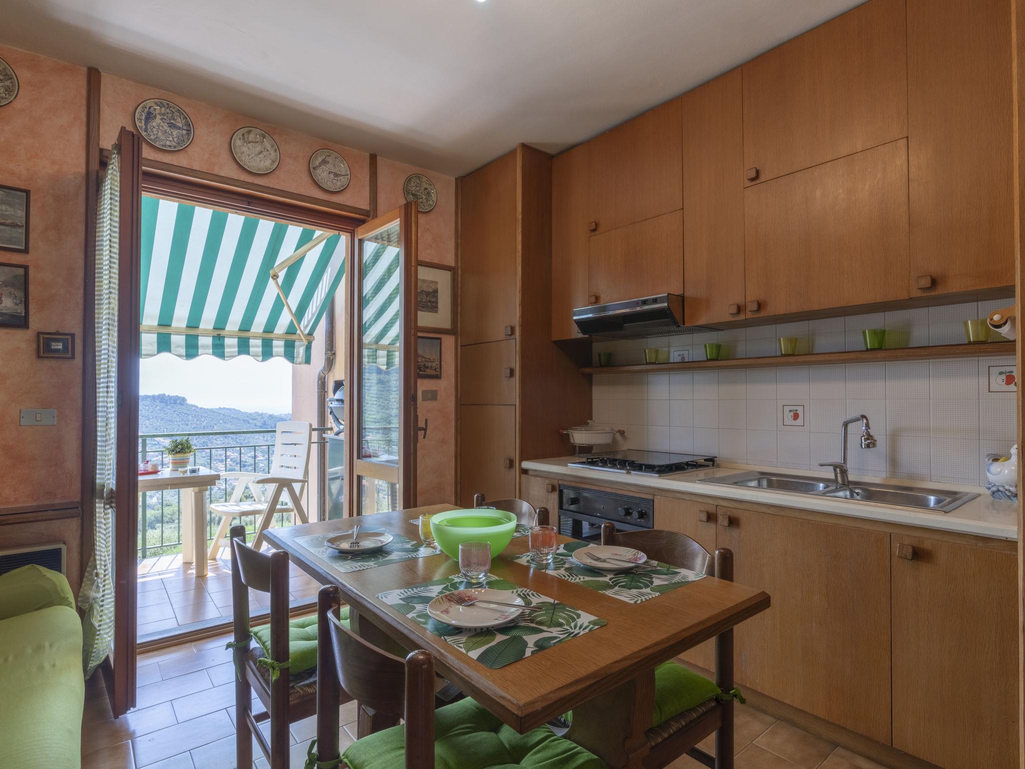 "Verde Adagio", 2-room apartment 45 m2 on 1st floor. Practical and rustic furnishings: living/dining room with 1 double sofabed (140 cm, length 200 cm), TV. Exit to the terrace. 1 double bedroom. Kitchenette (4 gas rings, toaster, microwave). Shower/bidet/WC. Electric heating. Heating available only from 15.10. to 30.04. Balcony 6 m2, garden 200 m2. Balcony furniture, barbecue, sitting area. Distant view of the sea and the countryside. Facilities: washing machine. Internet (WiFi, free). Maximum 1 pet/ dog allowed. IT008025C2FVWDGNEF