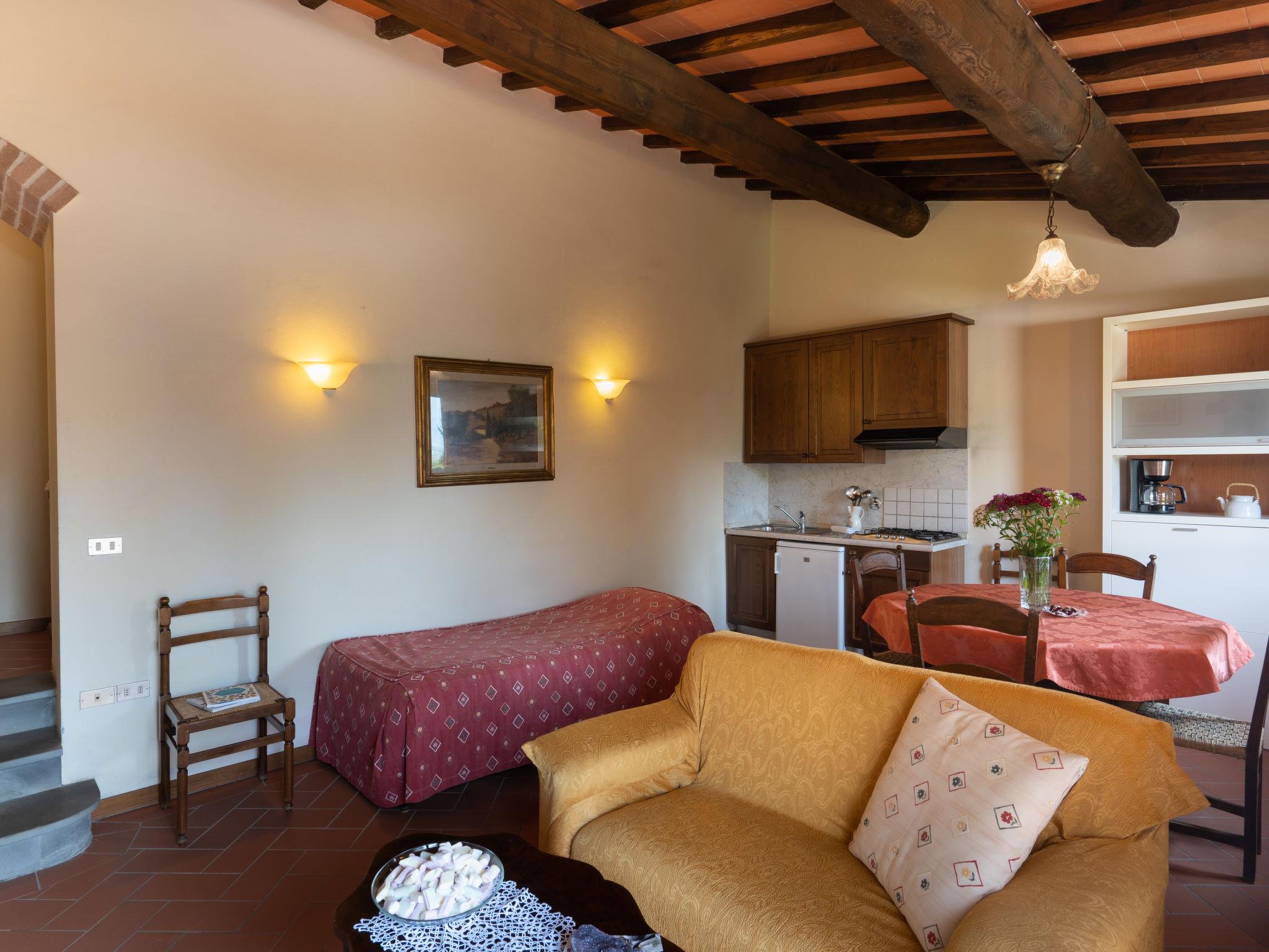 Rustic on a vinyard agricultural estate "Vigna La Corte", 2 storeys, detached from the 16th century, surrounded by trees, meadows and fields. 3 houses in the residence. 13 apartments in the residence. 2 km from the centre of Dicomano, 7.2 km from the centre of Vicchio, 45 km from the centre of Firenze, in a secluded, elevated position on a slope. For shared use: property 60 ha with plants and trees, meadow, swimming pool (16 x 8 m, depth 140 cm, seasonal availability: 01.May. - 01.Oct.). Outdoor shower, table tennis, arbour, terrace, garden furniture, barbecue. In the complex: reception, WiFi, table football, washing machine (for shared use), heating available only from 15.Nov. - 15.Apr.. Motor access (500 m via unmade road). Roofed, parking on the premises. Supermarket 2 km, restaurant 2 km, bus stop 900 m, railway station "Dicomano" 2 km. Nearby attractions: Autodromo Internazionale del Mugello 25 km, Outlet Barberino del Mugello 35 km. On the estate animal husbandry. Local sale of farm products. Please note: railway line 1 km from the property.