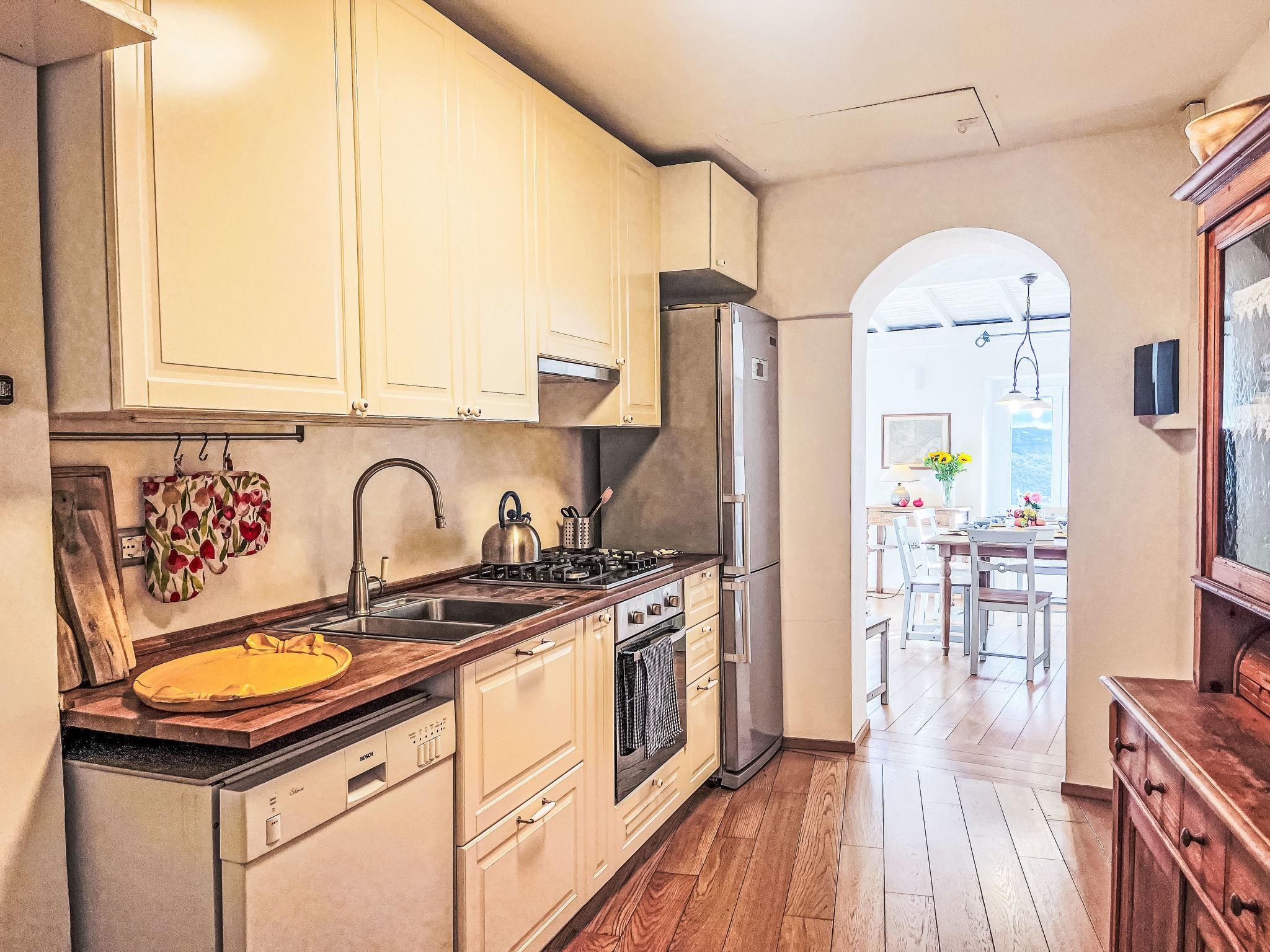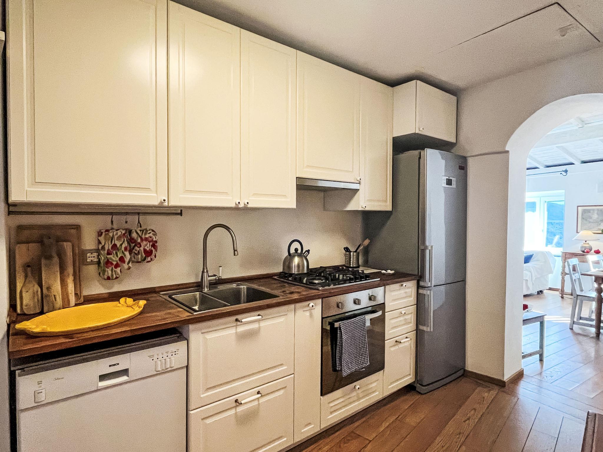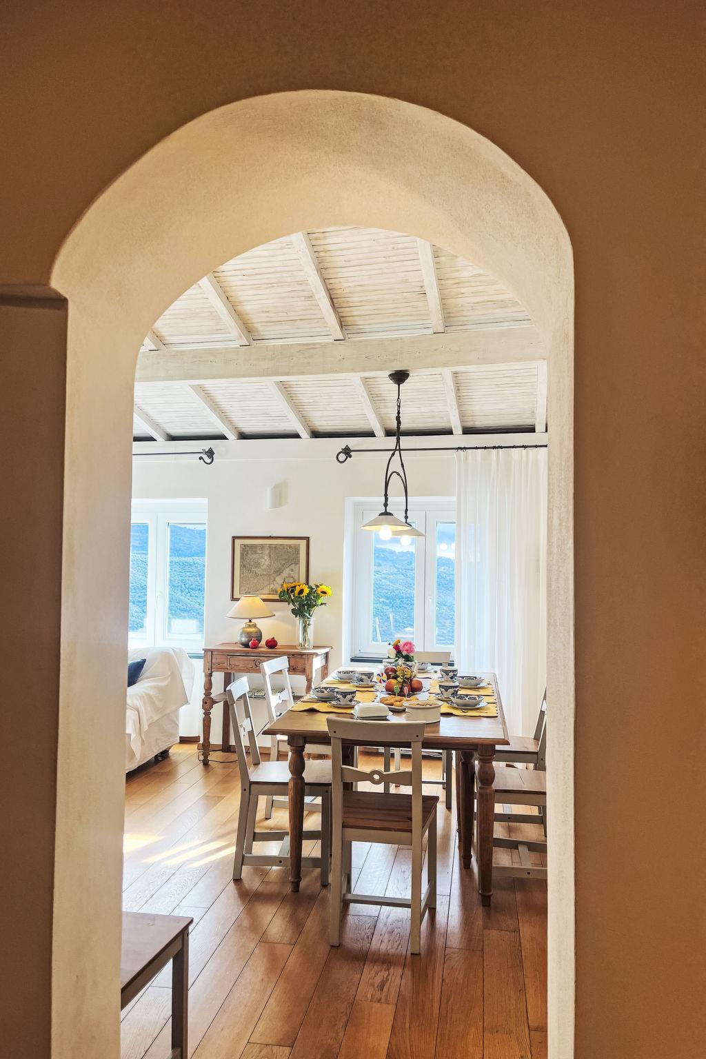 "Bellissimi (DOL280)", 5-room terraced house 110 m2 on 3 levels. Partly renovated in 2022, beautiful and stylish furnishings: 1 small room with 1 sofabed (80 cm), shower/WC and air conditioning. Upper floor: (spiral staircase), 2 small rooms, each room with 1 french bed and air conditioning. 1 small room with 1 x 2 bunk beds (80 cm). Shower/bidet/WC. 2nd upper floor: (spiral staircase) living room with dining table, satellite TV, hi-fi system and DVD. Open kitchen (oven, dishwasher, 4 gas rings, freezer, electric coffee machine). Exit to the garden. Electric heating, air-conditioning. Heating available only from 01.11. to 10.05. Parquet floors. Patio 12 m2, porch. Terrace furniture, deck chairs. Beautiful view of the valley and the countryside. Facilities: iron. Internet (WiFi, free). IT008030C2UZO9GOXA