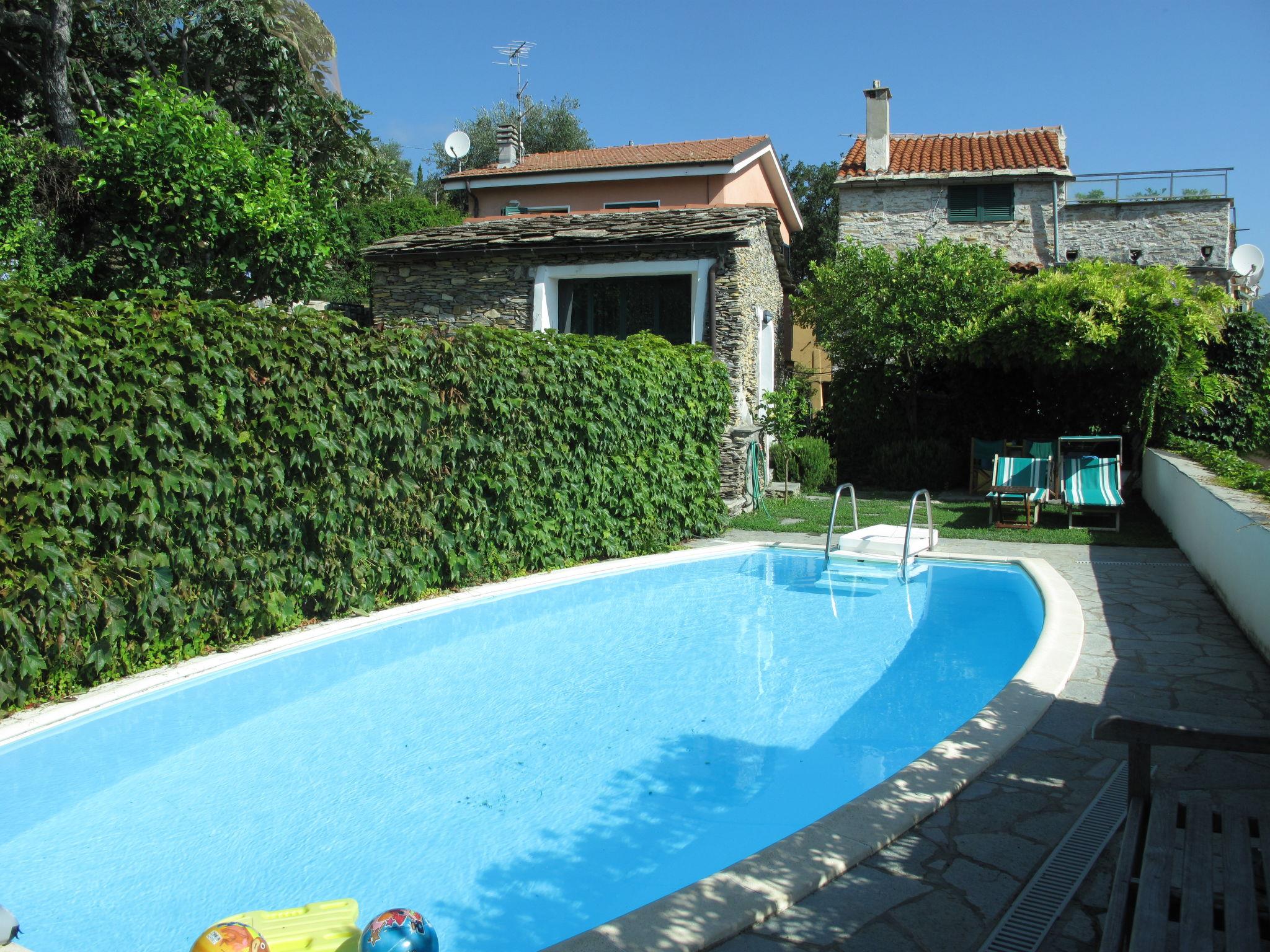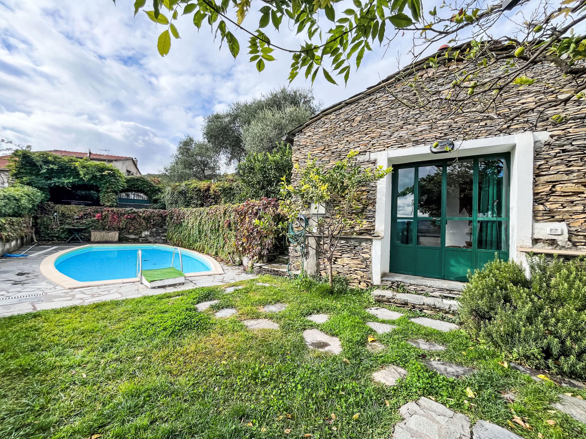 Beautiful cottage, 2 storeys, semi-detached. In the hamlet Bellissimi 4 km from the centre of Dolcedo, 13 km from the centre of Imperia, on a slope, in the residential district, 11 km from the sea. For shared use: swimming pool (8 x 4 m, depth 150 cm, seasonal availability: 01.May. - 15.Oct.). Outdoor shower, pool maintenance by the owner/gardener. Private: beautiful, well-kept garden 200 m2 (fenced) with lawn and trees, lawn for sunbathing. Patio, arbour, garden furniture. In the house: washing machine (for shared use). 200 m steep footpath to the house. Public parking 200 m. Shop 4 km, supermarket 13 km, restaurant 5 km, bus stop 200 m, railway station "Imperia Porto Maurizio" 13 km, pebble beach "Imperia Porto Maurizio" 13 km, outdoor swimming pool 10 km. Please note: the apartment is located in a zone with limited traffic. The complex has another 1 house for rent.