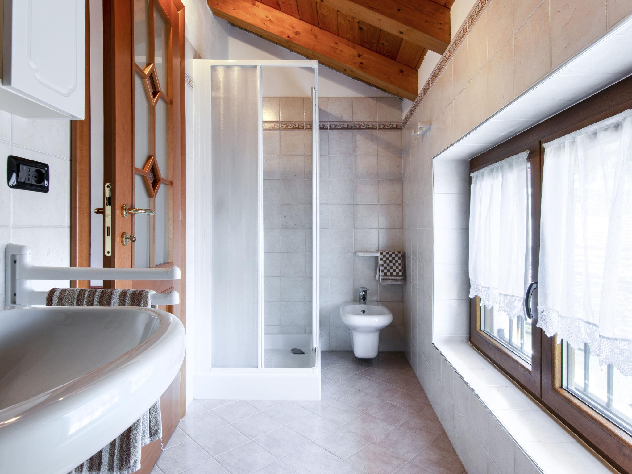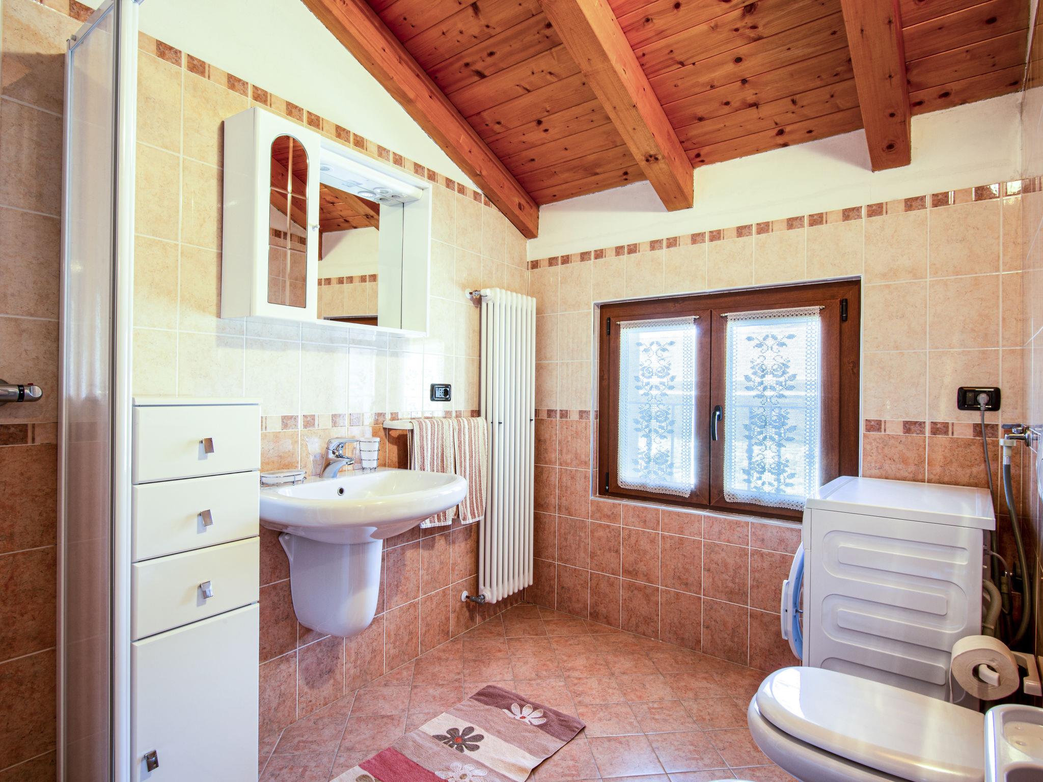 5-room terraced house 105 m2 on 3 levels, on the upper ground floor, south facing position. Cosy furnishings: living/dining room with open-hearth fireplace, dining table and satellite TV. 1 room with 1 bed and 1 double bed. Open kitchen (oven, dishwasher, 4 gas rings, toaster, kettle, freezer, electric coffee machine). Shower/bidet/WC, hip bath. Upper floor: (exterior staircase) living/dining room with open-hearth fireplace, dining table and satellite TV. 1 double bedroom. Open kitchen (oven, dishwasher, 4 gas rings, toaster, kettle, microwave, freezer, electric coffee machine). Shower/bidet/WC. 2nd upper floor: 1 open room with 1 bed, 1 double bed and shower/WC. Shower/bidet/WC. Gas heating. Heating available only from 15.10. to 15.04. Terrace. Terrace furniture, deck chairs (4), box-room. Beautiful view of the lake. Facilities: washing machine, iron, children's high chair, baby cot for up to 2 year olds. Internet (WiFi, free). Please note: non-smoking house. Maximum 3 pets/ dogs allowed. No lift. No internal connecting door between the separated properties. When booking this property you make a reservation for the whole house. Facilities for shared use are then for private use. IT013239C2OZHBVFIT