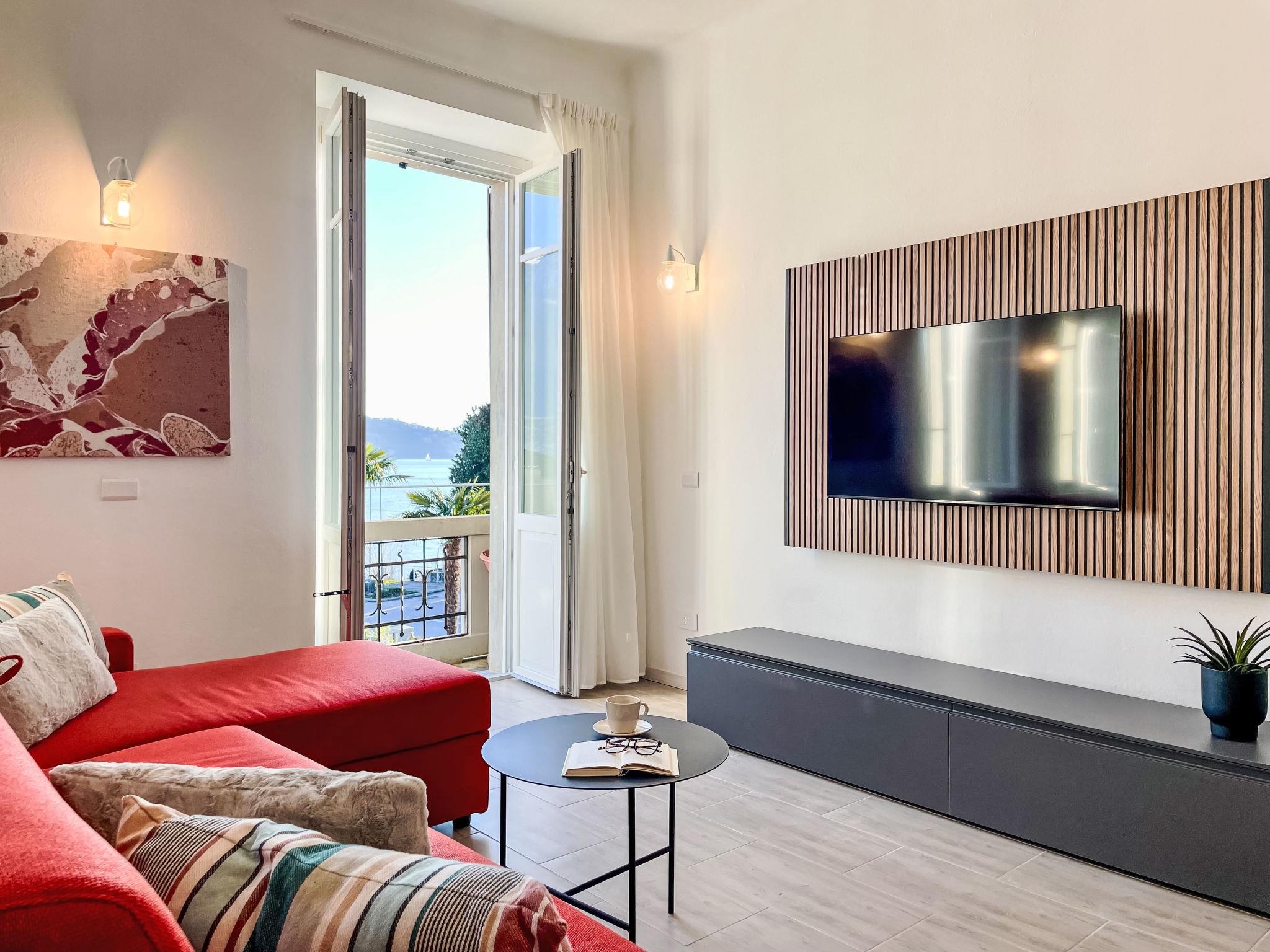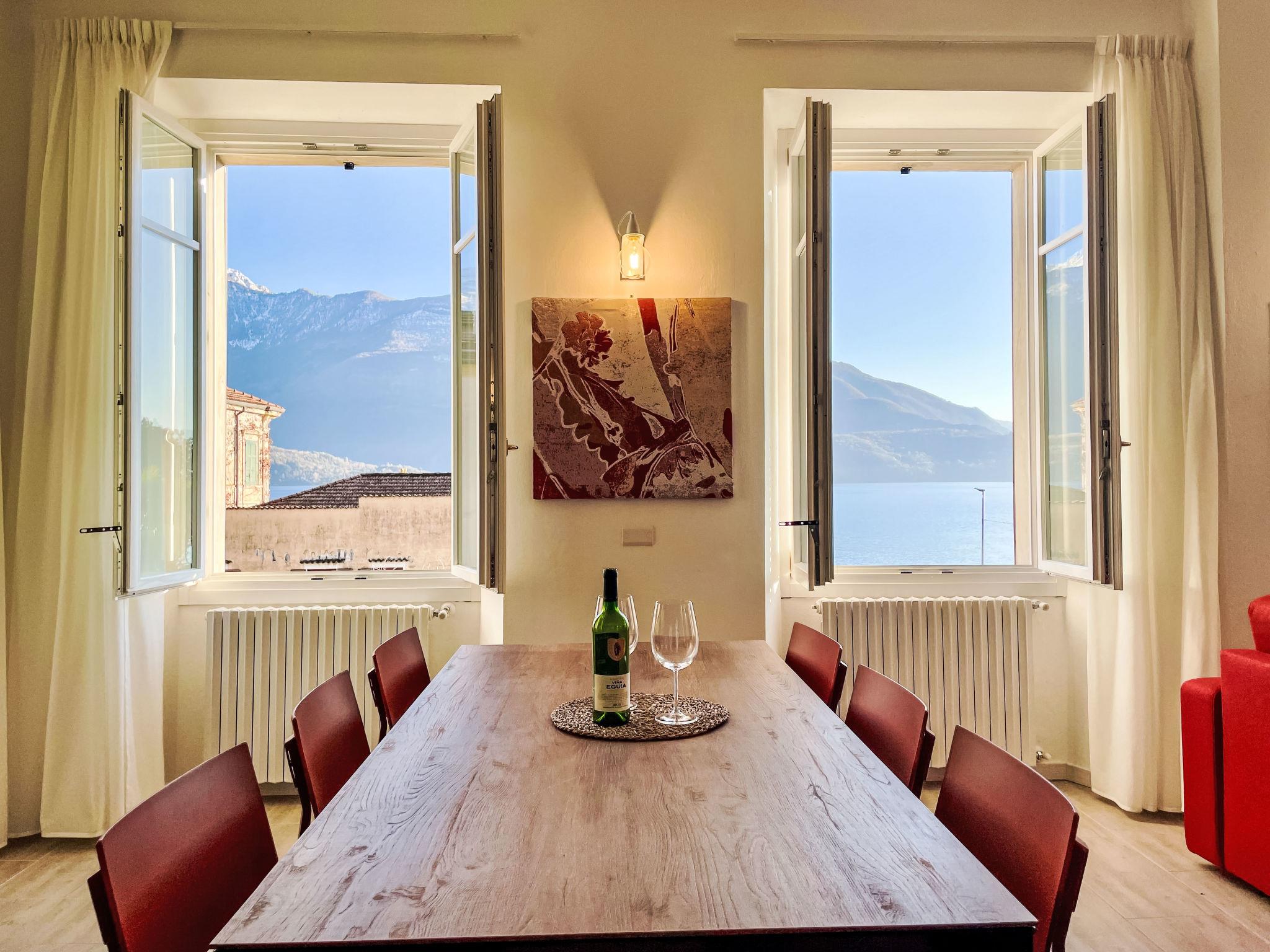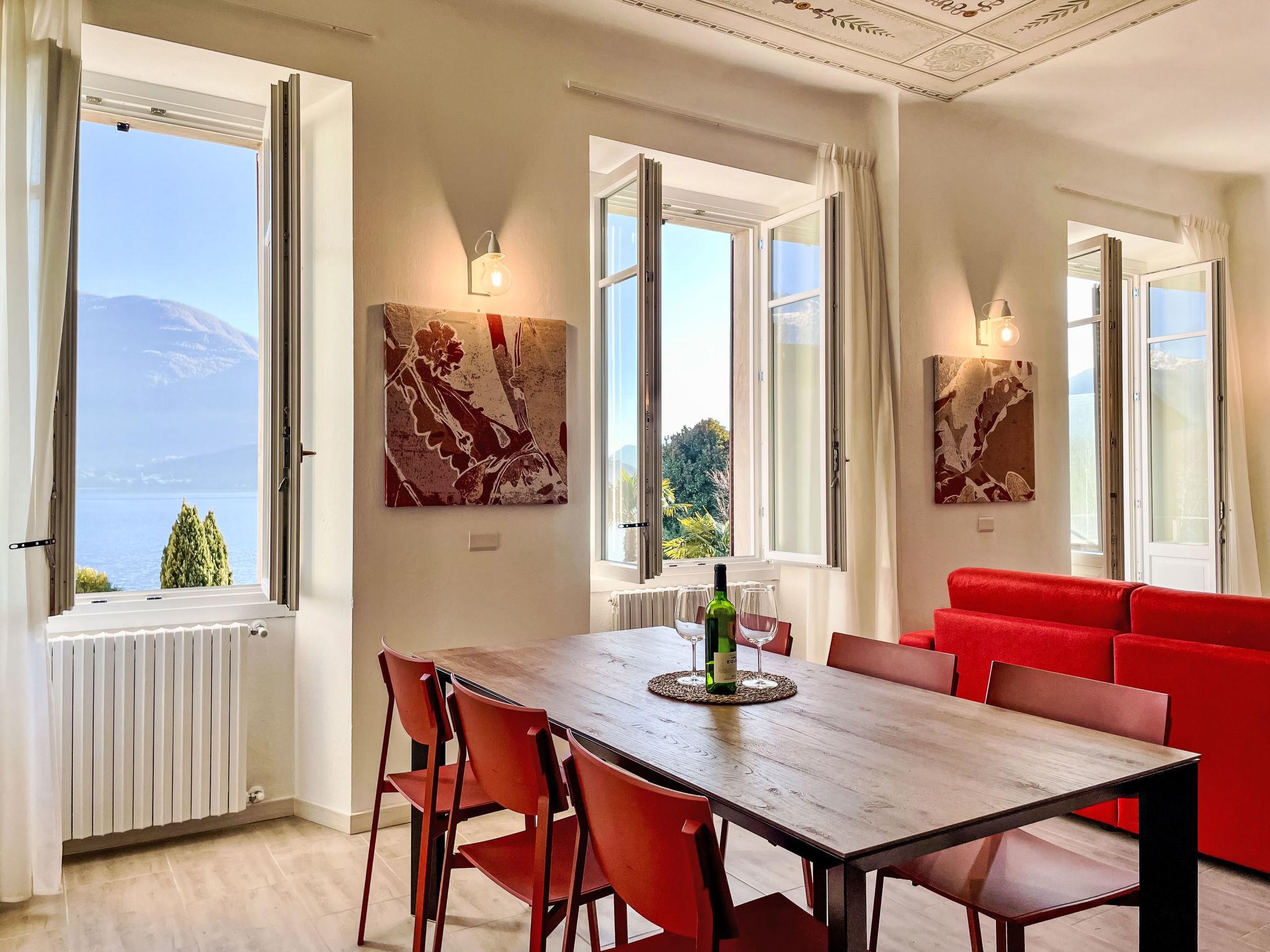 "First floor", 3-room apartment 100 m2 on 1st floor. Comfortable furnishings: open large living/sleeping room with 1 double sofabed, dining table and TV. 1 room with 1 double bed and TV. 1 room with 2 beds. Open kitchen (oven, dishwasher, 4 induction hot plates, toaster, electric coffee machine). Shower/bidet/WC. Gas heating, air-conditioning. Small balcony. Very beautiful view of the lake and the mountains. Facilities: children's high chair, baby cot for up to 2 year olds, hair dryer. Internet (WiFi, free). Please note: non-smokers only. Fire extinguisher, no lift. IT013089B4CA3TNOYL