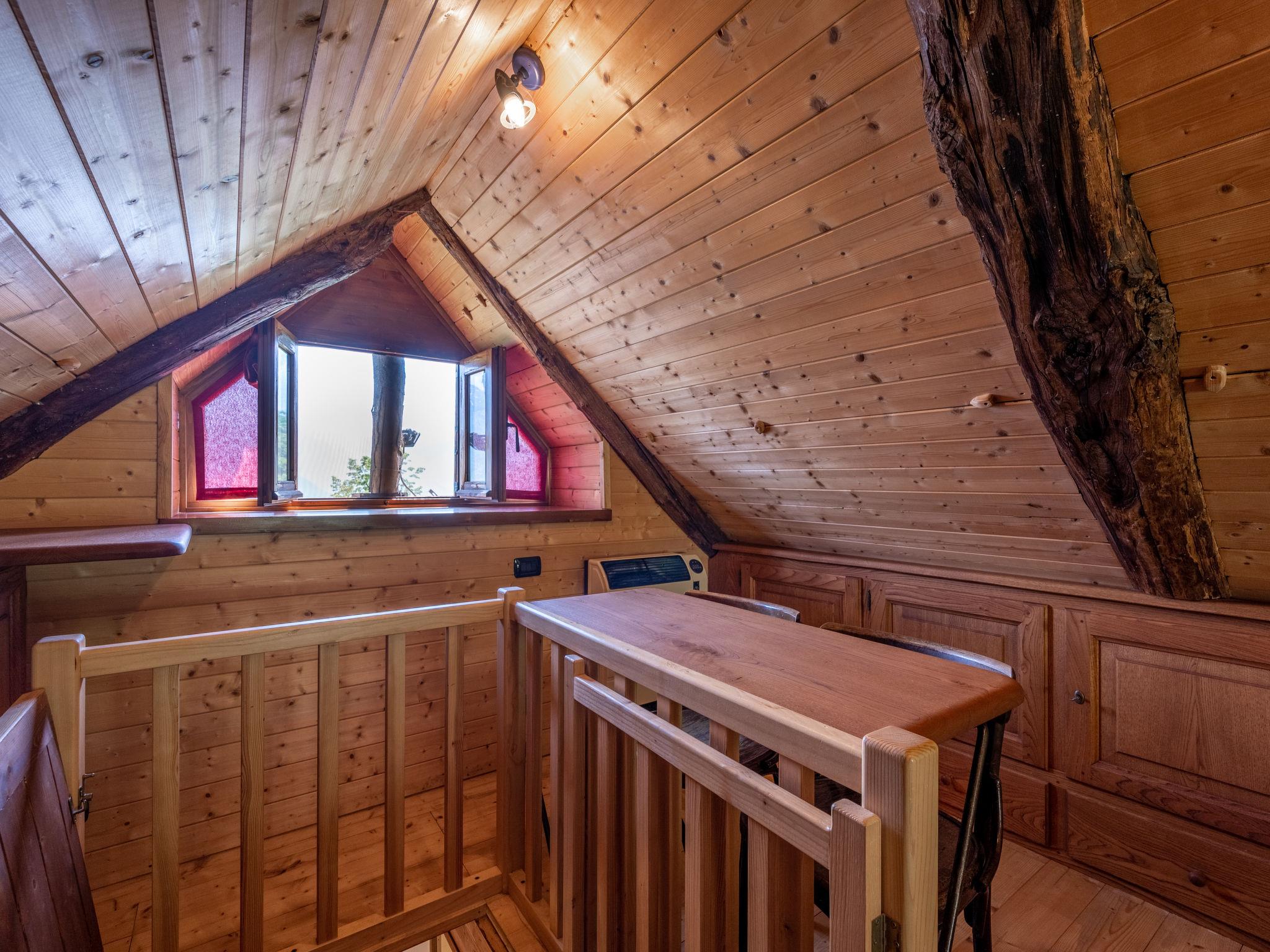 "Baita Degli Orsi", 2-room house 50 m2 on 2 levels. Practical and rustic furnishings: living/sleeping room with 1 double sofabed, Scandinavian wood stove, dining table, satellite TV, radio and DVD. Exit to the terrace. Open kitchen (oven, 4 gas rings, freezer, electric coffee machine). Shower/WC. Top floor: (ladder), 1 room with sloping ceilings, ceiling height 50 - 250 cm with 1 bed and 1 french bed (160 cm). Exit to the garden. Gas heating (extra). Heating available only from 01.10. to 15.05. Wooden floors. Terrace 12 m2, garden. Terrace furniture, barbecue, deck chairs (2). Beautiful panoramic view of the mountains and the valley. Facilities: Internet (WiFi, free). Please note: maximum 2 pets/ dogs allowed. Smoke alarm, fire extinguisher. The attic is only kept closed by a trapdoor (balustrade). IT103028C278WWUIF7