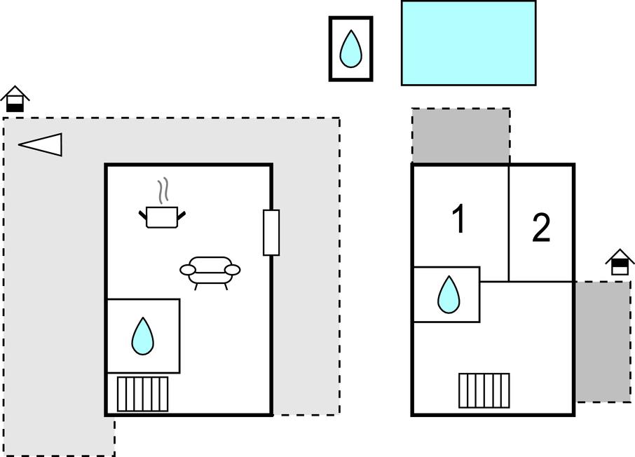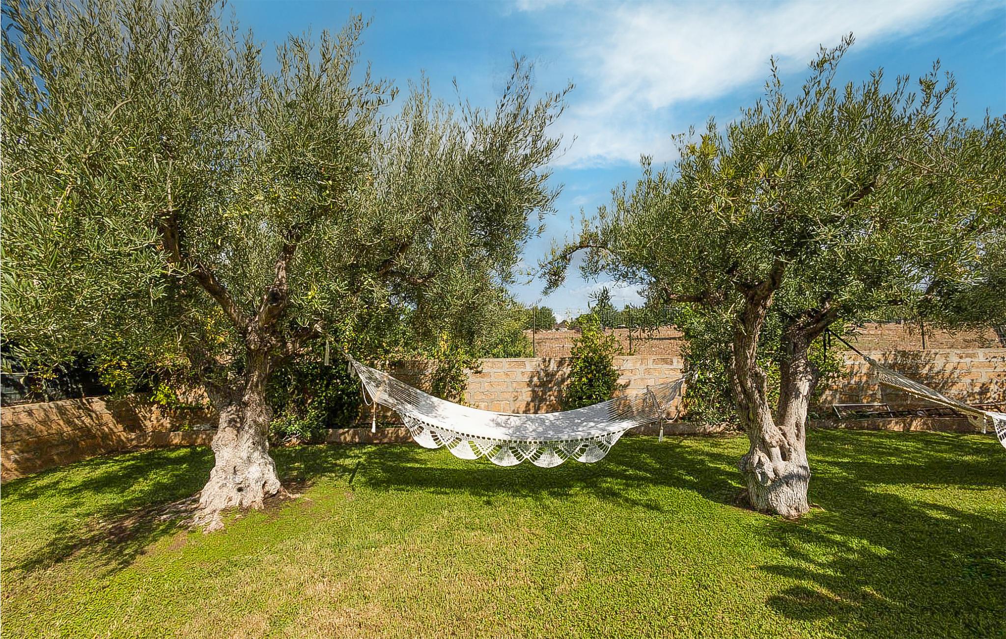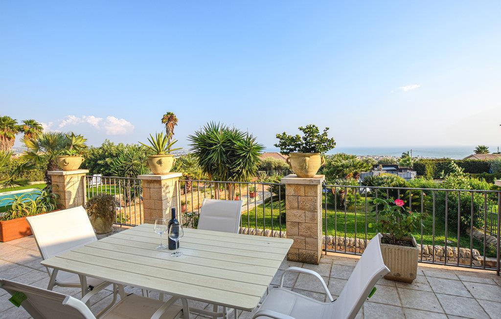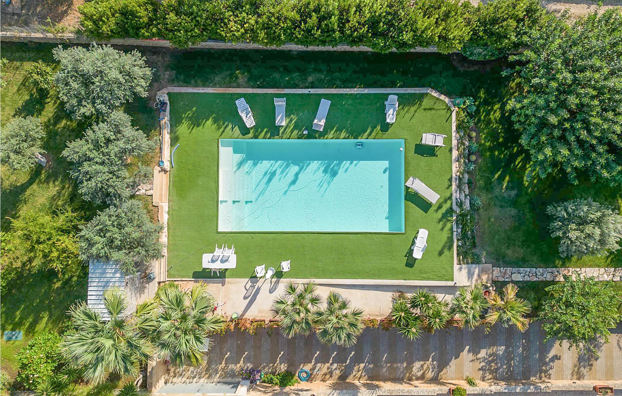 Utanför omger en stor terrass på cirka 150 m² huset och är utrustad med bord, stolar, soffor och ett utekök/grillområde. Poolen kantas av engelsk gräsmatta och omges av höga häckar för extra avskildhet. På gräsmattan finns ett område för barn med utomhusspel (rutschkana, gungstol och ett litet hus). På resten av fastigheten finns citrusträd, fruktträd och karakteristiska palmer.